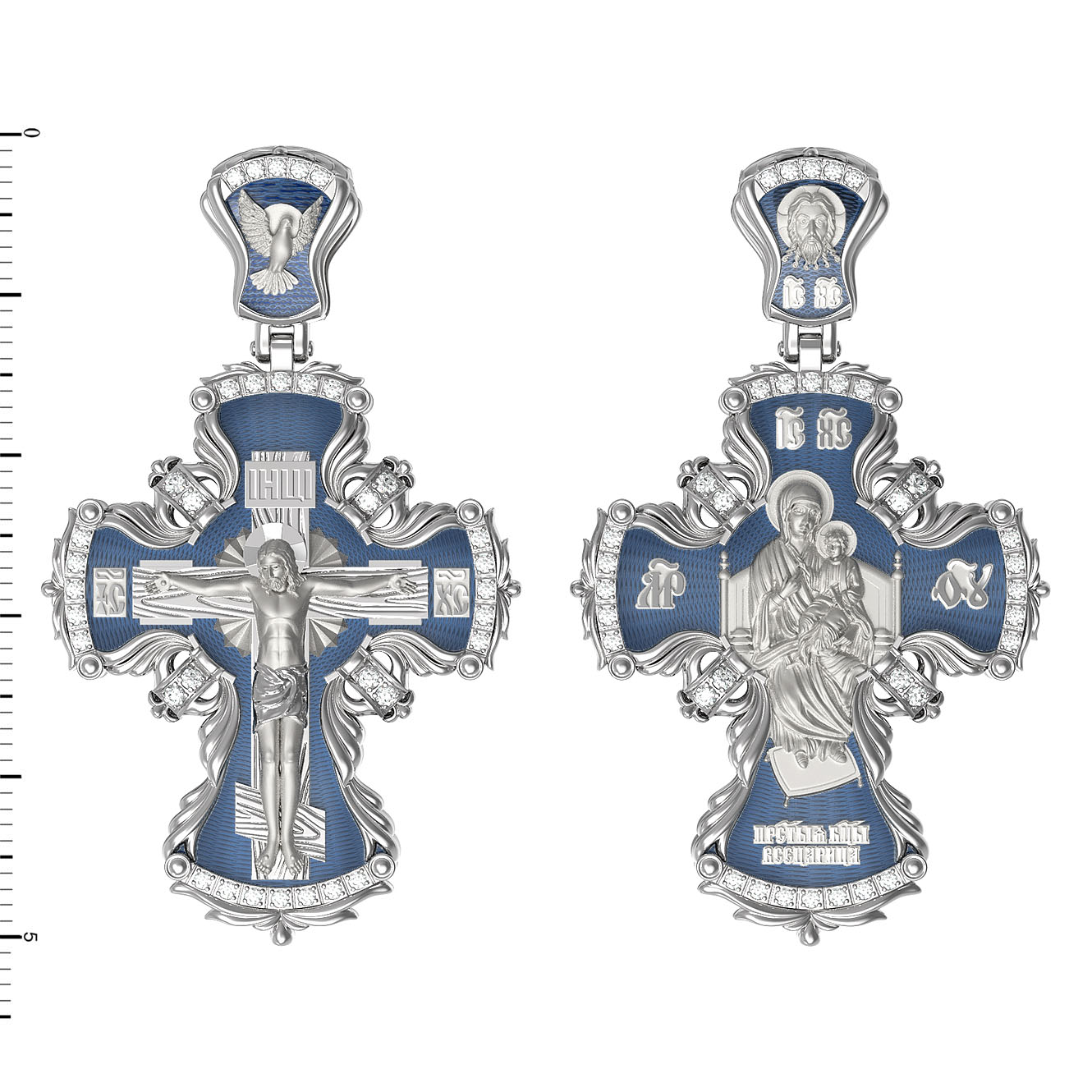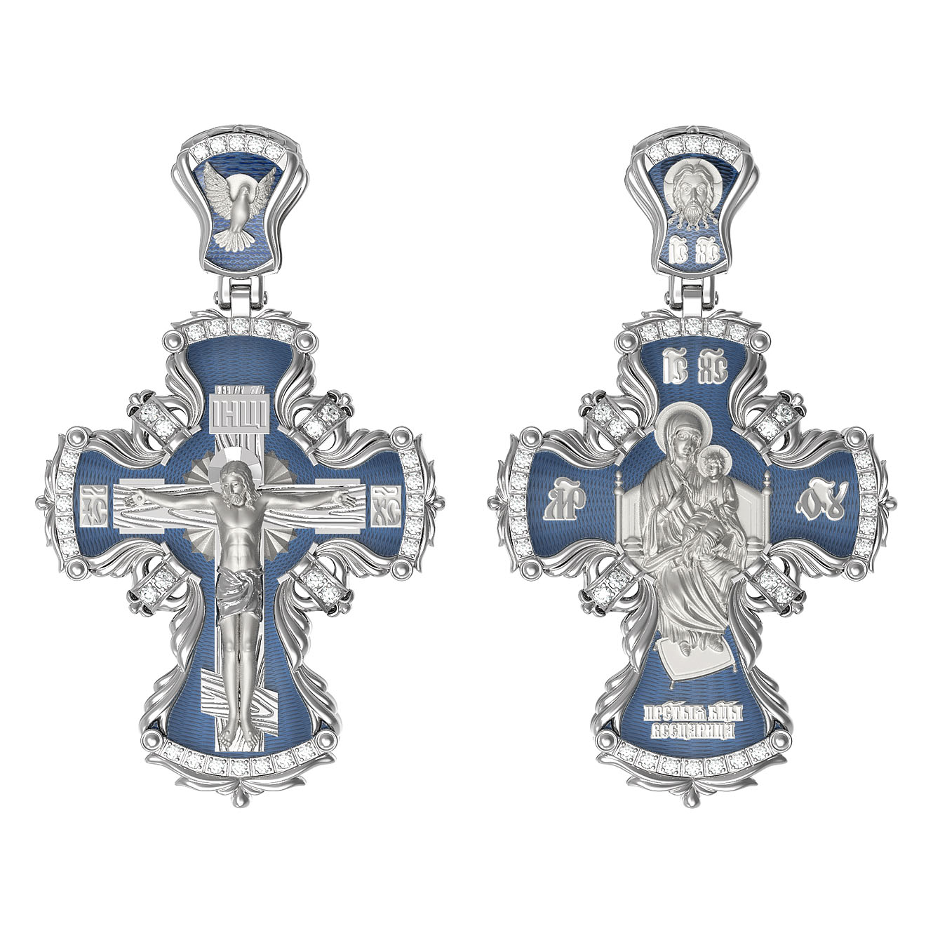 На лицевой стороне креста изображено Распятие Господа и Спасителя нашего Иисуса Христа, отдавшего Себя на смерть, чтобы другие могли жить — жить вечной жизнью, жить с Богом. Своею кровью Господь освятил крест и сделал его проводником Своей благодати, источником освящения верующих. На верхней табличке, выше головы Иисуса, расположена надпись, составленная Понтием Пилатом — «ИНЦИ». Она означает «Иисус Назорей, Царь Иудейский». Надпись «IС ХС» означает Иисус Христос помещается на разных сторонах поперечной (большой) перекладины креста. На кулонном кольце помещено изображение Духа Святого в виде голубя, сходящего с Небес.