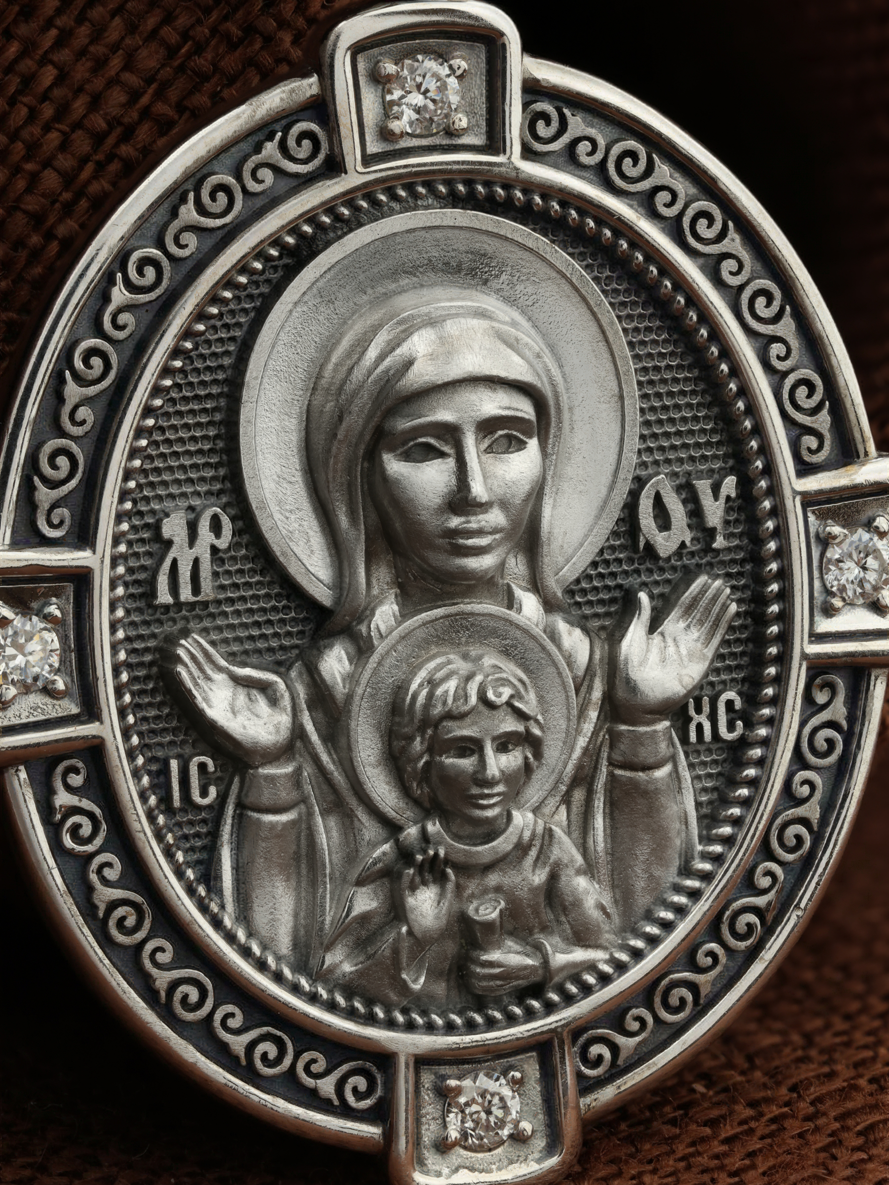 На кулонном кольце помещено изображение Спаса Нерукотворного — образ Спасителя, который Он запечатлел на плате и передал для исцеления больному проказой царю Эдессы. Ему придается победное и защитное значение.