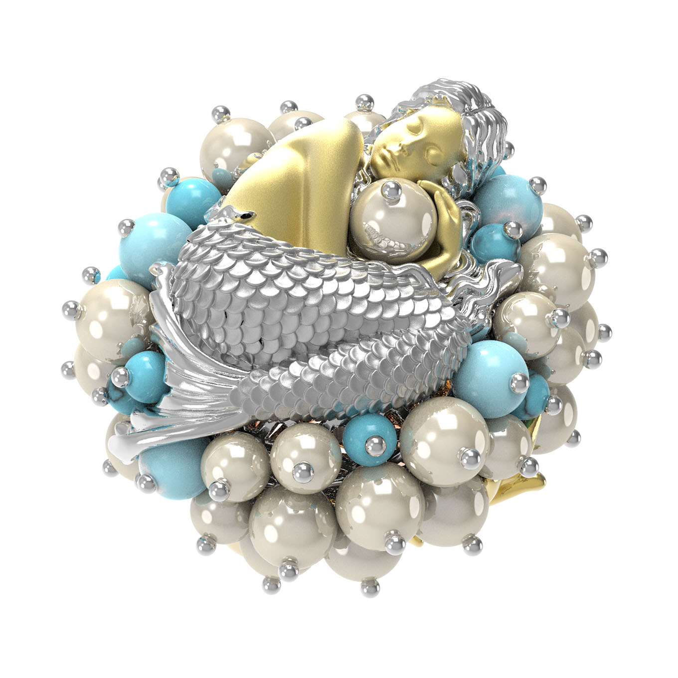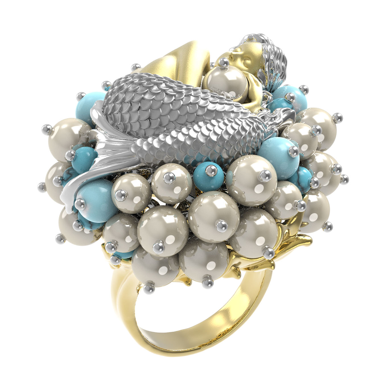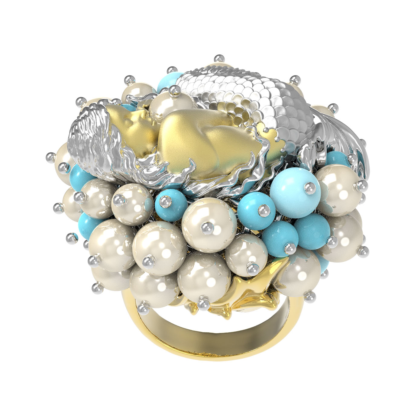 Кольцо из лимонного золота c жемчугом и бирюзой