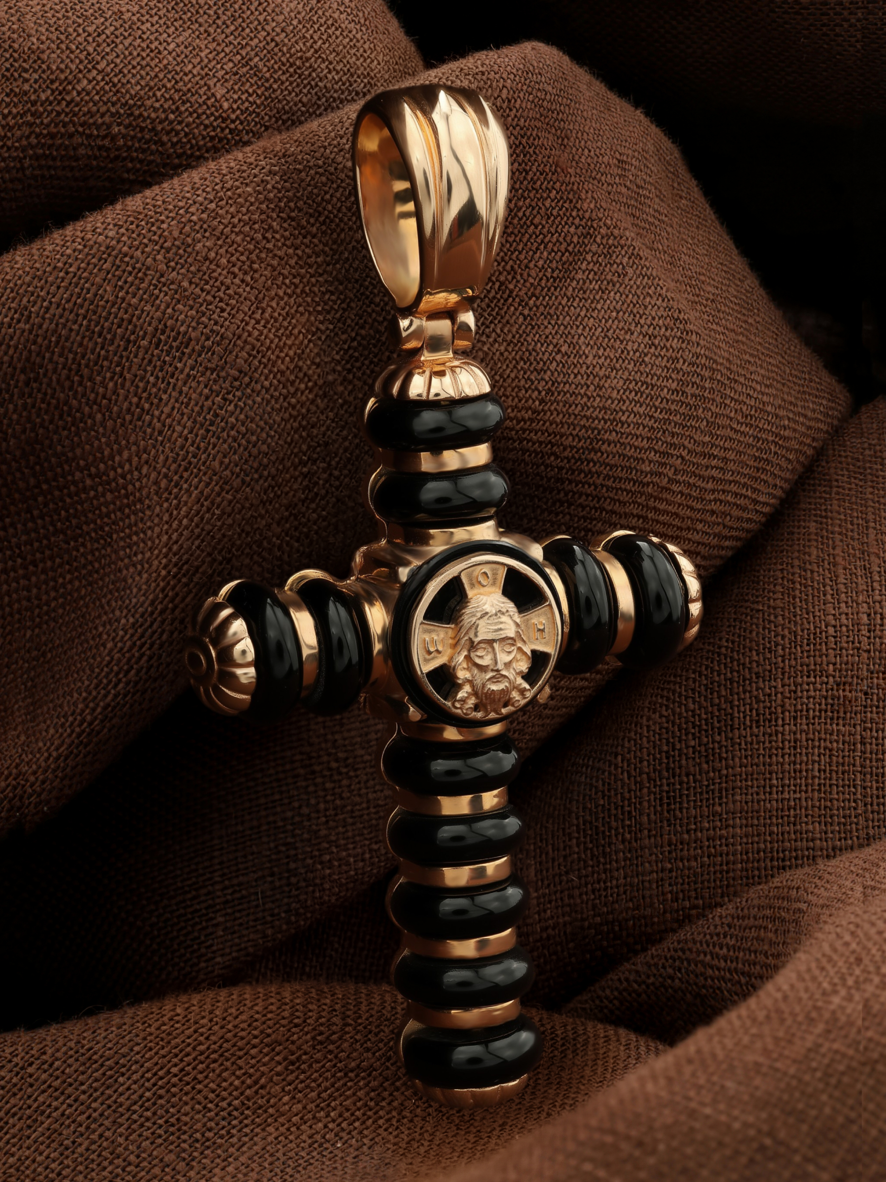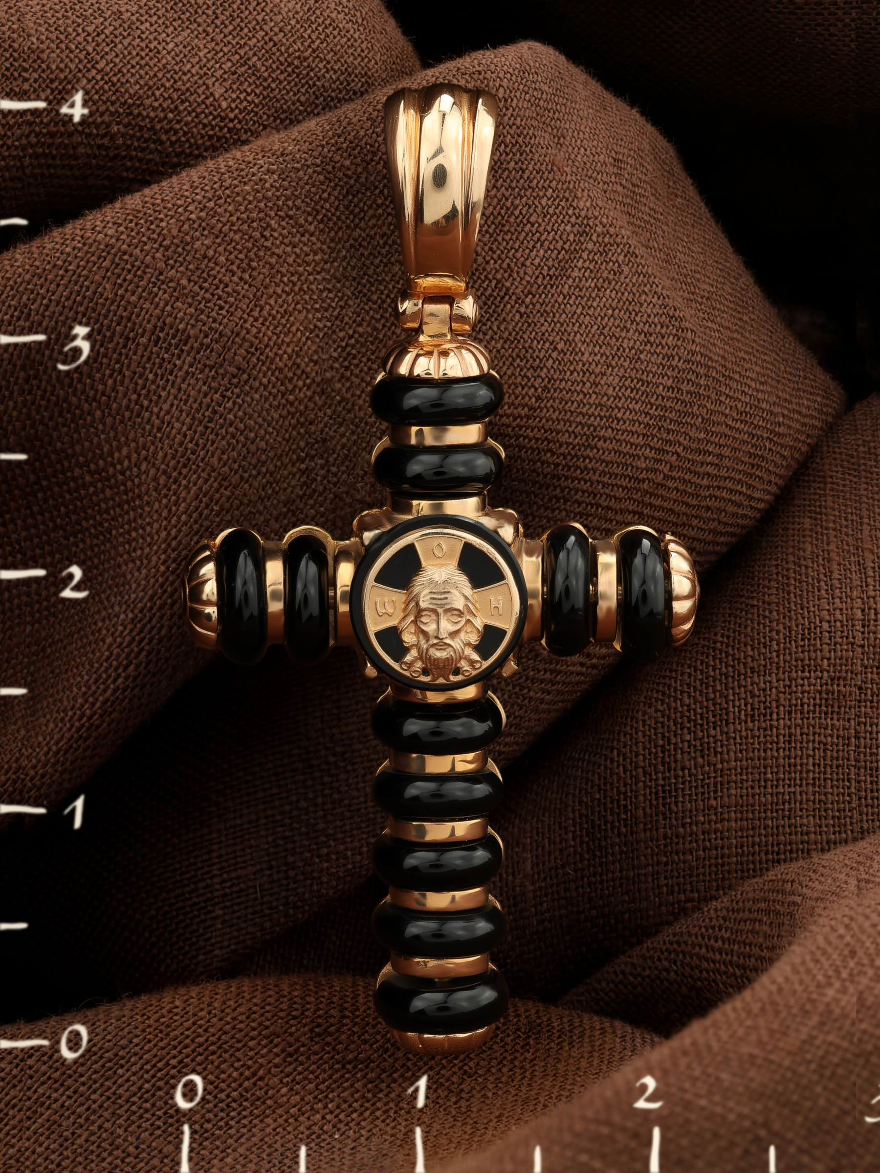 В центральной части лицевой стороны креста изображен Спас Нерукотворный — образ Господа и Спасителя нашего Иисуса Христа, чудесно отпечатавшийся на плате, котором Христос вытер свой лик. Согласно Преданию, изложенному в Четьи Минее, Авгарь V Ухама, больной проказой, послал ко Христу своего архивария Ханнана (Ананию) с письмо, в котором просил Христа прийти в Едессу и исцелить его. Ханнан же был художником, и Авгарь поручил ему, если Спаситель не сможет прийти, то написать хотя бы Его образ и принести ему. Видя, что Ханнан хочет сделать Его портрет, Христос потребовал воды, умылся, вытер Свой лик платом, и на этом плате отпечатался Его образ. Спаситель передал этот плат Ханнану с повелением отнести с ответным письмом пославшему его. Получив портрет, Авгарь исцелился от главного своего недуга, но лицо его оставалось еще поврежденным. После Пятидесятницы в Едессу пошёл святой апостол Фаддей, один из 70-ти, закончил исцеление Авгаря и обратил его в христианство. Авгарь прикрепил образ к доске и поместил в нише над городскими воротами, убрав оттуда находившегося там идола.