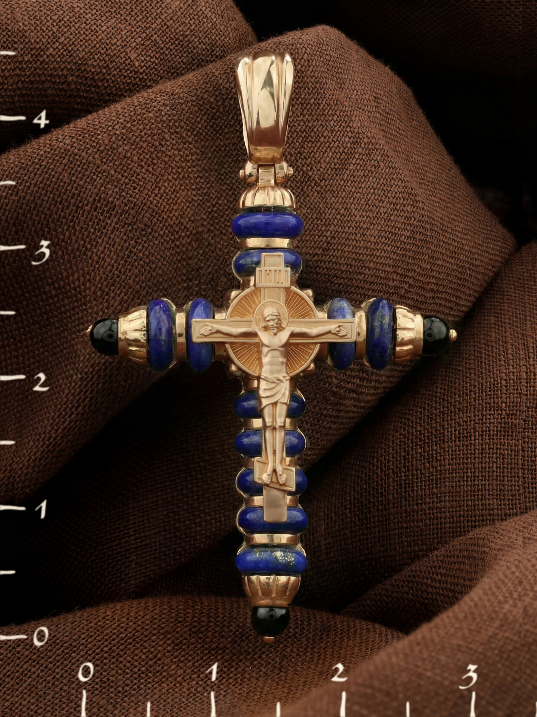 На лицевой стороне креста изображено Распятие Господа и Спасителя нашего Иисуса Христа, отдавшего Себя на смерть для искупления грехов мира. Крест является символом жертвенной любви Всеблагого Бога к падшим людям, всепобеждающим духовным оружием христиан, основанием и средоточием церковной жизни. Над вершиной Распятия помещена надпись «Царь Славы». На верхней перекладине расположена надпись «IНЦI». Она символизирует титло — табличку, на которой, согласно Евангелию, было начертано: Иисус Назорей, Царь Иудейский. Надпись «IC» «ХC»», означает Иисус Христос, помещаются на разных сторонах поперечной перекладины креста. Ниже помещена надпись «НИКА», что означает «победитель».
