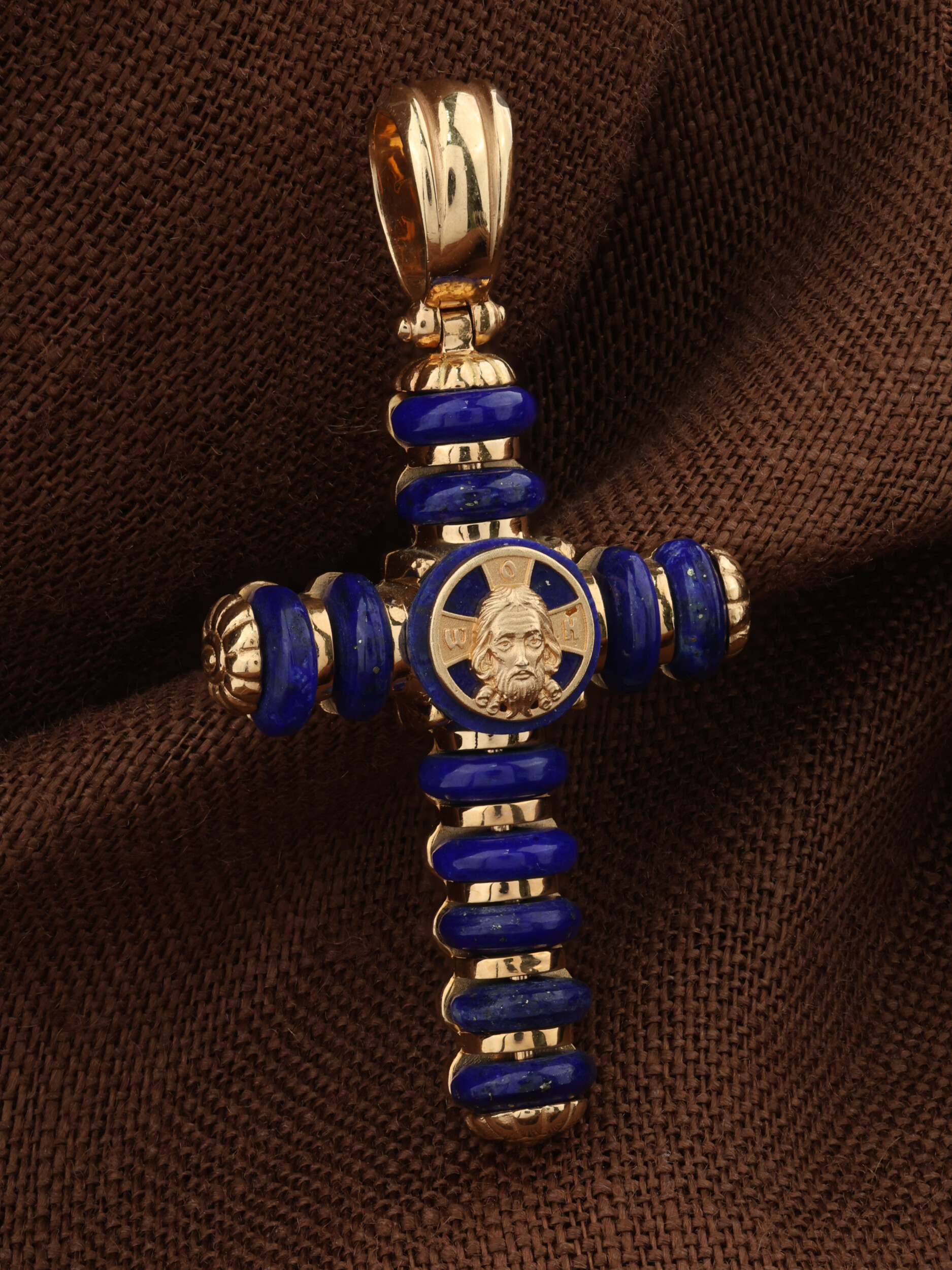 В центральной части лицевой стороны креста изображен Спас Нерукотворный — образ Господа и Спасителя нашего Иисуса Христа, чудесно отпечатавшийся на плате, котором Христос вытер свой лик. Согласно Преданию, изложенному в Четьи Минее, Авгарь V Ухама, больной проказой, послал ко Христу своего архивария Ханнана (Ананию) с письмо, в котором просил Христа прийти в Едессу и исцелить его. Ханнан же был художником, и Авгарь поручил ему, если Спаситель не сможет прийти, то написать хотя бы Его образ и принести ему. Видя, что Ханнан хочет сделать Его портрет, Христос потребовал воды, умылся, вытер Свой лик платом, и на этом плате отпечатался Его образ. Спаситель передал этот плат Ханнану с повелением отнести с ответным письмом пославшему его. Получив портрет, Авгарь исцелился от главного своего недуга, но лицо его оставалось еще поврежденным. После Пятидесятницы в Едессу пошёл святой апостол Фаддей, один из 70-ти, закончил исцеление Авгаря и обратил его в христианство. Авгарь прикрепил образ к доске и поместил в нише над городскими воротами, убрав оттуда находившегося там идола.