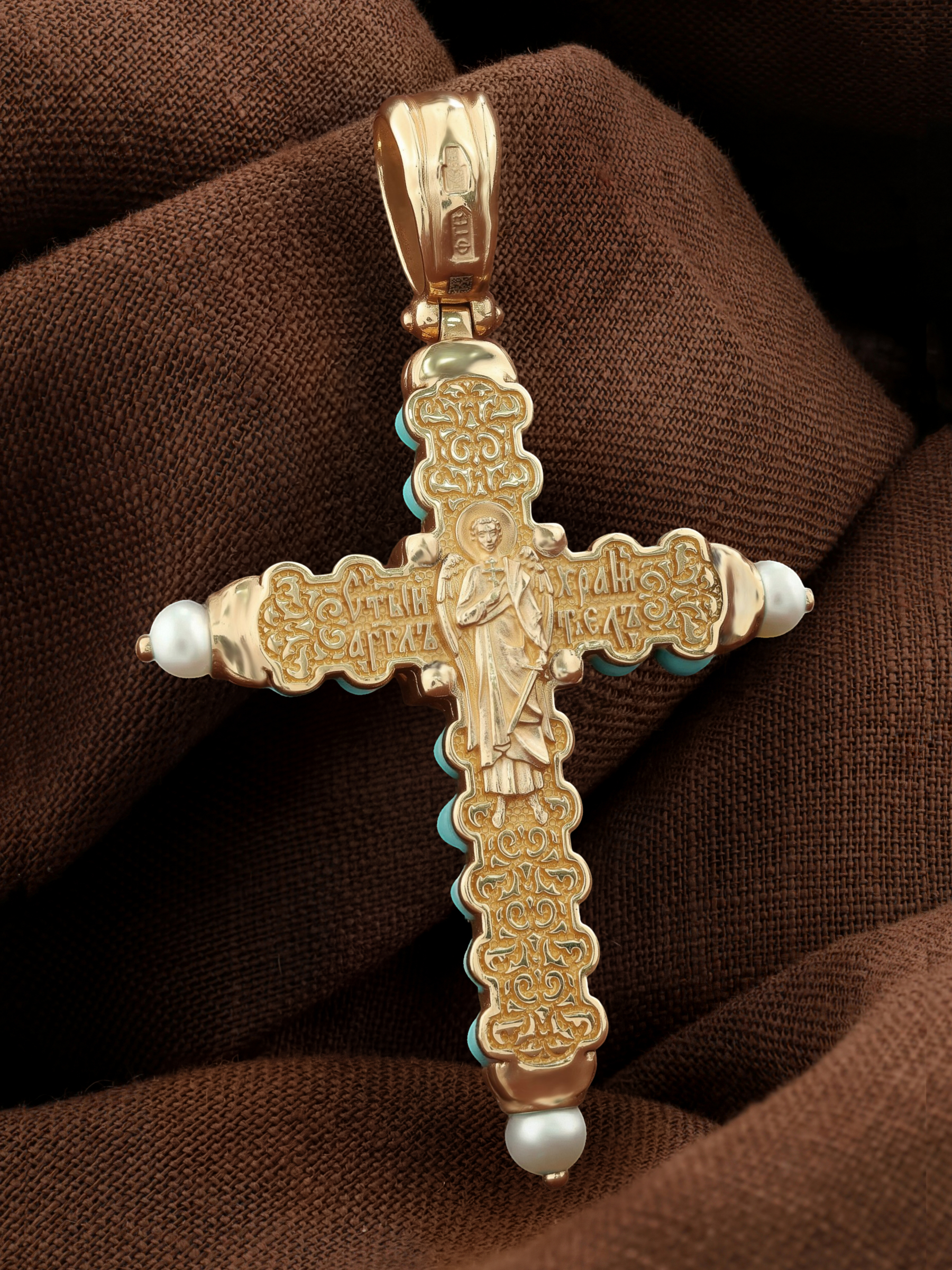 Крест из золота c жемчугом и бирюзой