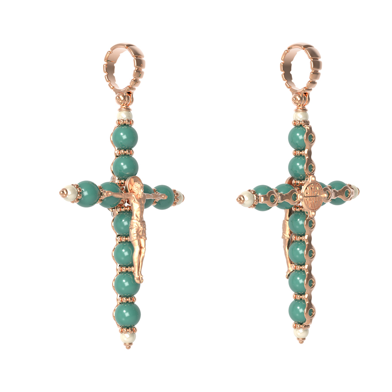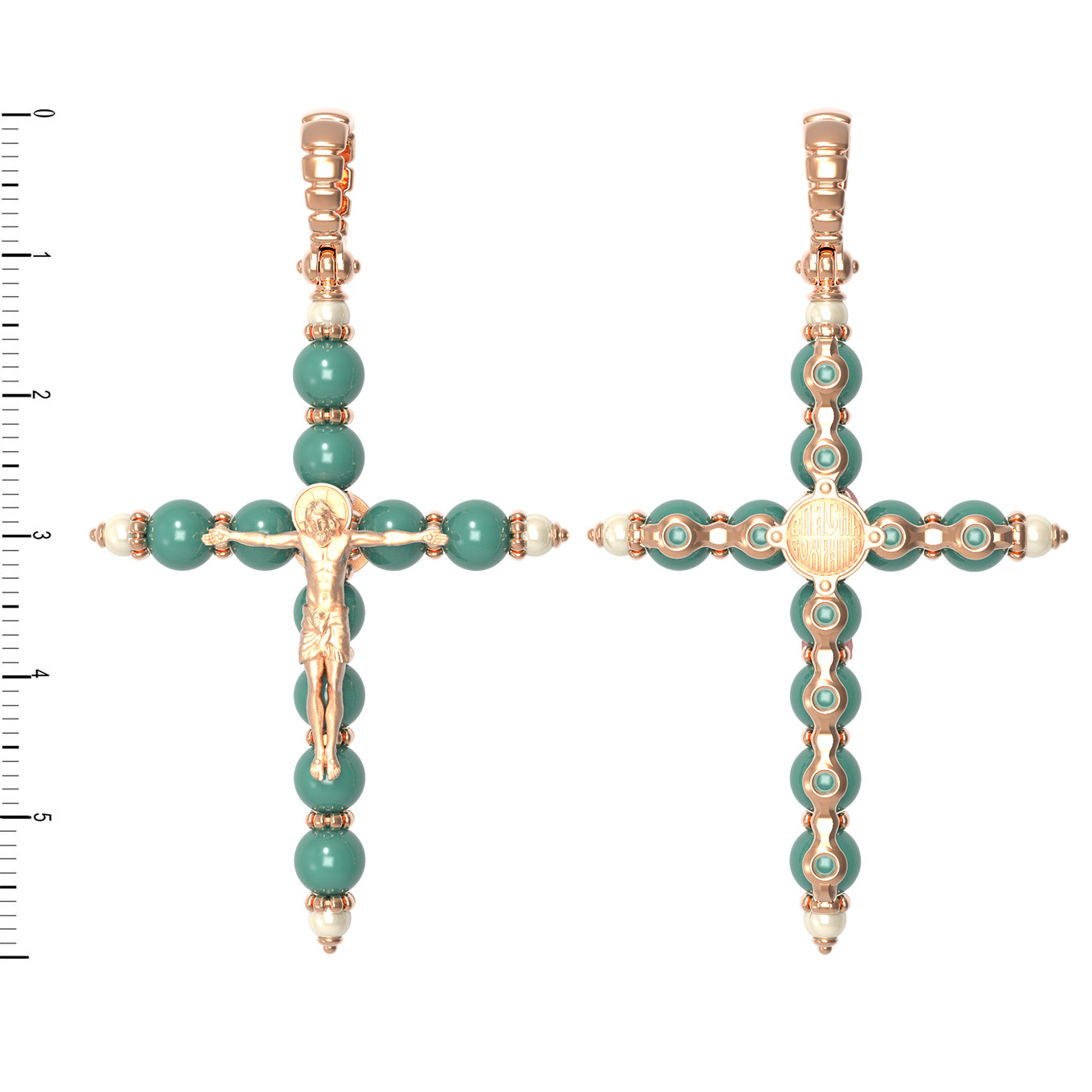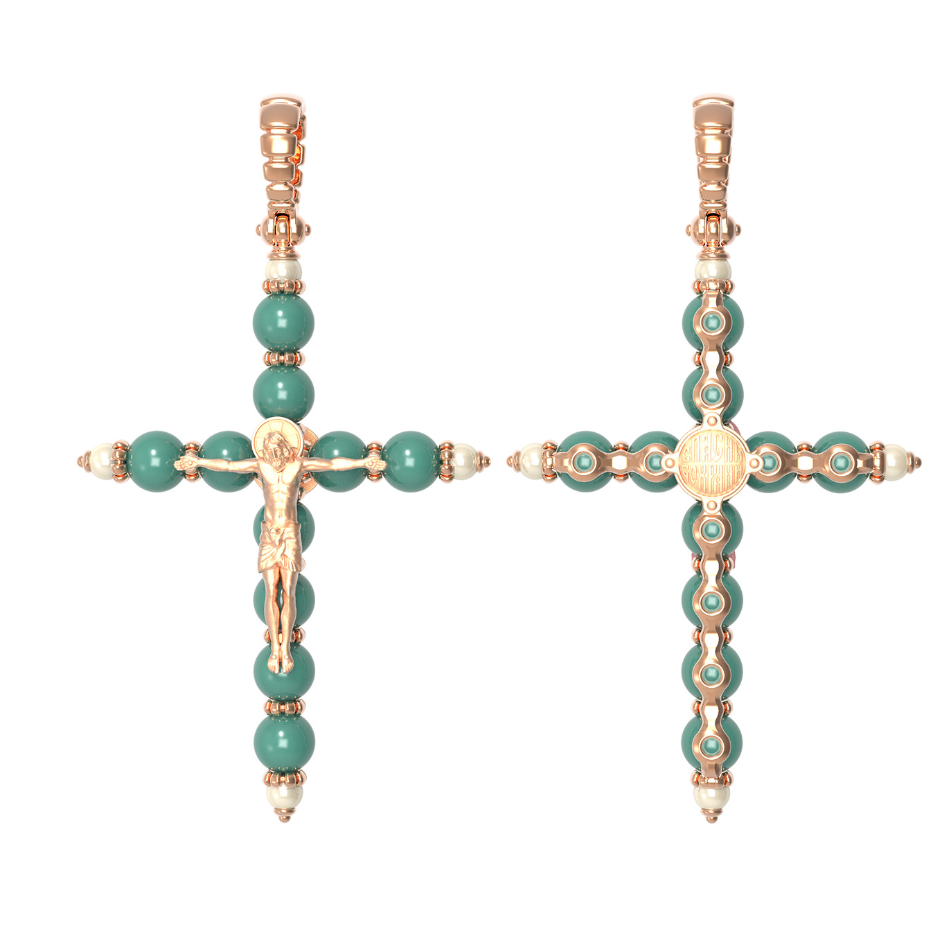 На лицевой стороне креста изображено Распятие Господа и Спасителя нашего Иисуса Христа. Своими крестными страданиями Господь смыл наши грехи, покрыл наш долг перед Богом или, на языке Писания, нас «искупил». В Голгофе сокрыта непостижимая тайна бесконечной правды и любви Бога. Крест стал символом победы добра над злом, жизни над смертью, напоминанием бесконечной Божьей любви, предметом радости. Воплотившийся Сын Божий Своею кровью освятил крест и сделал его проводником Своей благодати, источником освящения верующих. На верхней табличке, выше головы Иисуса, расположена надпись, составленная Понтием Пилатом — «IНЦI». Она означает «Иисус Назорей, Царь Иудейский». Надпись «IC» «ХC», означает Иисус Христос, помещаются на разных сторонах поперечной перекладины креста. Христос в Своей Божественной любви, над которой смерть не властна и которая, страдая, и не страдает в обычном смысле, простирает к людям со Креста Свои объятия, в которые призывается и привлекается весь мир. Поэтому Тело Его не висит, а торжественно покоится на Кресте.