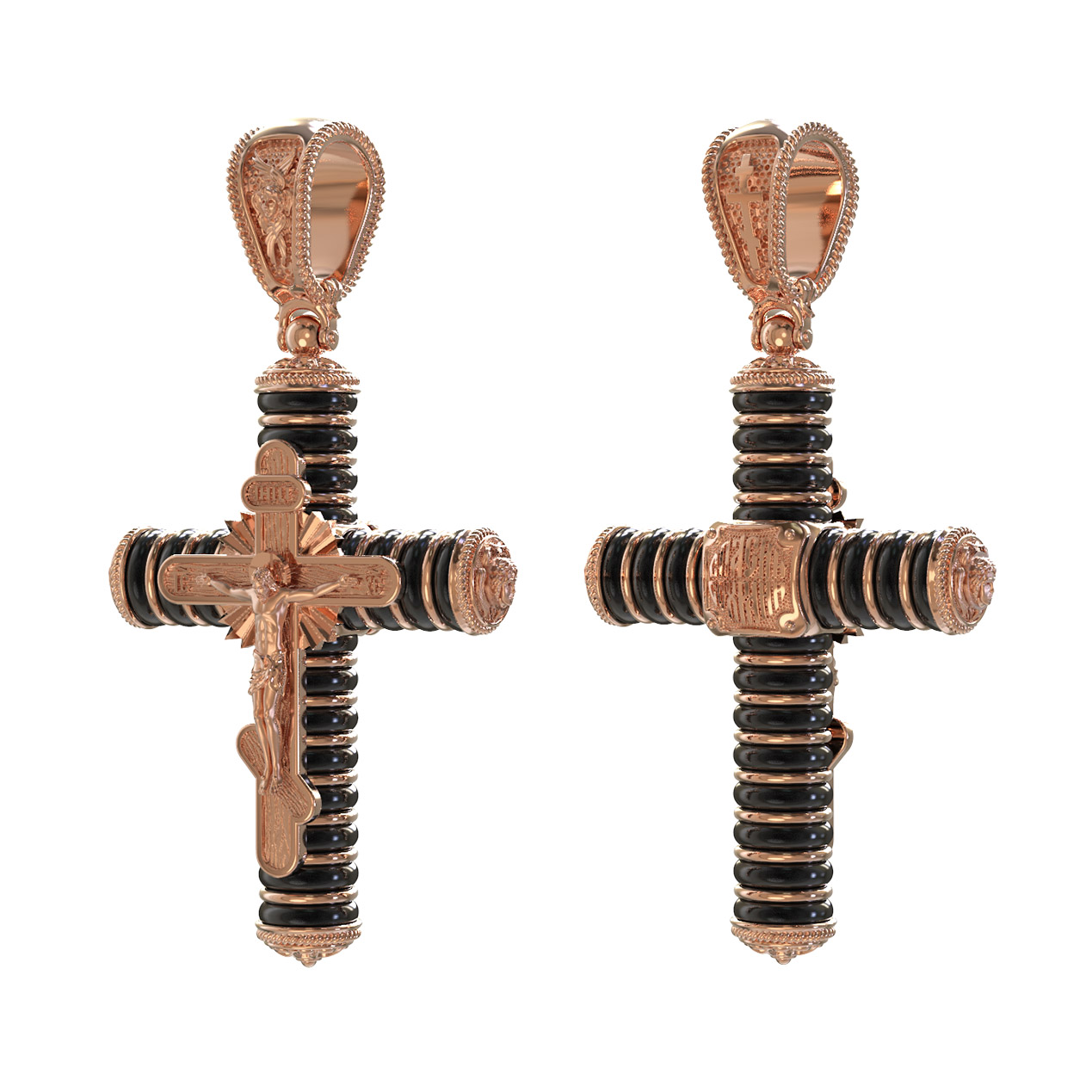 На лицевой стороне креста изображено Распятие Господа и Спасителя нашего Иисуса Христа. Своими крестными страданиями Господь смыл наши грехи, покрыл наш долг перед Богом или, на языке Писания, нас «искупил». В Голгофе сокрыта непостижимая тайна бесконечной правды и любви Бога. Крест стал символом победы добра над злом, жизни над смертью, напоминанием бесконечной Божьей любви, предметом радости. Воплотившийся Сын Божий Своею кровью освятил крест и сделал его проводником Своей благодати, источником освящения верующих. На верхней табличке, выше головы Иисуса, расположена надпись, составленная Понтием Пилатом — «IНЦI». Она означает «Иисус Назорей, Царь Иудейский». Надпись «IC» «ХC», означает Иисус Христос, помещаются на разных сторонах поперечной перекладины креста. Христос в Своей Божественной любви, над которой смерть не властна и которая, страдая, и не страдает в обычном смысле, простирает к людям со Креста Свои объятия, в которые призывается и привлекается весь мир. Поэтому Тело Его не висит, а торжественно покоится на Кресте. На кулонном кольце изображен шестикрылый Серафим. Серафим означает «Пламенный». Горя любовью к Богу, он зажигает огонь этой любви и в сердцах людей.
