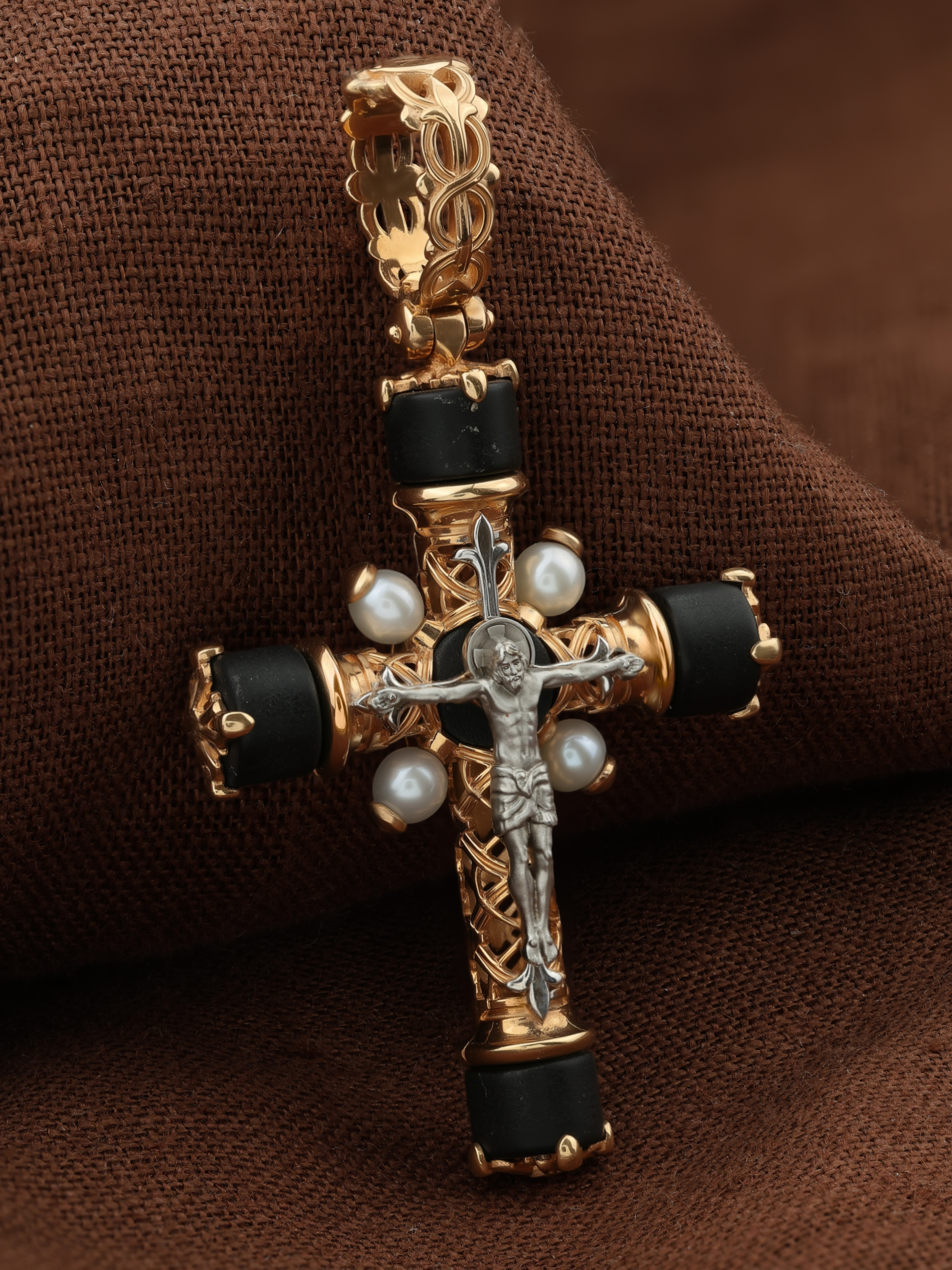 На лицевой стороне креста изображено Распятие Господа и Спасителя нашего Иисуса Христа. Своими крестными страданиями Господь смыл наши грехи, покрыл наш долг перед Богом или, на языке Писания, нас «искупил». В Голгофе сокрыта непостижимая тайна бесконечной правды и любви Бога. Крест стал символом победы добра над злом, жизни над смертью, напоминанием бесконечной Божьей любви, предметом радости. Воплотившийся Сын Божий Своею кровью освятил крест и сделал его проводником Своей благодати, источником освящения верующих. Господь сказал: кто хочет идти за Мною, отвергнись себя, и возьми крест свой, и следуй за Мною. (Мк. 8: 34). На православном кресте Христос не умирает, а свободно простирает руки, ладони Иисуса открыты, будто он хочет обнять все человечество, даря им свою любовь и открывая путь к вечной жизни.