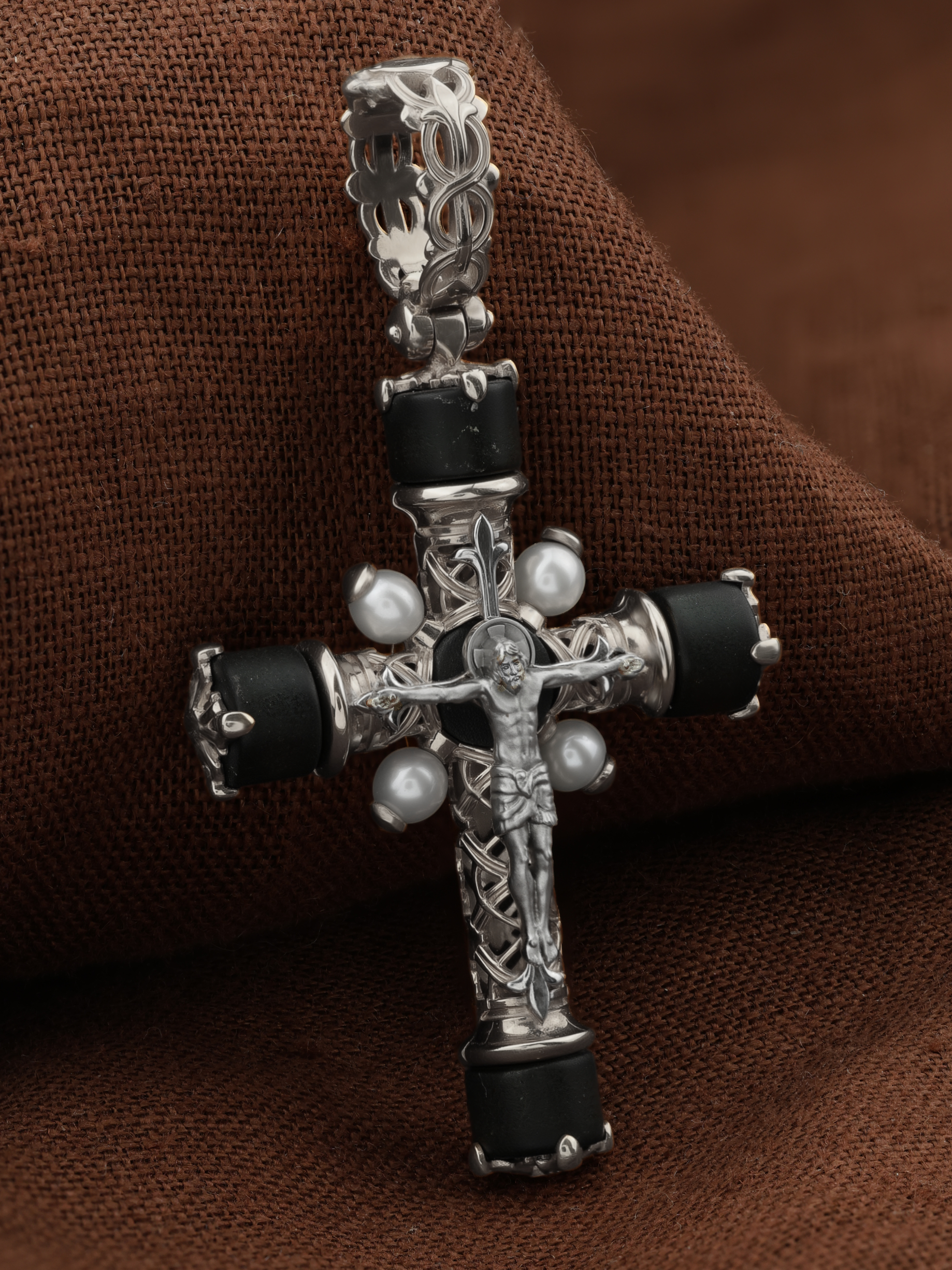 Крест из белого золота c жемчугом и ониксом