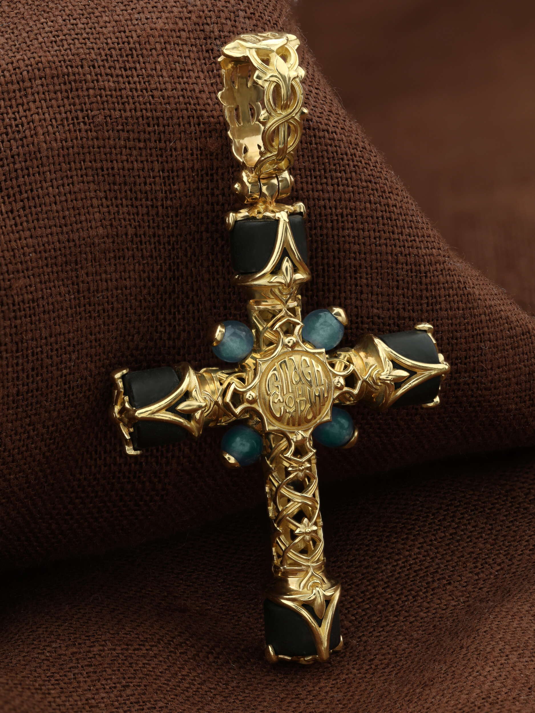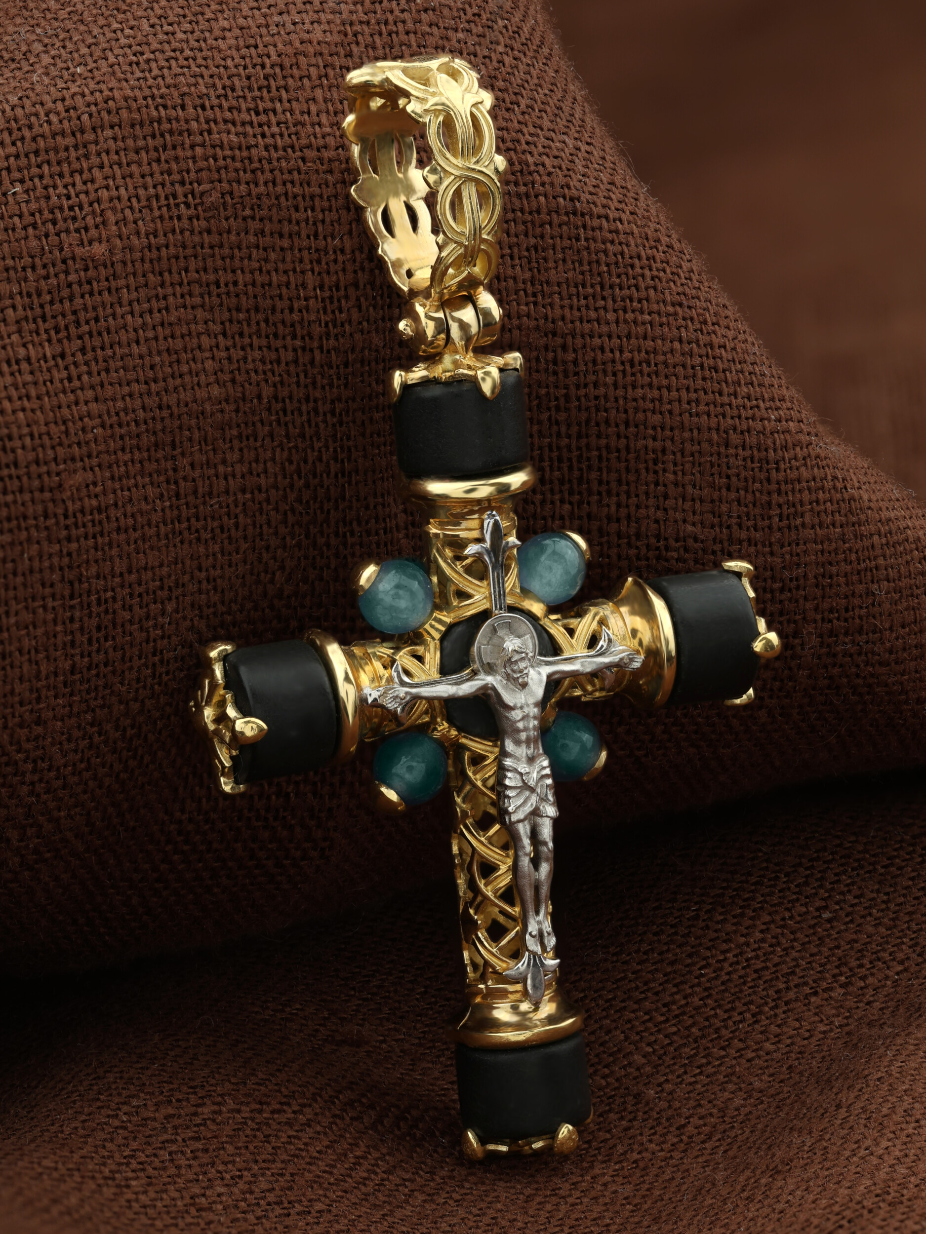 Крест из лимонного золота c ониксом и жадеитом