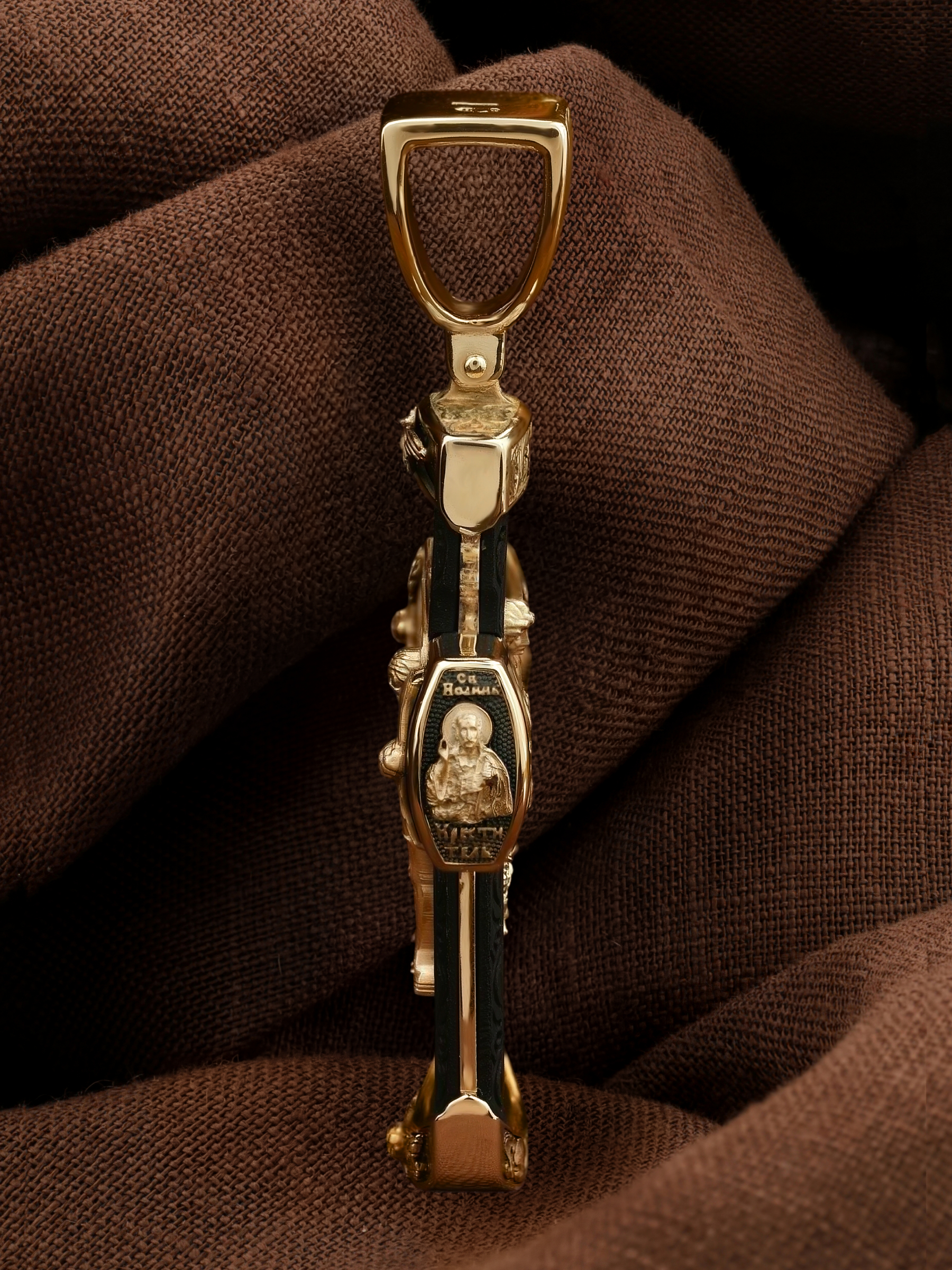 На торце изделия с левой стороны помещена икона Святого Николая Чудотворца — самый почитаемый в Православной Церкви, которого еще называют Николай Угодник за то, что он угодил своей жизнью Богу. Николай Чудотворец, помощник в делах, покровитель учащихся, утешитель обиженных и нуждающихся, целитель самых страшных и тяжелых недугов, предстатель и молитвенник за людей перед Богом. Также Святитель Николай Чудотворец известен своими молитвами за путешественников, когда непрестанный ветер и бушующие волны утихают и корабль заходит в спокойную гавань. На торце изделия с правой стороны — икона Святого Иоанна Крестителя. Святой Иоанн был последним пророком Израиля. Он призывал к покаянию, предвозвещая приближение Царствия Небесного (Мф. 3, 2), и удостоился стать Крестителем Христа. Иисус Христос говорит о нем: «Сей есть о котором написано: «Вот, Я посылаю Ангела Моего пред лицем Твоим, который приготовит путь Твой пред Тобою» (Лк. 7, 27). И еще: «Из рожденных женами нет ни одного пророка больше Иоанна Крестителя» (Лк. 7, 28).