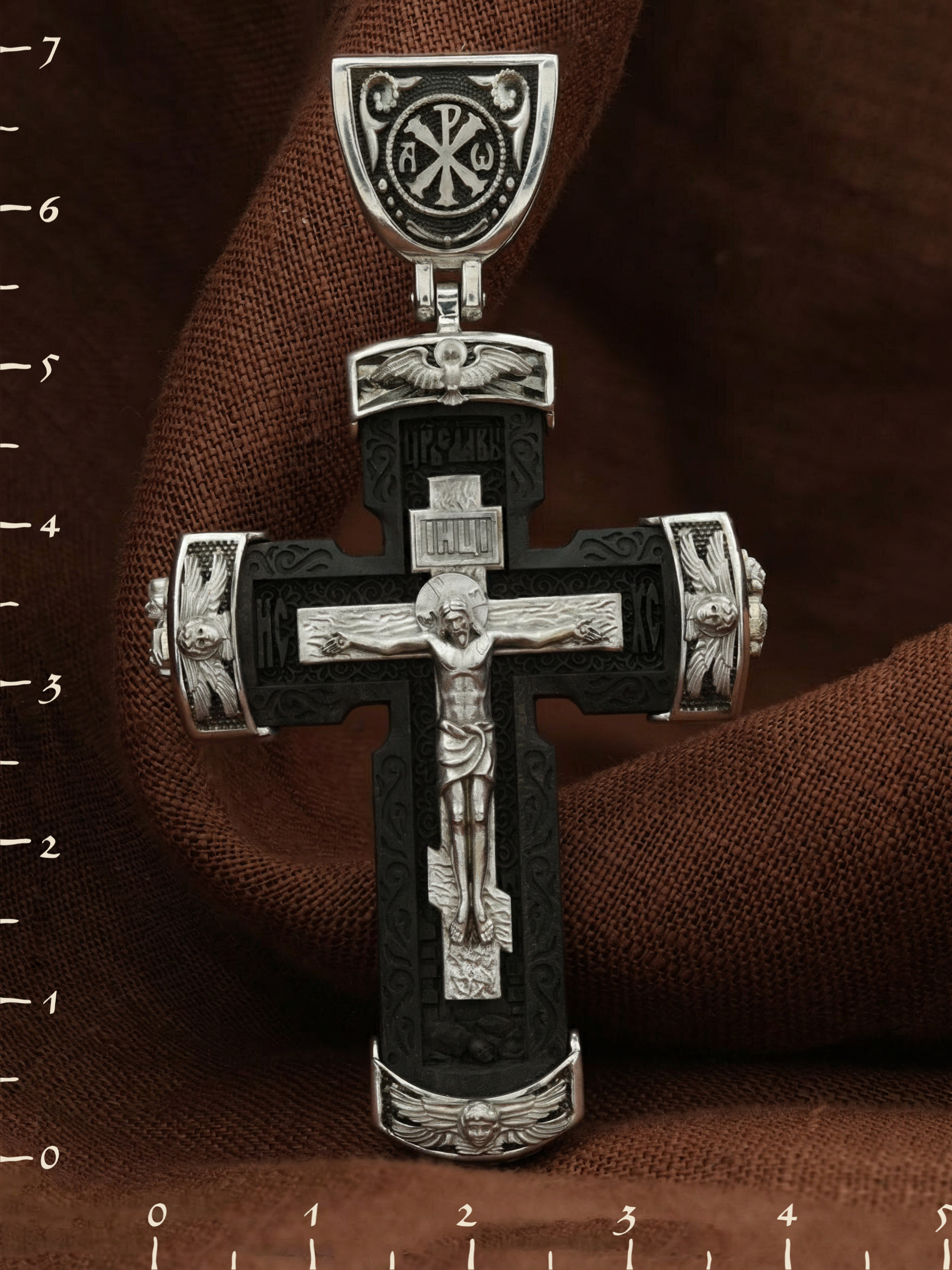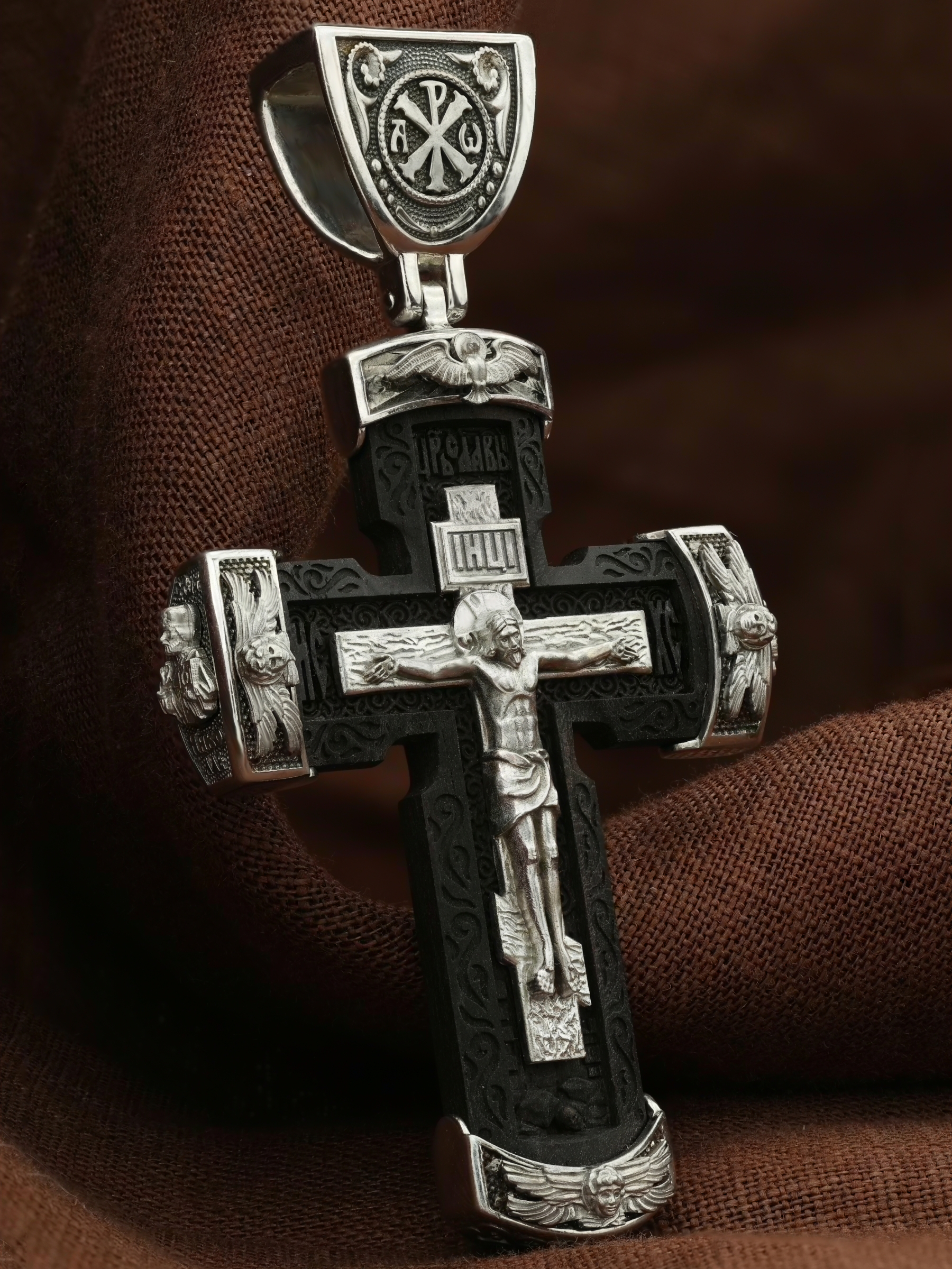 На лицевой стороне креста изображено Распятие, потому что это орудие казни Иисус Христос сделал орудием победы над грехом и смертью. Своими страданиями Он искупил грехи человечества, умерев и сошествовав во ад, победил сатану, освободил души праведников от вечной смерти и открыл им небесные врата рая. Жертва Христа сделала возможным спасение для каждого человека. На православном кресте Христос не умирает, а свободно простирает руки, ладони Иисуса открыты, будто он хочет обнять все человечество, даря им свою любовь и открывая путь к вечной жизни.