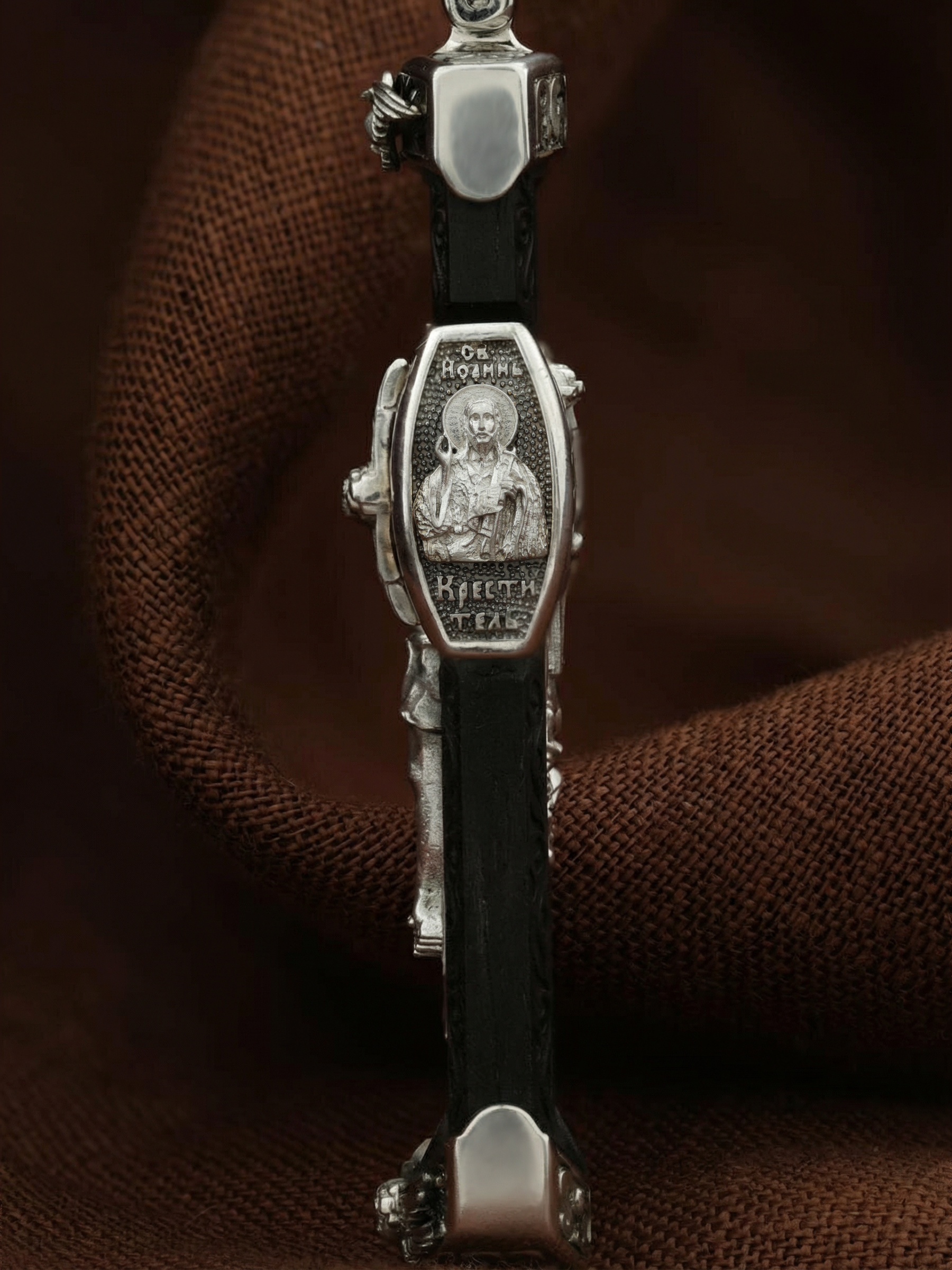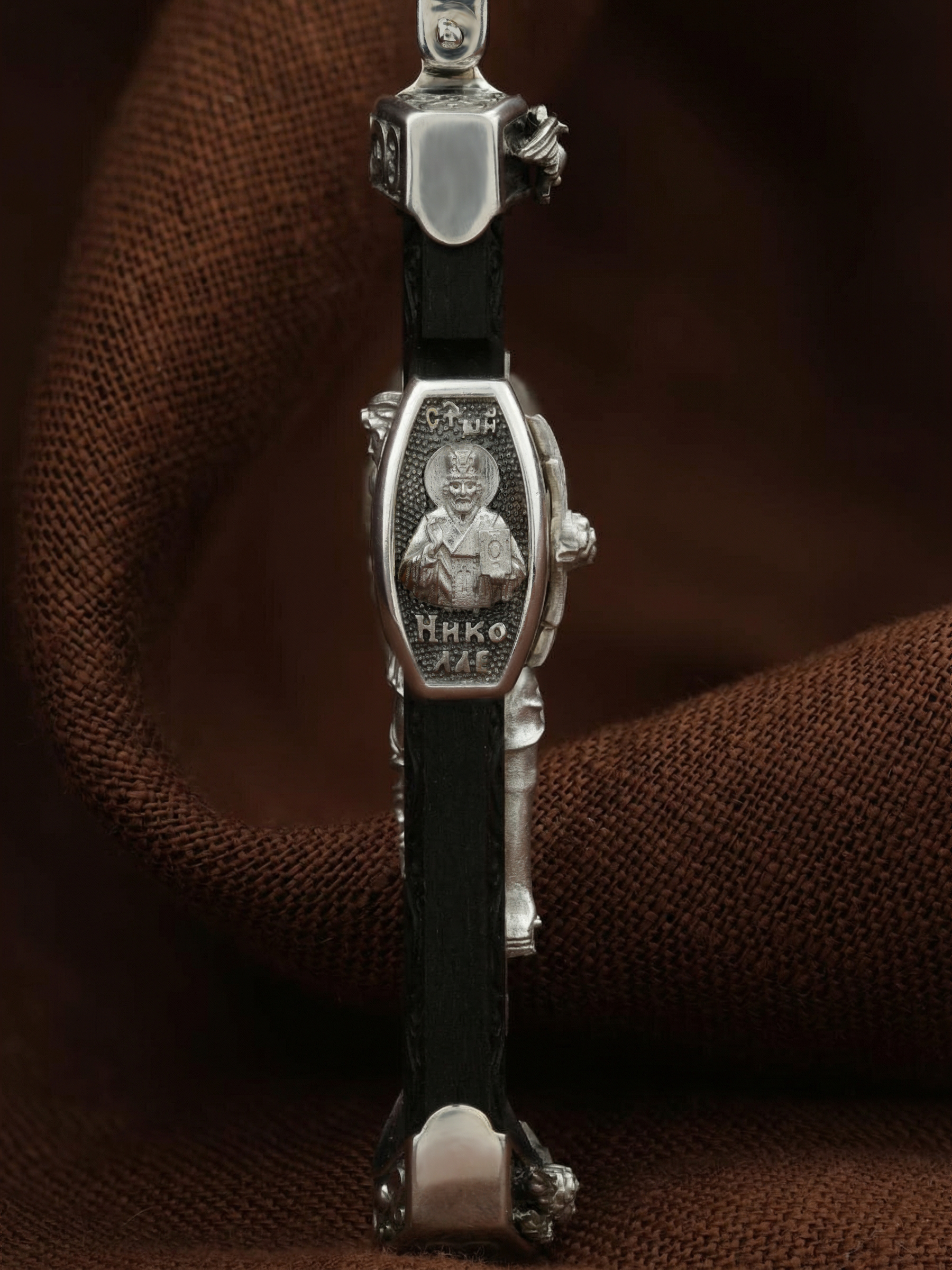 На торце изделия с левой стороны помещена икона Святого Николая Чудотворца — самый почитаемый в Православной Церкви, которого еще называют Николай Угодник за то, что он угодил своей жизнью Богу. Николай Чудотворец, помощник в делах, покровитель учащихся, утешитель обиженных и нуждающихся, целитель самых страшных и тяжелых недугов, предстатель и молитвенник за людей перед Богом. Также Святитель Николай Чудотворец известен своими молитвами за путешественников, когда непрестанный ветер и бушующие волны утихают и корабль заходит в спокойную гавань. На торце изделия с правой стороны — икона Святого Иоанна Крестителя. Святой Иоанн был последним пророком Израиля. Он призывал к покаянию, предвозвещая приближение Царствия Небесного (Мф. 3, 2), и удостоился стать Крестителем Христа. Иисус Христос говорит о нем: «Сей есть о котором написано: «Вот, Я посылаю Ангела Моего пред лицем Твоим, который приготовит путь Твой пред Тобою» (Лк. 7, 27). И еще: «Из рожденных женами нет ни одного пророка больше Иоанна Крестителя» (Лк. 7, 28).