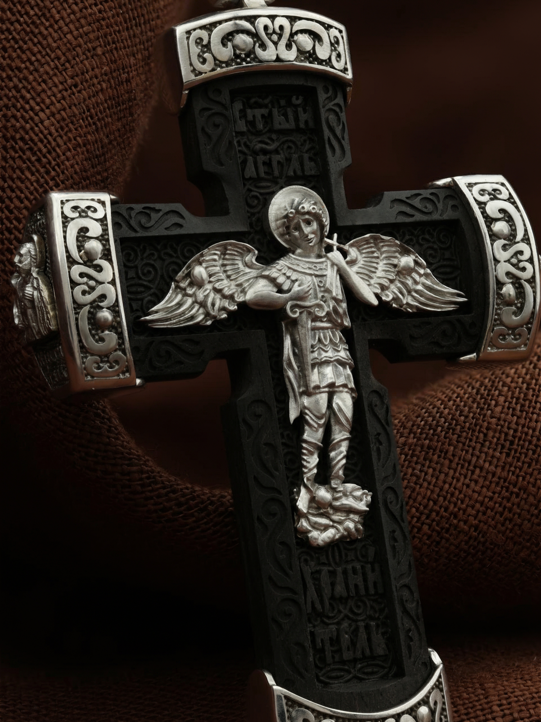 В центре оборота креста изображен Ангела Хранителя с традиционными атрибутами в руках: крестом, которым он осеняет человека, и мечом для прогнания бесов. По Православному учению, каждому, принявшему святое крещение, дается Господом Ангел Хранитель, который сопровождает человека всю его жизнь, помогая в добрых делах и охраняя от нападок злых духов. Святые отцы утверждают, что только верующий человек имеет рядом с собой Ангела Хранителя: «Тем, которые сподобились крещения и возносятся на высоту добродетелей, даны от Бога Ангелы, заботящиеся о них и содействующие им. В этом уверяет нас Господь, когда говорит, что есть Ангелы Хранители у всякого, кто верует в Него» (преп. Анастасий Синаит). Но Ангел Хранитель пребывает с христианином, если только мы не прогоним его греховными делами, поскольку «как дым разгоняет пчел, так и грех прогоняет от нас Ангела Хранителя» (свт. Василий Великий). Но и после завершения земного пути Ангел Хранитель не покидает христианина, а помогает душе преодолеть воздушные мытарства на пути в Царство Небесное.