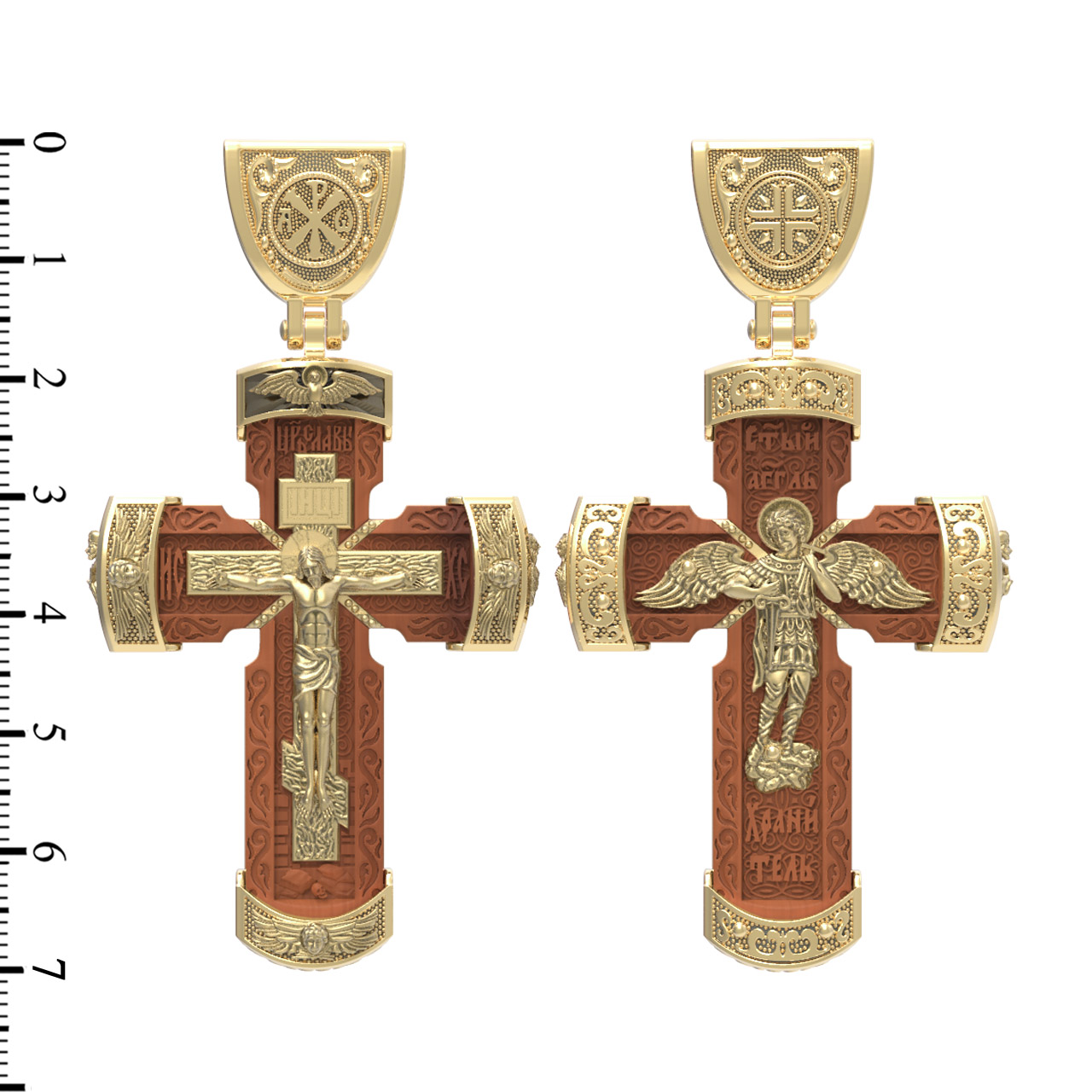 В центре оборота креста изображен Ангела Хранителя с традиционными атрибутами в руках: крестом, которым он осеняет человека, и мечом для прогнания бесов. По Православному учению, каждому, принявшему святое крещение, дается Господом Ангел Хранитель, который сопровождает человека всю его жизнь, помогая в добрых делах и охраняя от нападок злых духов. Святые отцы утверждают, что только верующий человек имеет рядом с собой Ангела Хранителя: «Тем, которые сподобились крещения и возносятся на высоту добродетелей, даны от Бога Ангелы, заботящиеся о них и содействующие им. В этом уверяет нас Господь, когда говорит, что есть Ангелы Хранители у всякого, кто верует в Него» (преп. Анастасий Синаит). Но Ангел Хранитель пребывает с христианином, если только мы не прогоним его греховными делами, поскольку «как дым разгоняет пчел, так и грех прогоняет от нас Ангела Хранителя» (свт. Василий Великий). Но и после завершения земного пути Ангел Хранитель не покидает христианина, а помогает душе преодолеть воздушные мытарства на пути в Царство Небесное.