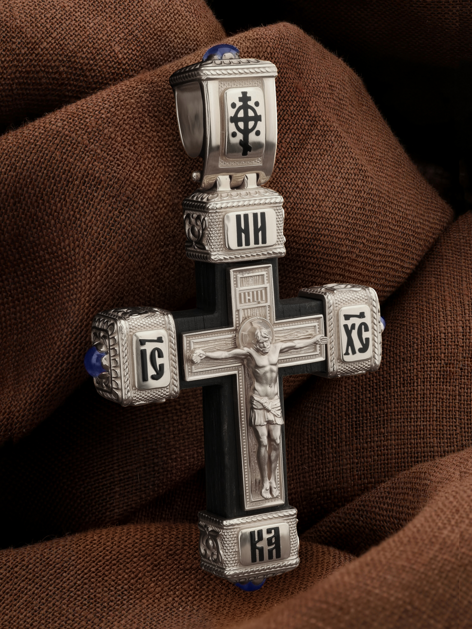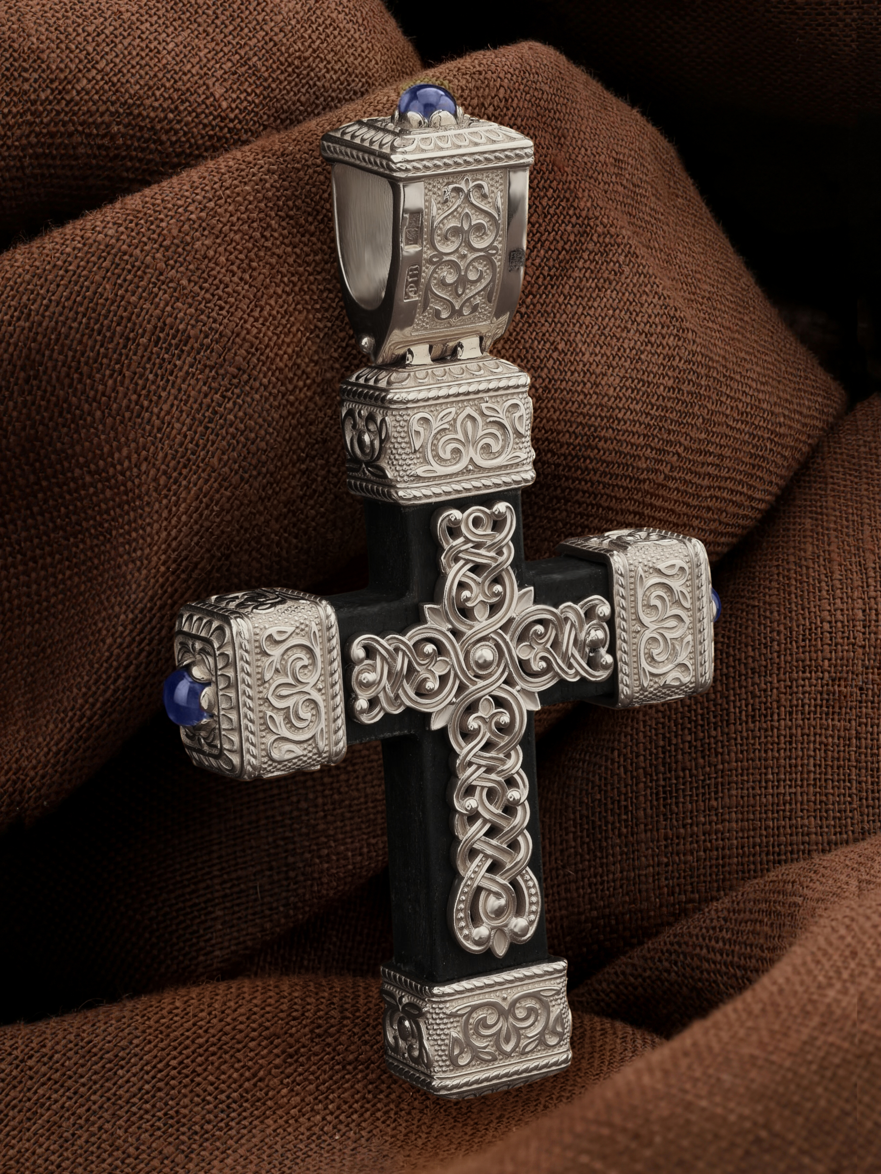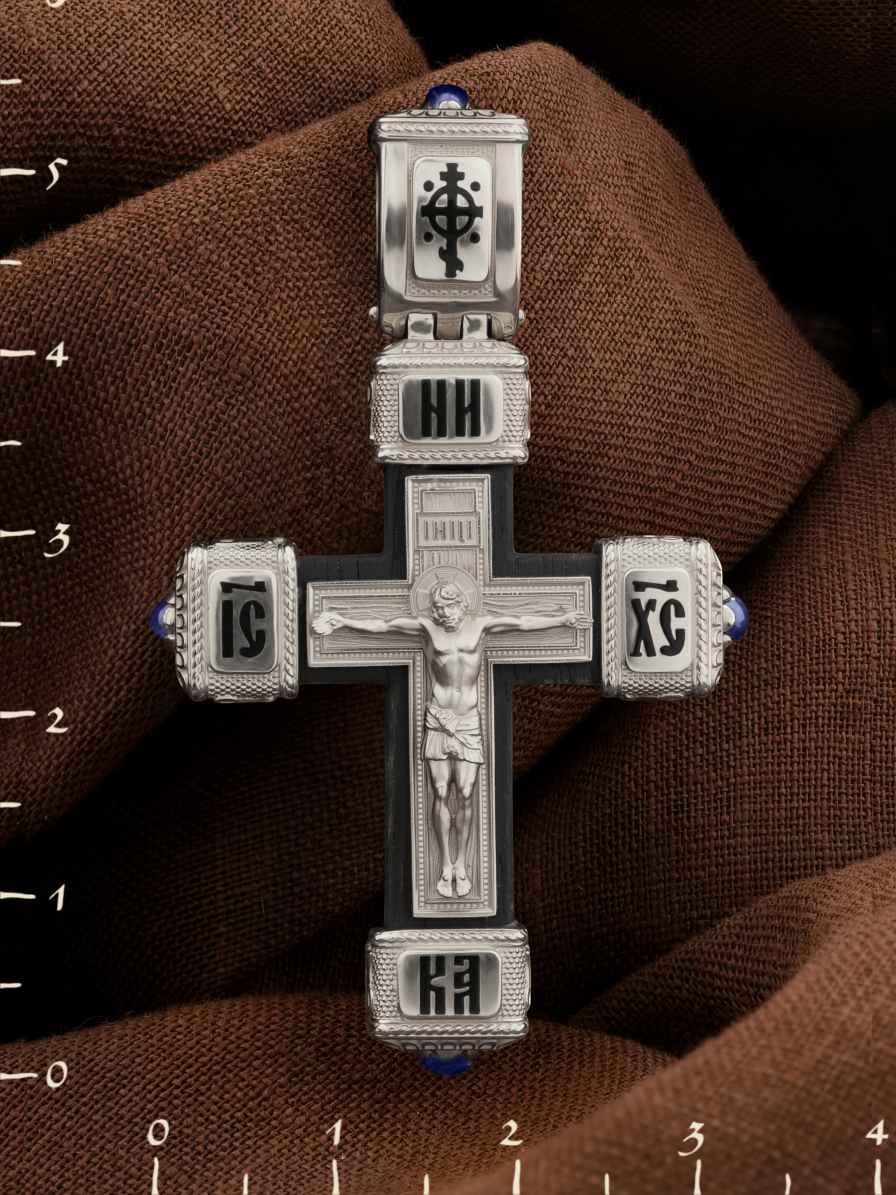 Крест из белого золота c эмаль, сапфиром и эбеновым деревом