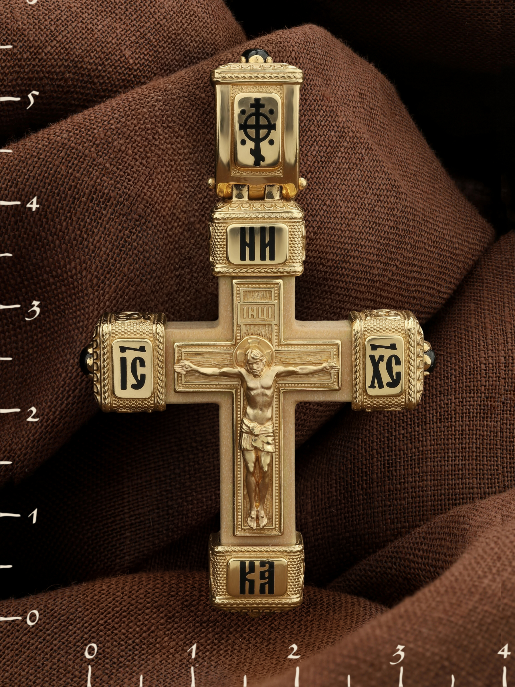 На лицевой стороне креста изображено Распятие Господа и Спасителя нашего Иисуса Христа. Крест- символ спасения и искупления рода человеческого, знамение победы над смертью и адом. Иисус Христос, как искупительная жертва освобождения человечества от власти греха, умер крестной смертью и в третий день воскрес. На верхней табличке, выше головы Иисуса, расположена надпись, составленная Понтием Пилатом — «ИНЦИ». Она означает «Иисус Назорей, Царь Иудейский». Надпись «IС ХС» означает Иисус Христос помещается на разных сторонах поперечной перекладины креста. Надпись –«НИКА» означает победитель. На кулонном кольце помещен крест «терновый венец». Этот крест имеет форму восьмиконечного креста, вторая перекладина которого в центре обведена кругом с остриями по краю, символизирующими терновый венец. «Воины, сплетши венец из терна, возложили ему на голову, — говорится в Евангелии, — и ранами Его мы исцелились» (Ис. 53, 5). Вот почему терновый венок стал для христиан символом победы и награды, «венцом правды» (2 Тим. 4, 8), «венцом славы» (1 Пет. 5, 4), «венцом жизни» (Иак. 1, 12;.Апок. 2, 10).