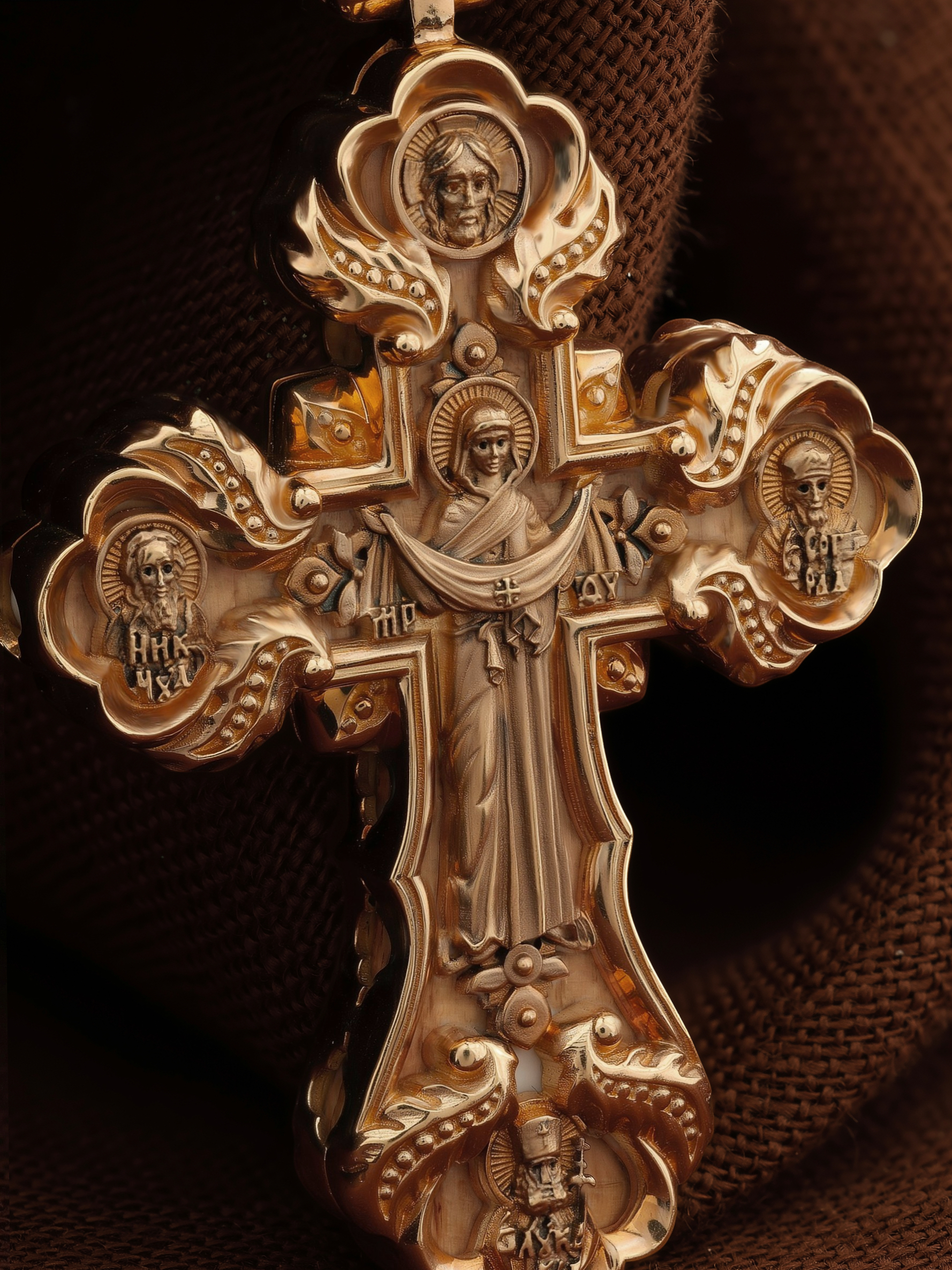 Центральную часть оборотной стороны креста украшает икона «Покров Пресвятой Богородицы». В руках Божьей Матери находится омофор, который она распростерла над людьми, покрывая их от всякого зла. Выше образа изображен Спас Нерукотворный, ниже — Святитель Лука (Войно-Ясенецкий). Слева от Распятия изображен Святитель Николай Чудотворец, архиепископ Мир Ликийских, справа — Преподобный Сергий, игумен Радонежский, Чудотворец. На кулонном кольце помещено изображение шестикрылого Серафима.