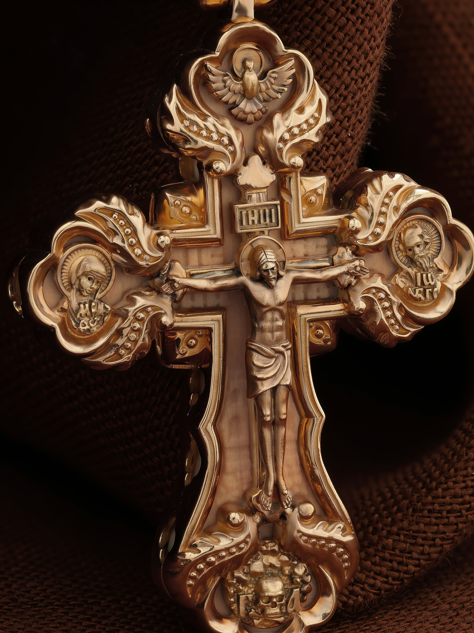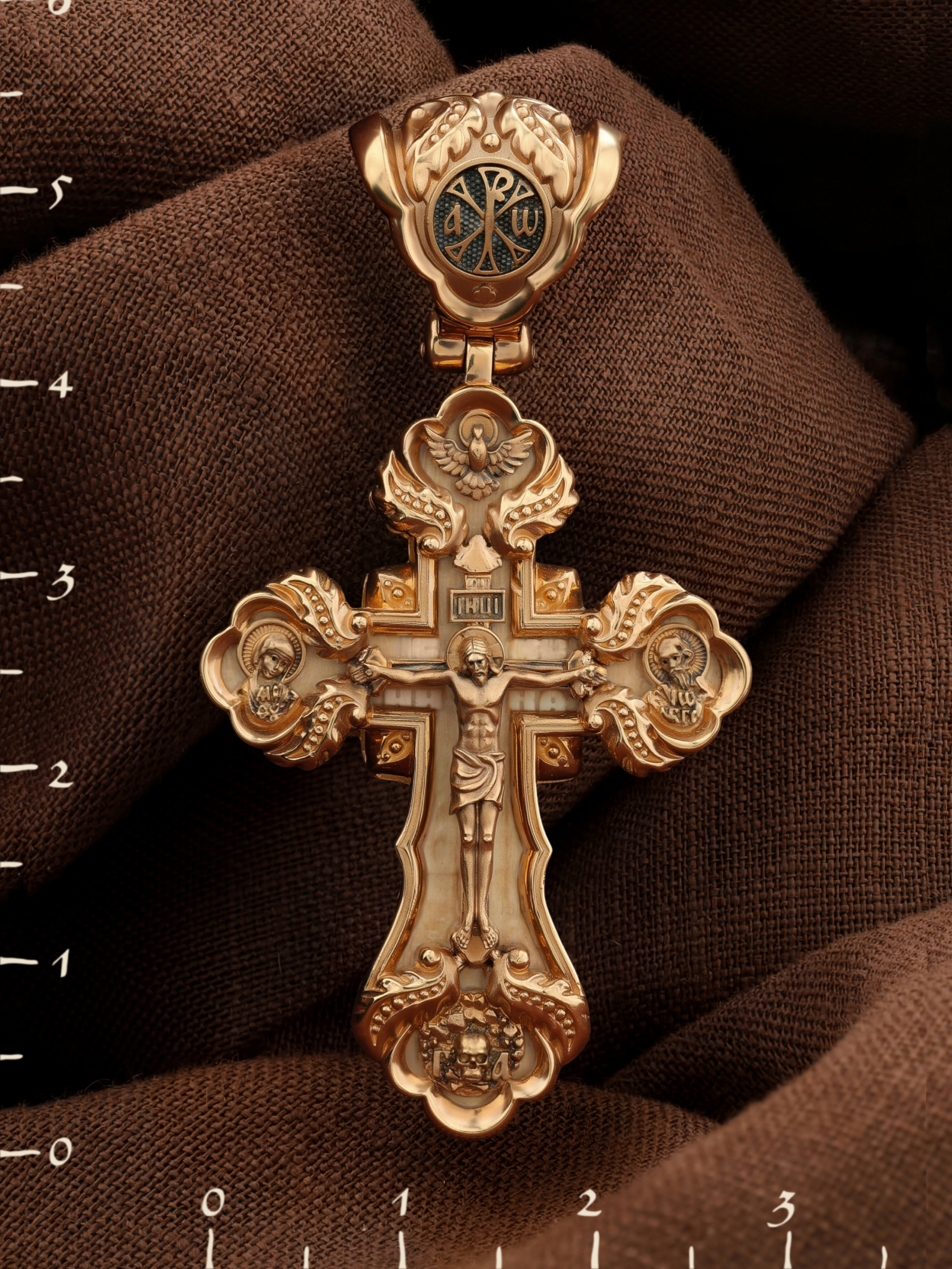 На лицевой стороне креста изображено Распятие Господа и Спасителя нашего Иисуса Христа. Крест- символ спасения и искупления рода человеческого, знамение победы над смертью и адом. Иисус Христос, как искупительная жертва освобождения человечества от власти греха, умер крестной смертью и в третий день воскрес. На верхней табличке, выше головы Иисуса, расположена надпись, составленная Понтием Пилатом — «ИНЦИ». Она означает «Иисус Назорей, Царь Иудейский». Над перекладиной написано сокращенно имя Спасителя «IC» «XC» — Иисус Христос. Ниже перекладины написано слово «НИКА» (греч. — Победитель). Крест стоит на горе камней, символизирующих Голгофу. В ее основании различается череп и надписи «Г.А.» — это голова Адама. Слева от Распятия помещен лик Пречистой Богородицы, скорой помощницы и заступницы рода Христианского. Слева изображен апостол и евангелист Иоанн Богослов, один из ближайших учеников Иисуса Христа. Над Распятием — изображение Духа Святого в виде голубя, сходящего с Небес. На кулонном кольце помещен крест.