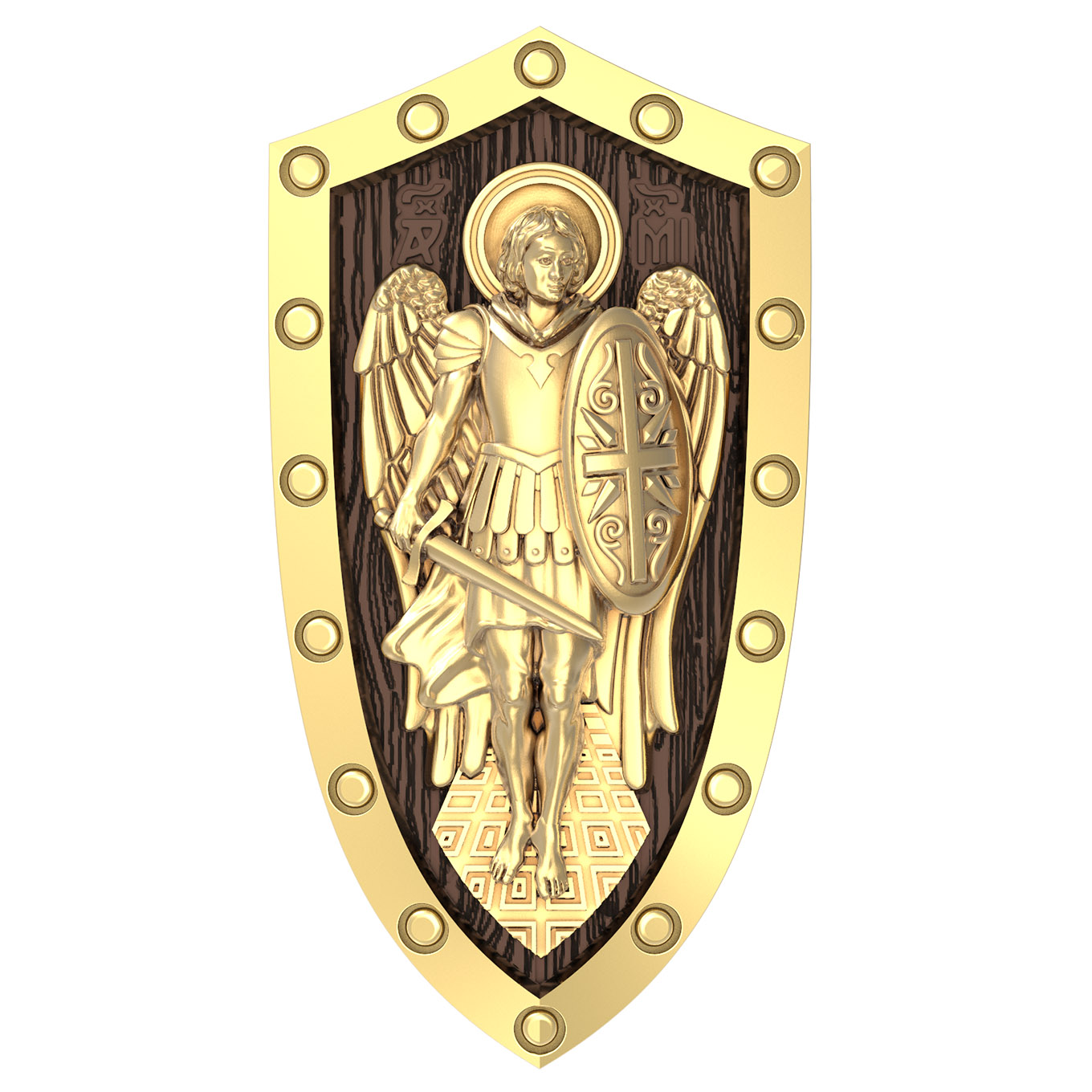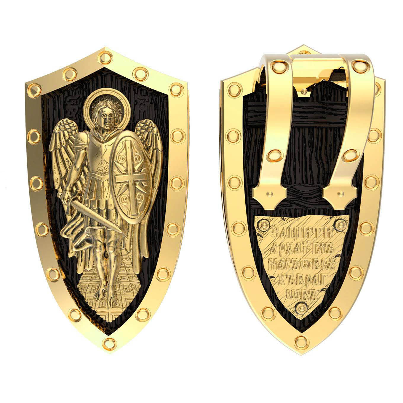 На лицевой стороне образка изображение Архангела Михаила — верного служителя Божия, который низринул с Неба возгордившегося денницу с другими павшими духами. В Православии его называют Архистратигом, что означает глава святого воинства Ангелов и Архангелов. Образок сделан в виде воинского щита. Архангел Михаил изображен в воинственном виде с огненным мечом в правой руке и щитом в левой. Архангел почитается как покровитель воинов и всех верных Богу и ведущих борьбу против сил зла, борец против ересей, а также защитник душ умерших, страж райских врат. С древних времен прославлен своими чудесами Архангел Михаил на Руси. Примеров явления и помощи Архистратига Михаила в русской истории бессчетно. Архангел Михаил не перестает ратоборствовать за славу Творца и Господа всяческих, за дело спасения рода человеческого, за церковь и чад ее. И, согласно, Откровению Иоанна Богослова во время последней битвы небесных и дьявольских сил Михаил и его ангелы опять низвергнут Люцифера вместе с его войском: «Михаил и Ангелы его воевали против дракона, и дракон и ангелы его воевали [против них], но не устояли, и не нашлось уже для них места на небе. И низвержен был великий дракон, древний змий, называемый диаволом и сатаною, обольщающий всю вселенную, низвержен на землю, и ангелы его низвержены с ним» (Откр.12:7−9).