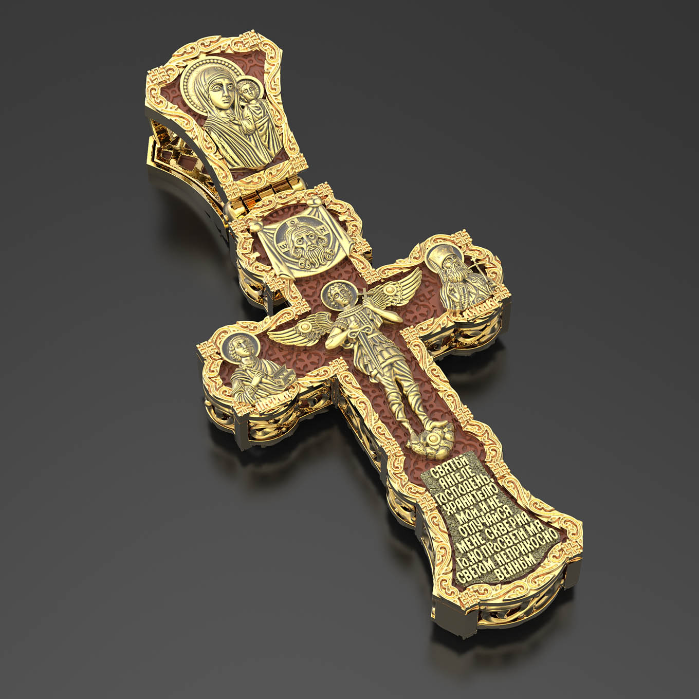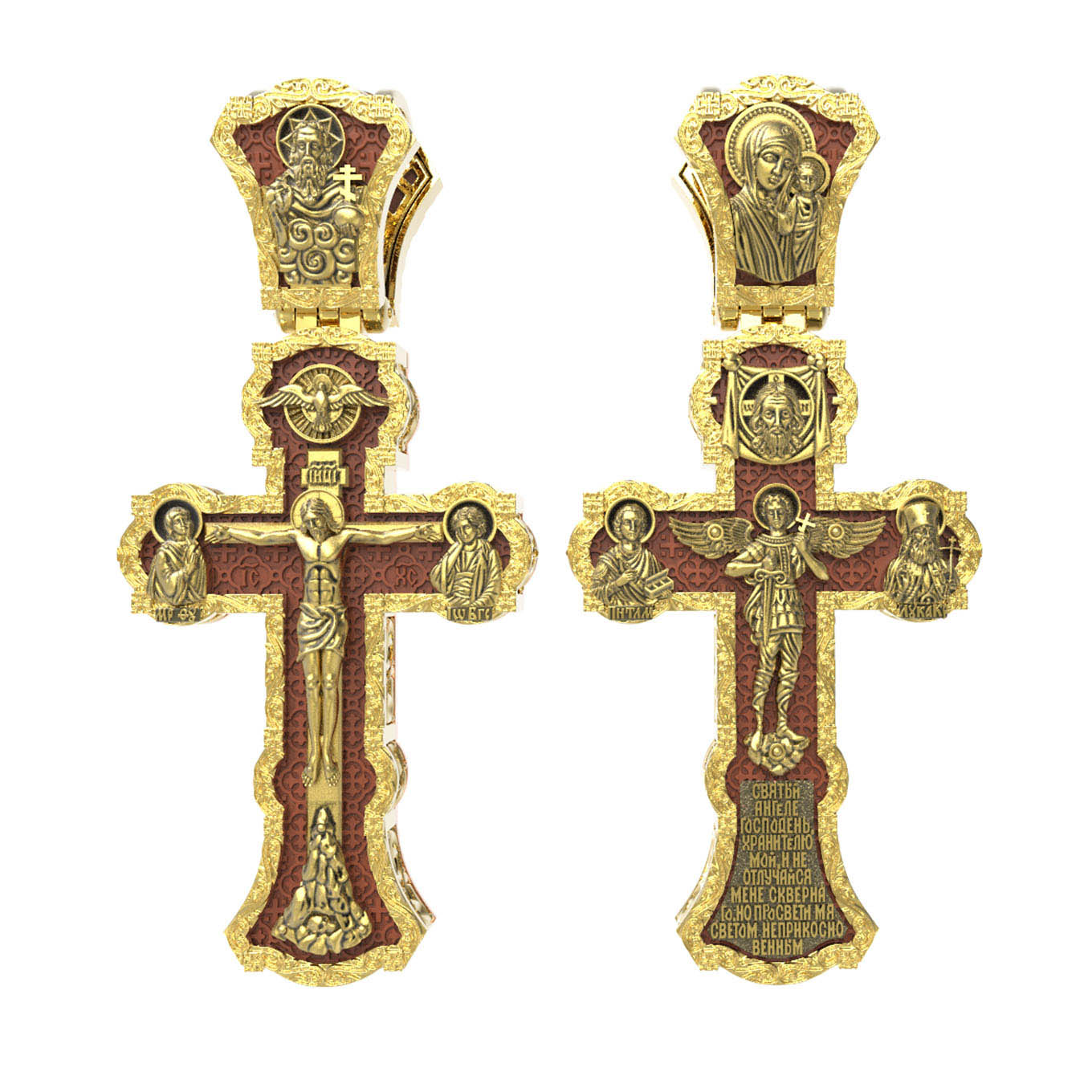 На центральной части оборотной стороны креста изображен Святой Ангел-Хранитель в виде прекрасного юноши держащего в правой руке крест, а в левой — мечь. Ангел-Хранитель — это Ангел приставляемый Богом к человеку при крещении для охраны и помощи в добрых делах. Невидимо пребывая при нас постоянно, он, руководствуя нас ко спасению, не только по нашему желанию таинственно наставляет нас на все доброе и полезное, не только возносит наши молитвы к Богу, но еще и сам от себя охраняют и защищают нас от врагов видимых и невидимых и ходатайствует за нас пред Богом. Ниже образа написана молитва: «Святый Ангеле Господень, Хранитель мой, не отлучайся мене скверного, но просвети мя светом неприкосновенным.» Выше образа изображен Спас Нерукотворный — образ Господа и Спасителя нашего Иисуса Христа, чудесно отпечатавшийся на плате, котором Христос вытер свой лик. Слева — Свя¬той ве¬ли¬ко¬му¬че¬ник и це¬ли¬тель Пан¬те-ле¬и¬мон. Господь даровал удивительную силу его молитве. Ею он исцелял любые болезни, воскрешал мертвых. Справа — Святитель Лука (Войно-Ясенецкий). На кулонном кольце изображена Казанская икона Божией Матери — одна из самых любимых на Руси.