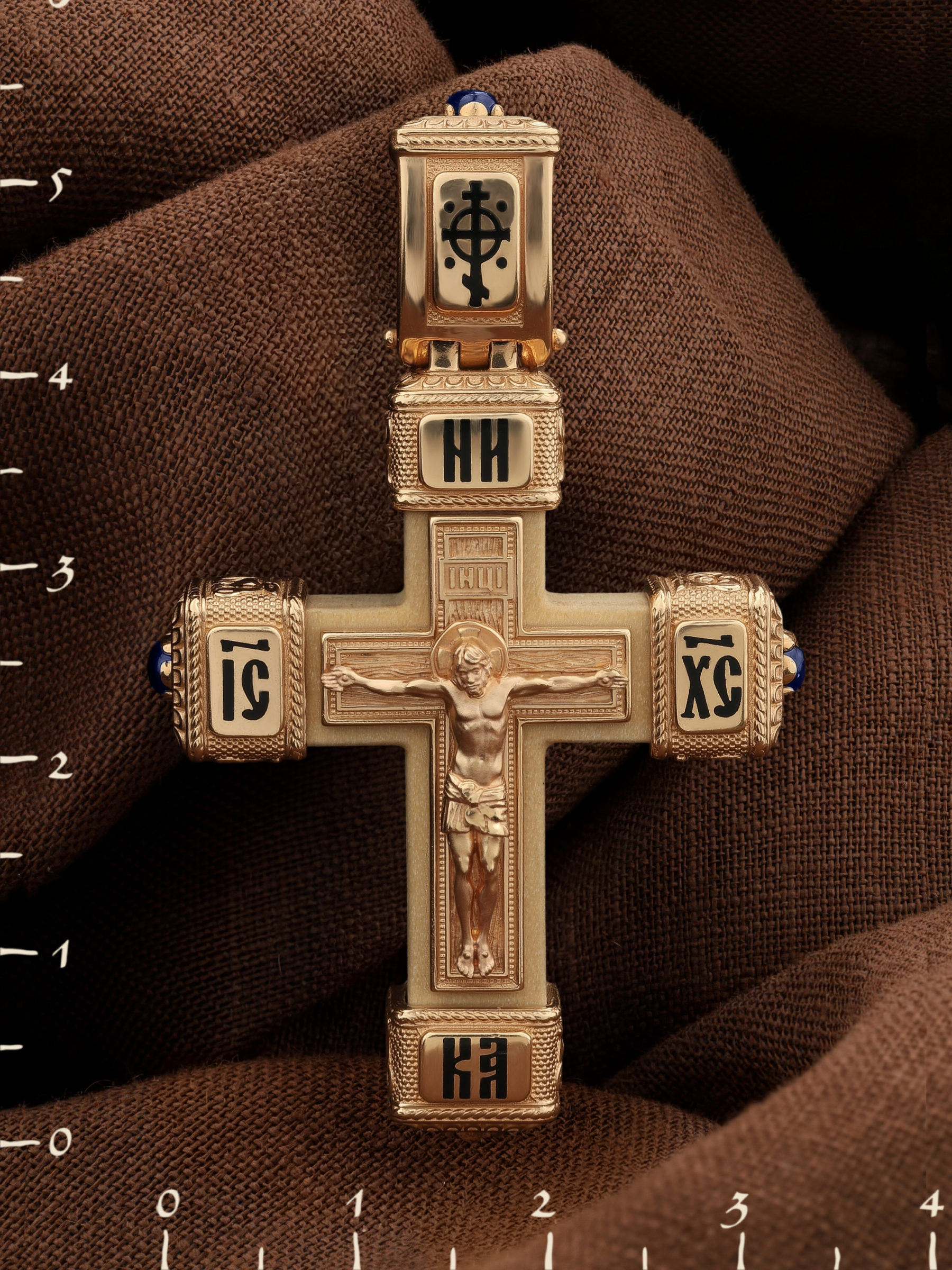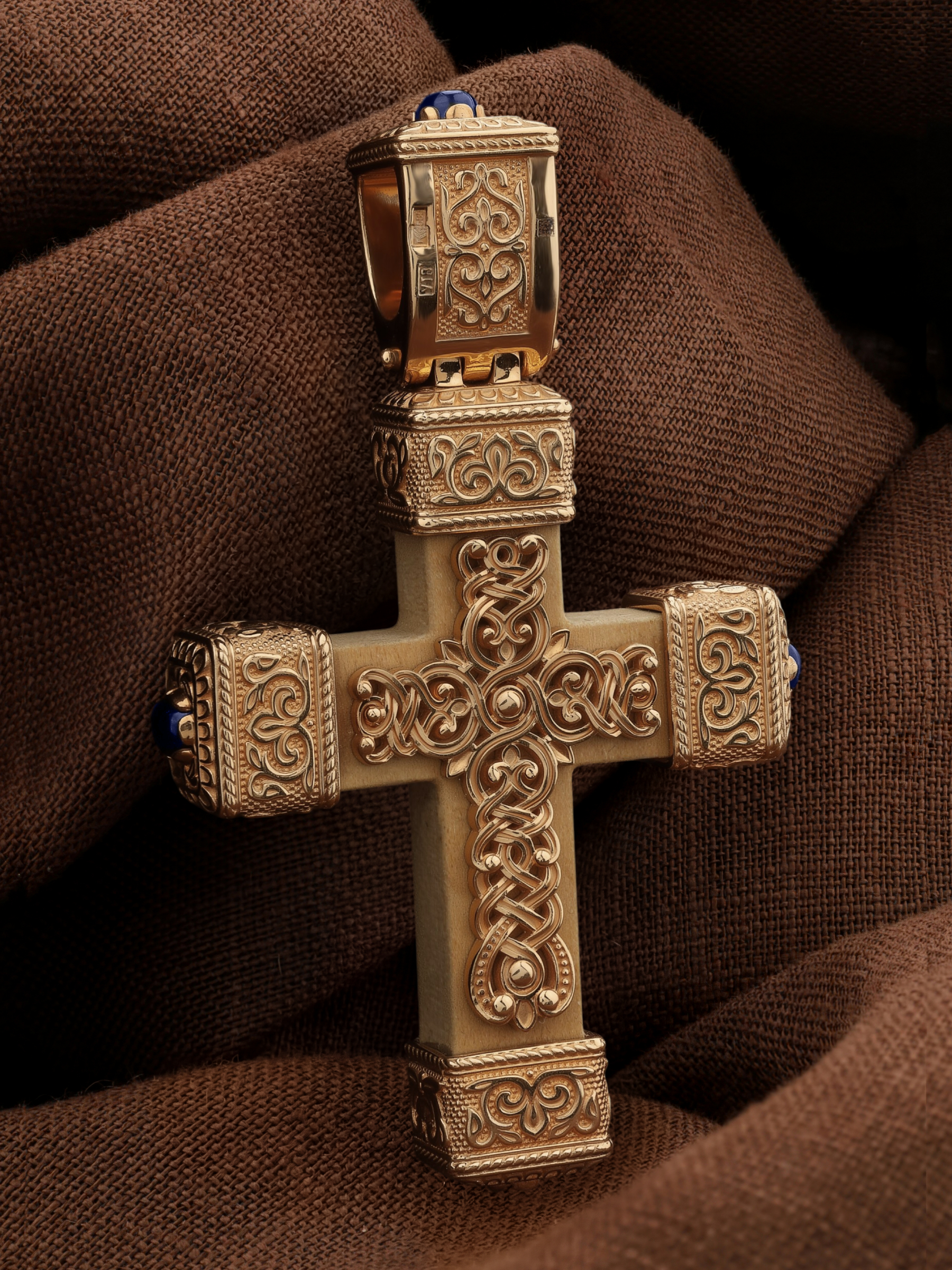 Крест из золота c эмаль, сапфиром и деревом груши