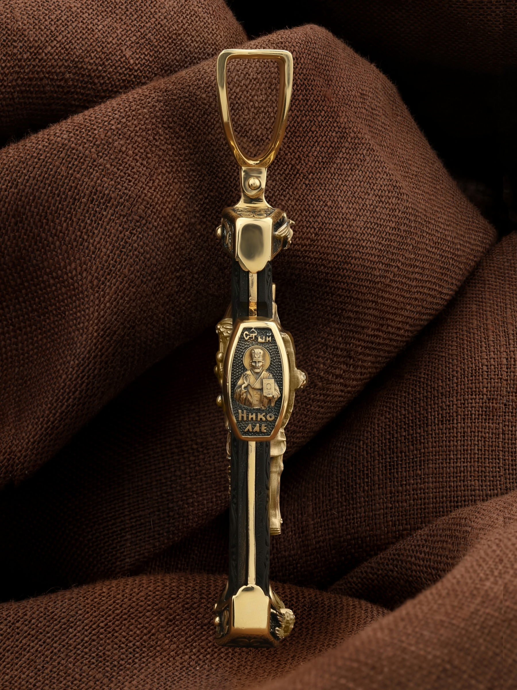 На торце изделия с левой стороны помещена икона Святого Николая Чудотворца — самый почитаемый в Православной Церкви, которого еще называют Николай Угодник за то, что он угодил своей жизнью Богу. Николай Чудотворец, помощник в делах, покровитель учащихся, утешитель обиженных и нуждающихся, целитель самых страшных и тяжелых недугов, предстатель и молитвенник за людей перед Богом. Также Святитель Николай Чудотворец известен своими молитвами за путешественников, когда непрестанный ветер и бушующие волны утихают и корабль заходит в спокойную гавань. На торце изделия с правой стороны — икона Святого Иоанна Крестителя. Святой Иоанн был последним пророком Израиля. Он призывал к покаянию, предвозвещая приближение Царствия Небесного (Мф. 3, 2), и удостоился стать Крестителем Христа. Иисус Христос говорит о нем: «Сей есть о котором написано: «Вот, Я посылаю Ангела Моего пред лицем Твоим, который приготовит путь Твой пред Тобою» (Лк. 7, 27). И еще: «Из рожденных женами нет ни одного пророка больше Иоанна Крестителя» (Лк. 7, 28).