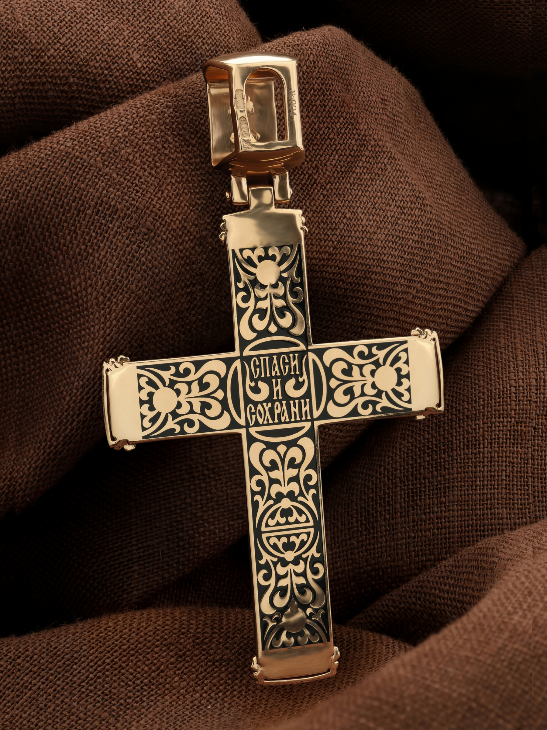 На оборотной стороне креста написана молитва: «Спаси и сохрани». Крест украшен орнаментом.