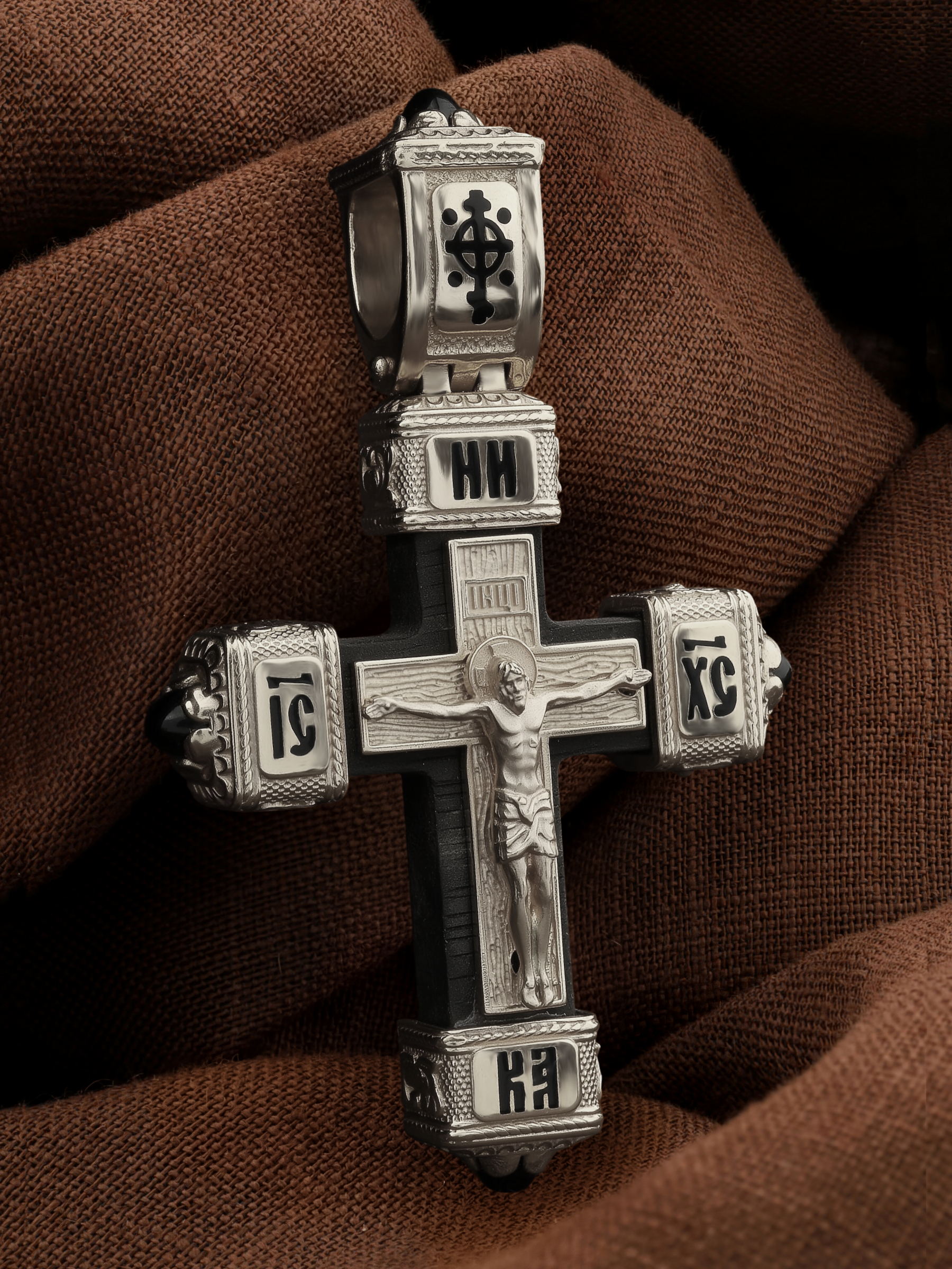 На лицевой стороне креста изображено Распятие Господа и Спасителя нашего Иисуса Христа. Своими крестными страданиями Господь смыл наши грехи, покрыл наш долг перед Богом или, на языке Писания, нас «искупил». В Голгофе сокрыта непостижимая тайна бесконечной правды и любви Бога. Крест стал символом победы добра над злом, жизни над смертью, напоминанием бесконечной Божьей любви, предметом радости. Воплотившийся Сын Божий Своею кровью освятил крест и сделал его проводником Своей благодати, источником освящения верующих. На верхней табличке, выше головы Иисуса, расположена надпись, составленная Понтием Пилатом — «IНЦI». Она означает «Иисус Назорей, Царь Иудейский». Надпись «IC» «ХC», означает Иисус Христос, помещаются на разных сторонах поперечной перекладины креста. Христос в Своей Божественной любви, над которой смерть не властна и которая, страдая, и не страдает в обычном смысле, простирает к людям со Креста Свои объятия, в которые призывается и привлекается весь мир. Поэтому Тело Его не висит, а торжественно покоится на Кресте.