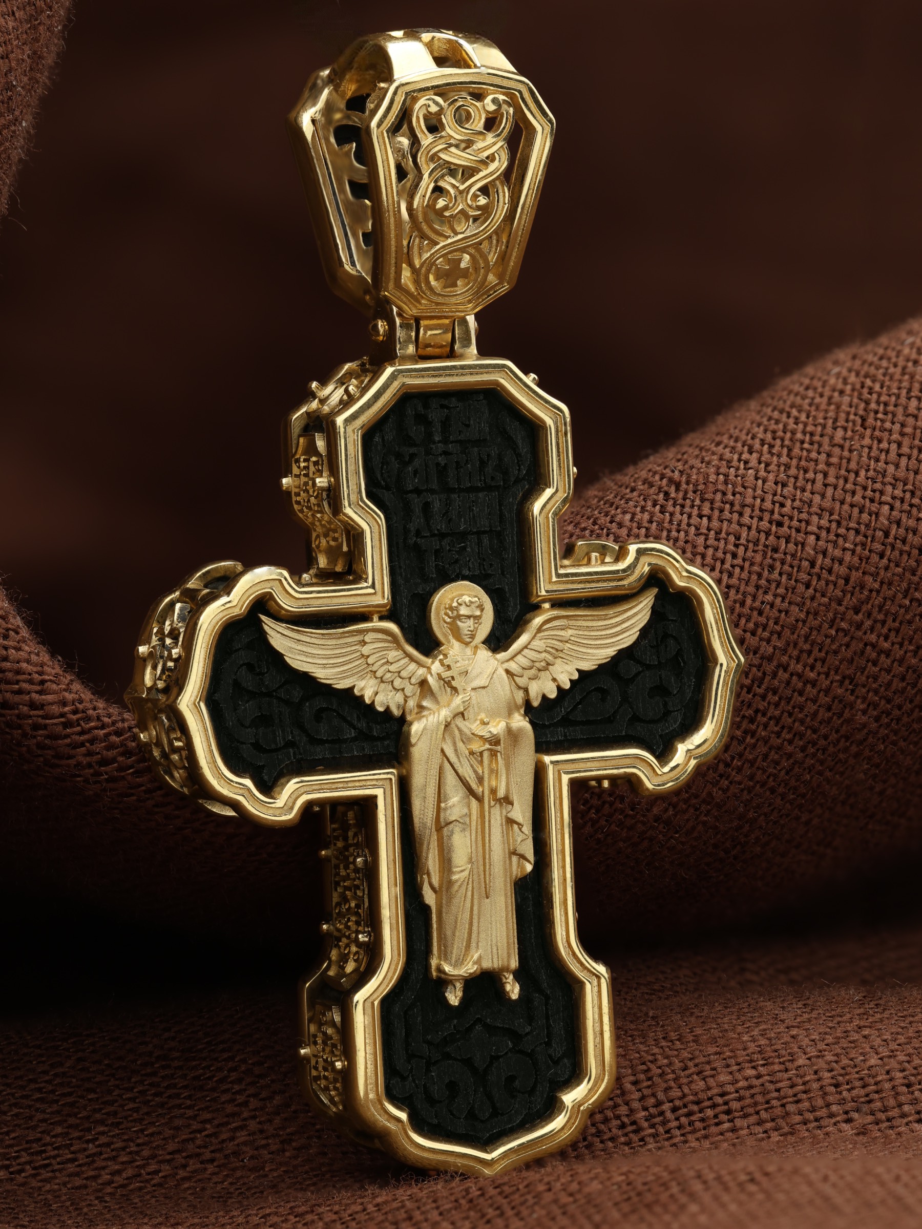 На лицевой стороне креста изображено Распятие Господа и Спасителя нашего Иисуса Христа. Крест- символ спасения и искупления рода человеческого, знамение победы над смертью и адом. Иисус Христос, как искупительная жертва освобождения человечества от власти греха, умер крестной смертью и в третий день воскрес. На верхней табличке, выше головы Иисуса, расположена надпись, составленная Понтием Пилатом — «IНЦI». Она означает «Иисус Назорей, Царь Иудейский». Надпись «IС» « ХС» означает Иисус Христос и помещается на разных сторонах поперечной (большой) перекладины креста. Рядом расположена надпись «Сын Божий». Выше Распятия изображен Нерукотворный образ Господа и Спасителя нашего Иисуса Христа. Слева от Распятия изображена Пресвятая Богородица, справа — апостол и евангелист Иоанн Богослов, один из ближайших учеников Иисуса Христа. Крест стоит на горе камней, символизирующих Голгофу. В ее основании различается череп — это голова Адама. Вдоль креста изображены копие сотника Лонгина и трость с губкой и буквы «К» и «Т». Надпись «МЛРБ» — «место лобное рай бысть» означает, что место лобное стало раем и помещаются в нижней части креста. Рядом — слово «НИКА», что означает «победитель». На православном кресте Христос не умирает, а свободно простирает руки, ладони Иисуса открыты, будто он хочет обнять все человечество, даря им свою любовь и открывая путь к вечной жизни. На кулонном кольце изображен шестикрылый Серафим.