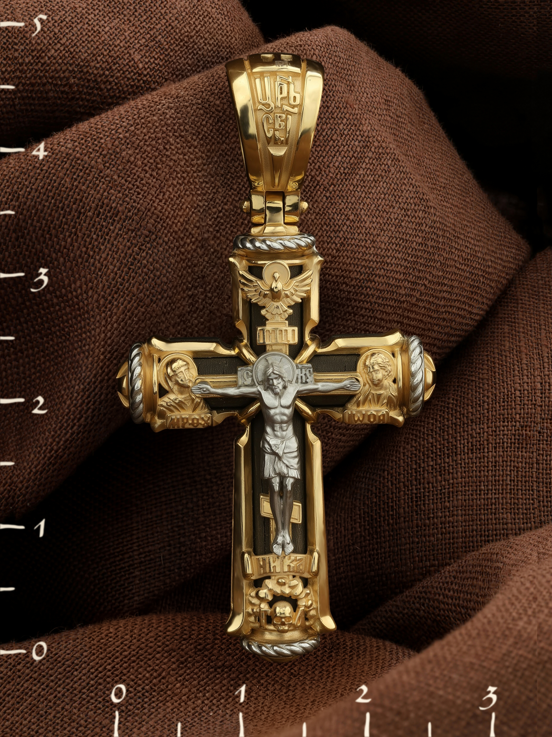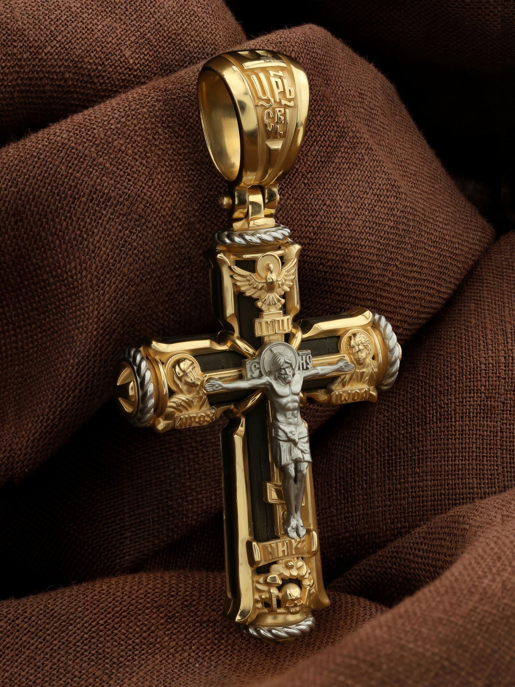 На лицевой стороне креста изображено Распятие Господа и Спасителя нашего Иисуса Христа, отдавшего Себя на смерть, для искупления грехов мира. Крест является символом жертвенной любви всеблагого Бога к падшим людям, всепобеждающим духовным оружием христиан, основанием и средоточием церковной жизни. Верхняя перекладина символизирует титло — табличку, на которой, согласно Евангелию, было начертано: Иисус Назорей Царь Иудейский (IНЦI). Надпись «IС» « ХС» означает Иисус Христос и размещена над поперечной перекладиной. Слева от Распятия изображена Пресвятая Богородица, справа — апостол и евангелист Иоанн Богослов, один из ближайших учеников Иисуса Христа. Возвышение, на котором стоит Крест, символизирует гору Голгофу, на которой произошло Распятие. Под подножием Креста изображена покоящаяся голова (череп) Адама. Под Распятием помещено изображение Духа Святого в виде голубя.