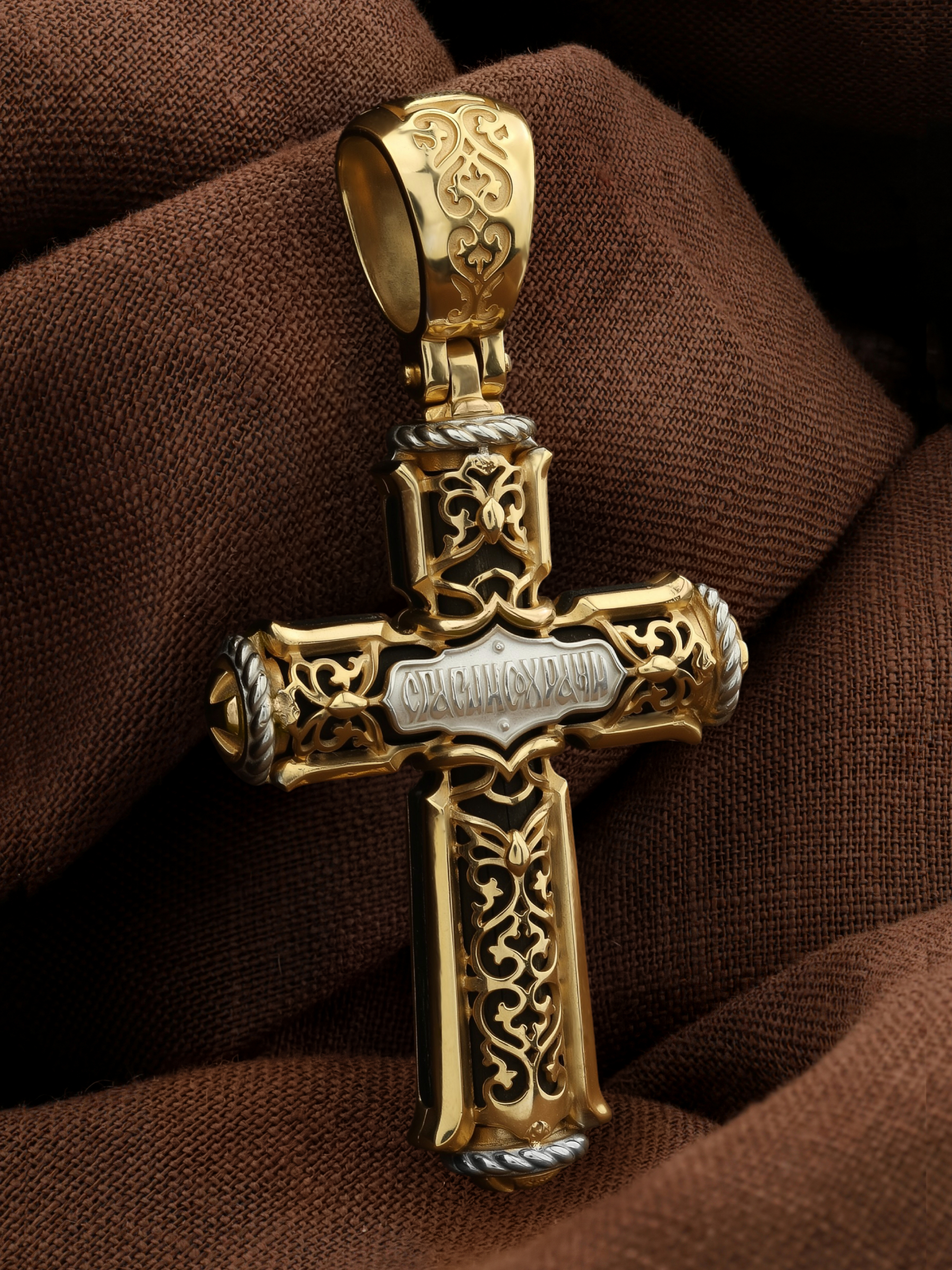 На оборотной стороне креста помещена молитва: «Спаси и сохрани». Крест украшен орнаментом.