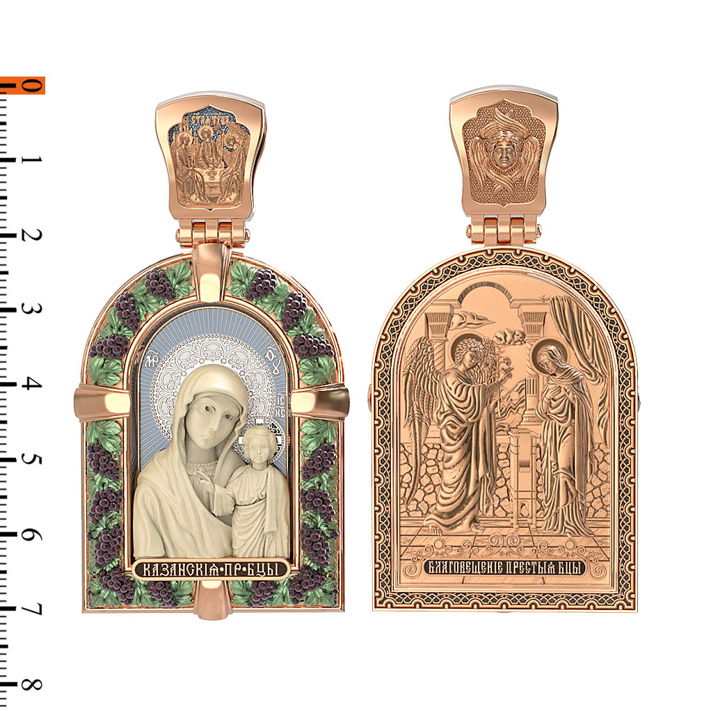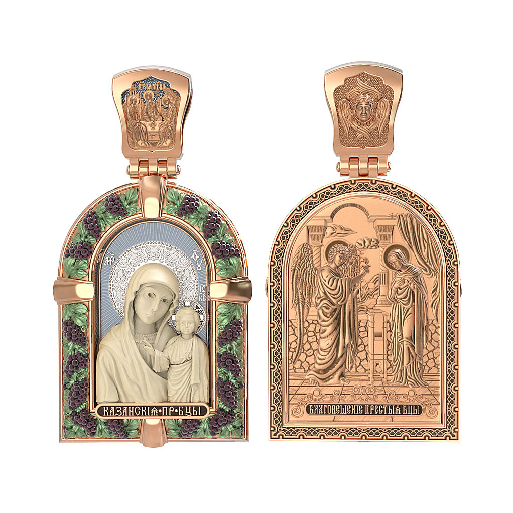 Казанская икона Божией Матери — одна из самых почитаемых в России чудотворных икон Богородицы. Богословское значение Казанской иконы — указать верующим истинный Путь к спасению, который лежит через Христа. Только Божия Матерь имеет настолько сильное дерзновение к Спасителю, что может ходатайствовать перед Ним за всех верных. Именно этот образ дарится новой повенчанной паре, как хранитель очага и семейная реликвия. Молитва перед Казанской иконой Божьей Матери помогает во всех сложных случаях жизни, в болезнях, во всех печалях, невзгодах, скорбях. Уникальная история появления, чудеса, случившиеся по молитвам православных людей возле образа — все это делает Казанскую Богородицу особенной, среди тысяч других икон. Вверху — икона Святой Троицы, на которой запечатлено явление Триединого Бога праотцу Аврааму в виде трех ангелов. Образок обвивает виноградная лоза — один из самых распространенных символических образов христианства. Она является символом Иисуса Христа, Который в Евангелии говорит о Себе: «Я есмь истинная виноградная лоза, и Отец мой — виноградарь». (Ин. 15:1). Поэтому именно из винограда изготавливается вино для Причастия, призванное символизировать Кровь Христову.