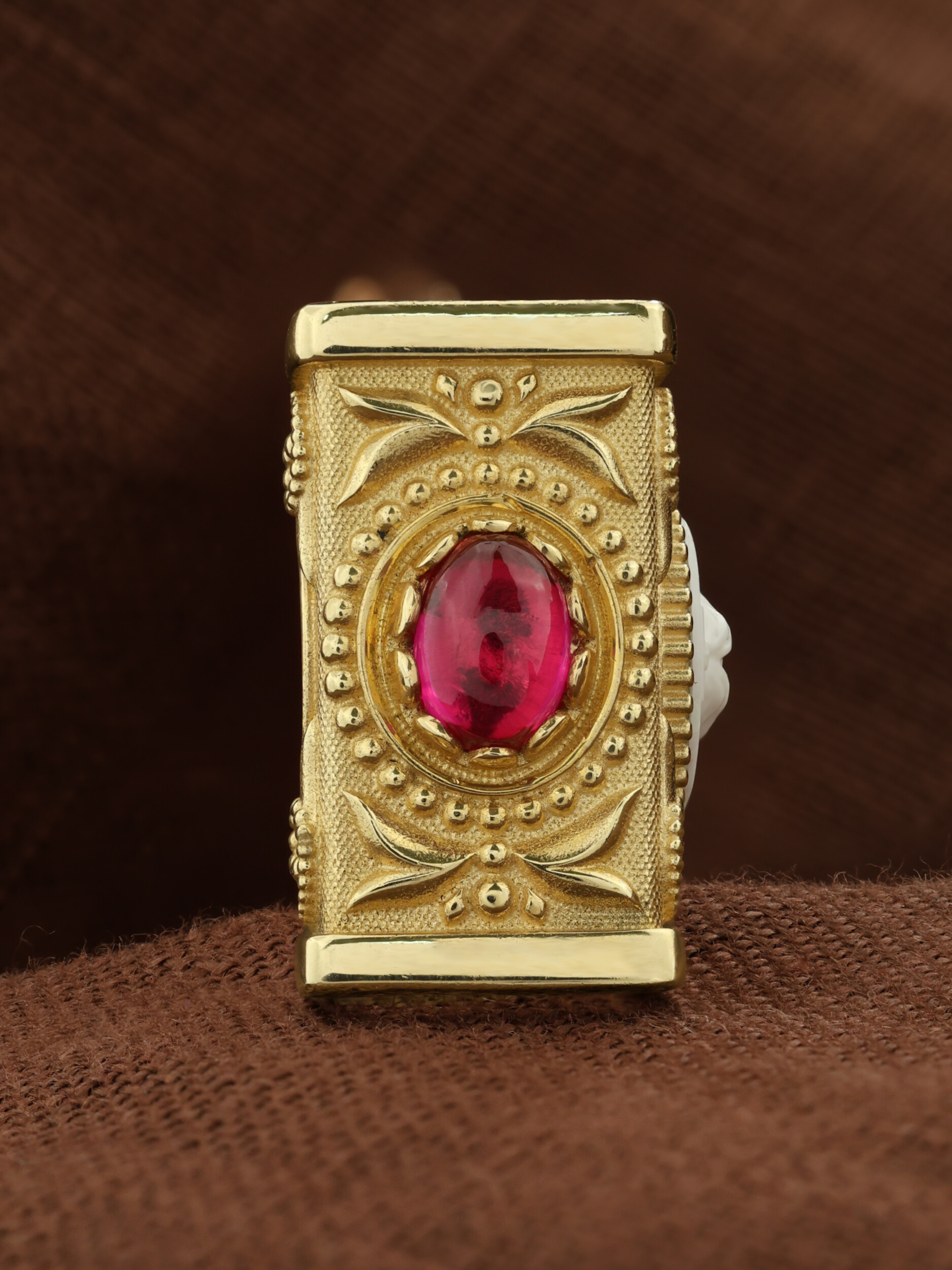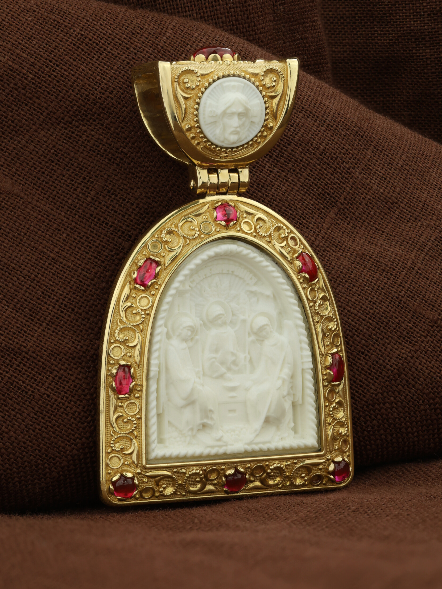 Образок из лимонного золота c эмаль, рубином и бивнем мамонта