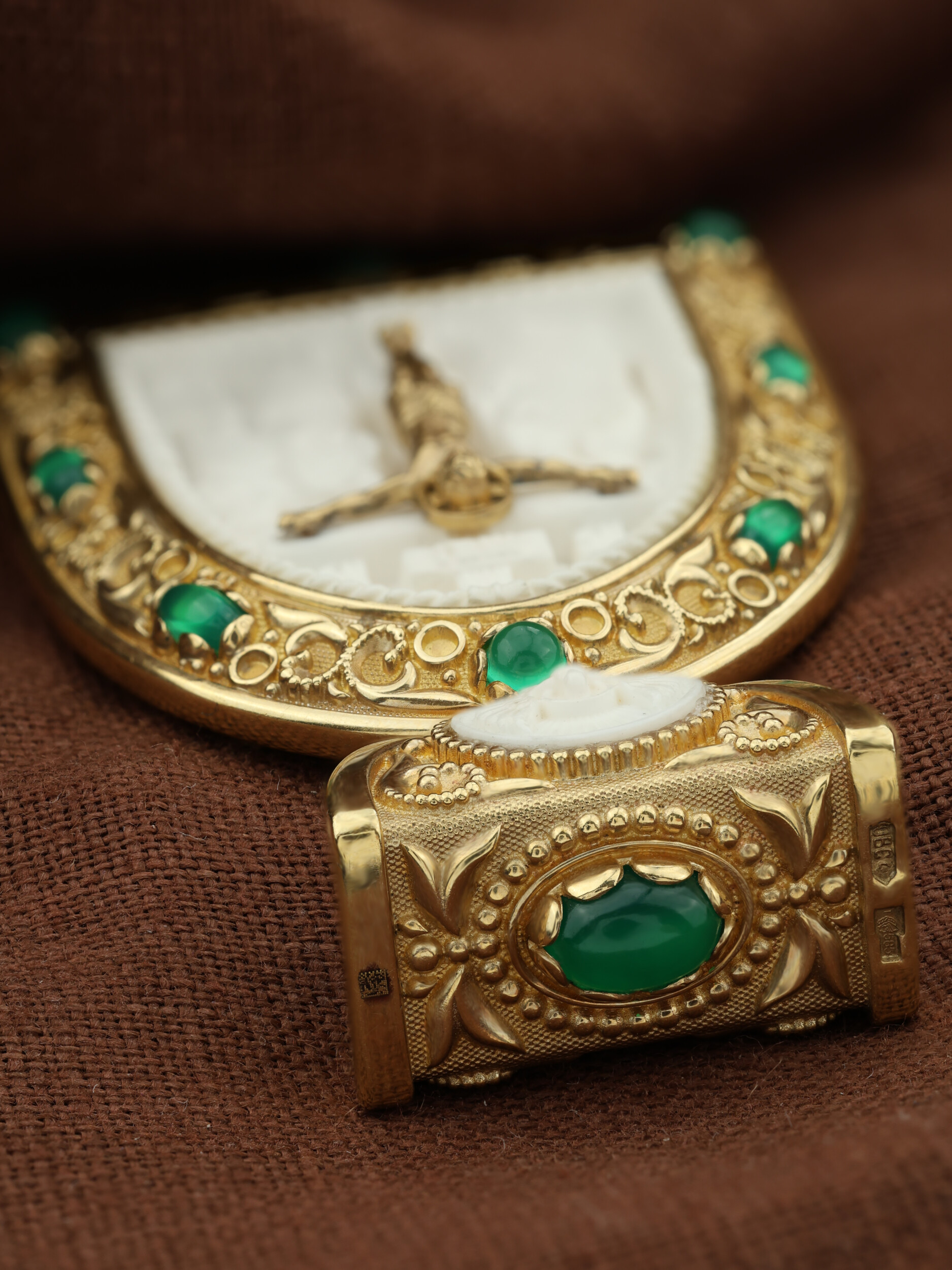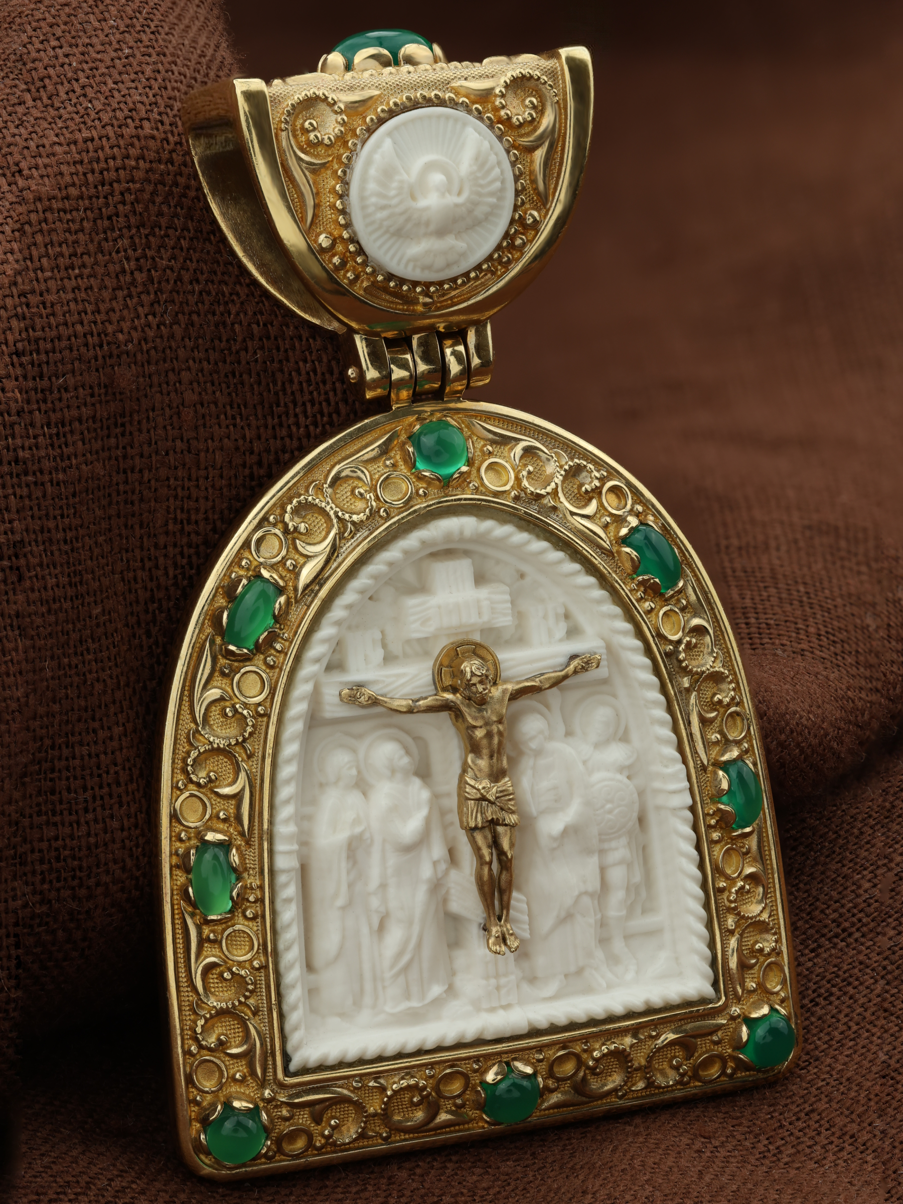 Образок из лимонного золота c эмаль, хризопразом и бивнем мамонта