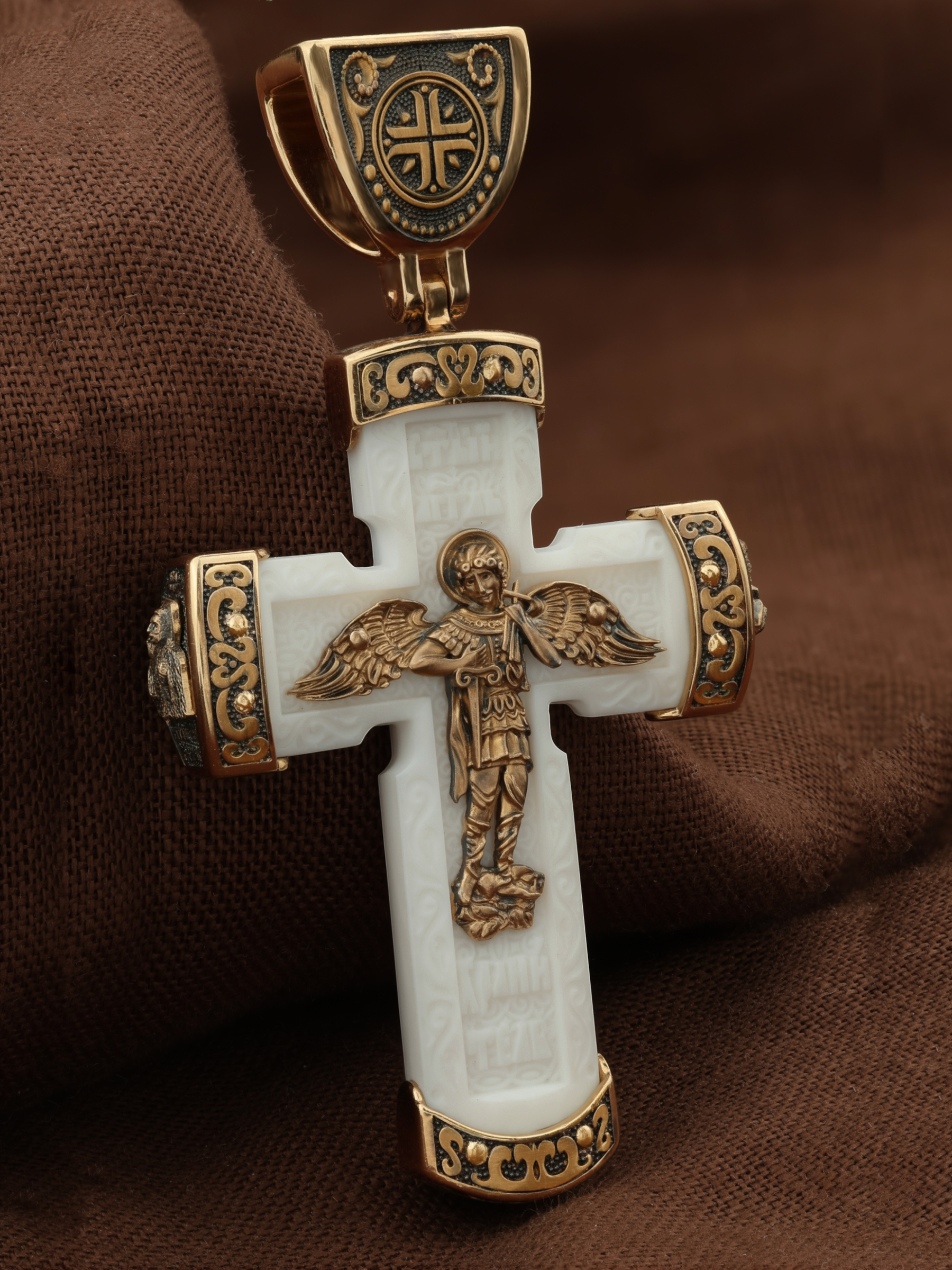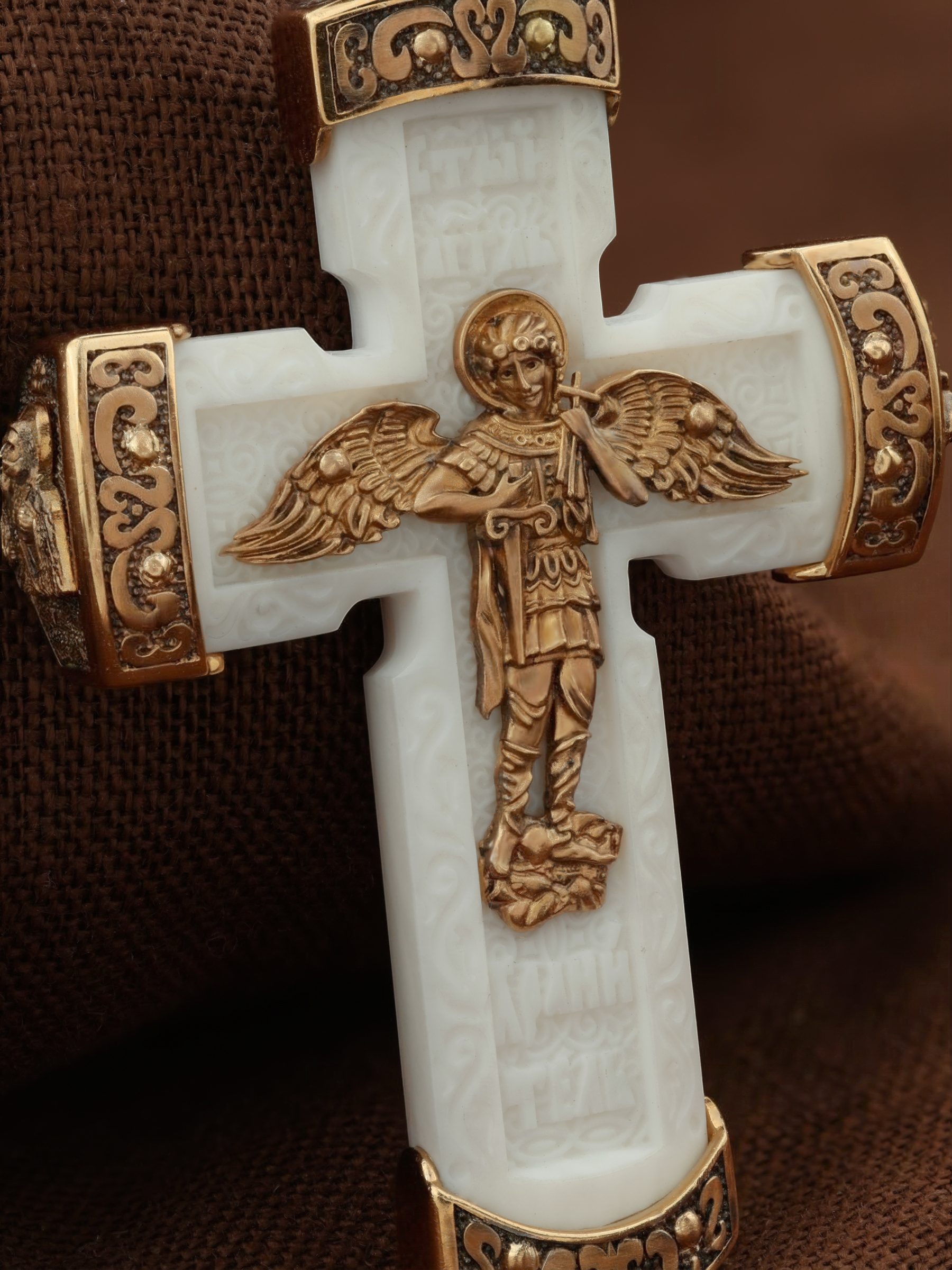 В центре оборота креста изображен Ангела Хранителя с традиционными атрибутами в руках: крестом, которым он осеняет человека, и мечом для прогнания бесов. По Православному учению, каждому, принявшему святое крещение, дается Господом Ангел Хранитель, который сопровождает человека всю его жизнь, помогая в добрых делах и охраняя от нападок злых духов. Святые отцы утверждают, что только верующий человек имеет рядом с собой Ангела Хранителя: «Тем, которые сподобились крещения и возносятся на высоту добродетелей, даны от Бога Ангелы, заботящиеся о них и содействующие им. В этом уверяет нас Господь, когда говорит, что есть Ангелы Хранители у всякого, кто верует в Него» (преп. Анастасий Синаит). Но Ангел Хранитель пребывает с христианином, если только мы не прогоним его греховными делами, поскольку «как дым разгоняет пчел, так и грех прогоняет от нас Ангела Хранителя» (свт. Василий Великий). Но и после завершения земного пути Ангел Хранитель не покидает христианина, а помогает душе преодолеть воздушные мытарства на пути в Царство Небесное.
