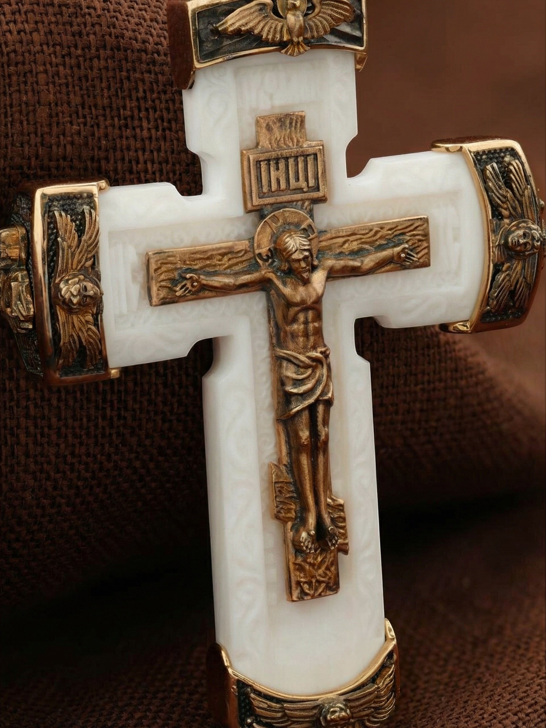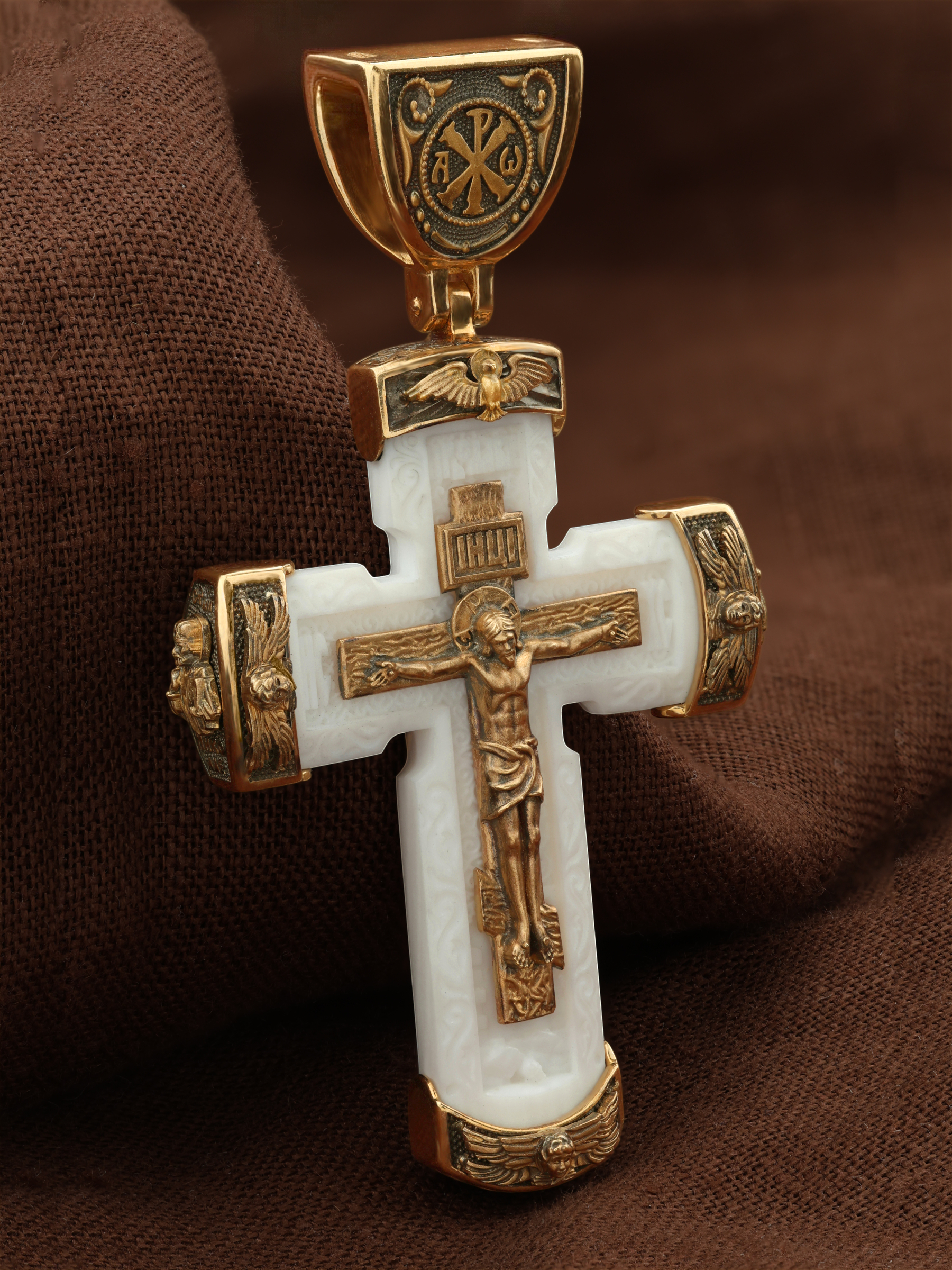 На лицевой стороне креста изображено Распятие, потому что это орудие казни Иисус Христос сделал орудием победы над грехом и смертью. Своими страданиями Он искупил грехи человечества, умерев и сошествовав во ад, победил сатану, освободил души праведников от вечной смерти и открыл им небесные врата рая. Жертва Христа сделала возможным спасение для каждого человека. На православном кресте Христос не умирает, а свободно простирает руки, ладони Иисуса открыты, будто он хочет обнять все человечество, даря им свою любовь и открывая путь к вечной жизни.