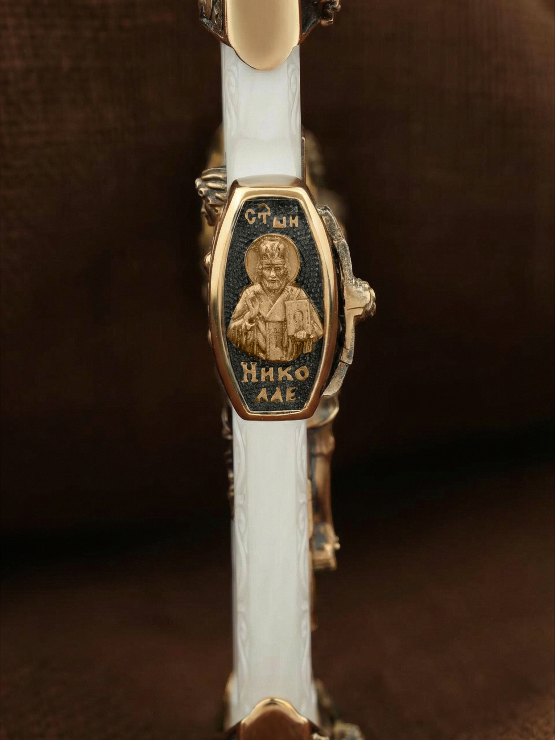 На торце изделия с левой стороны помещена икона Святого Николая Чудотворца — самый почитаемый в Православной Церкви, которого еще называют Николай Угодник за то, что он угодил своей жизнью Богу. Николай Чудотворец, помощник в делах, покровитель учащихся, утешитель обиженных и нуждающихся, целитель самых страшных и тяжелых недугов, предстатель и молитвенник за людей перед Богом. Также Святитель Николай Чудотворец известен своими молитвами за путешественников, когда непрестанный ветер и бушующие волны утихают и корабль заходит в спокойную гавань. На торце изделия с правой стороны — икона Святого Иоанна Крестителя. Святой Иоанн был последним пророком Израиля. Он призывал к покаянию, предвозвещая приближение Царствия Небесного (Мф. 3, 2), и удостоился стать Крестителем Христа. Иисус Христос говорит о нем: «Сей есть о котором написано: «Вот, Я посылаю Ангела Моего пред лицем Твоим, который приготовит путь Твой пред Тобою» (Лк. 7, 27). И еще: «Из рожденных женами нет ни одного пророка больше Иоанна Крестителя» (Лк. 7, 28).