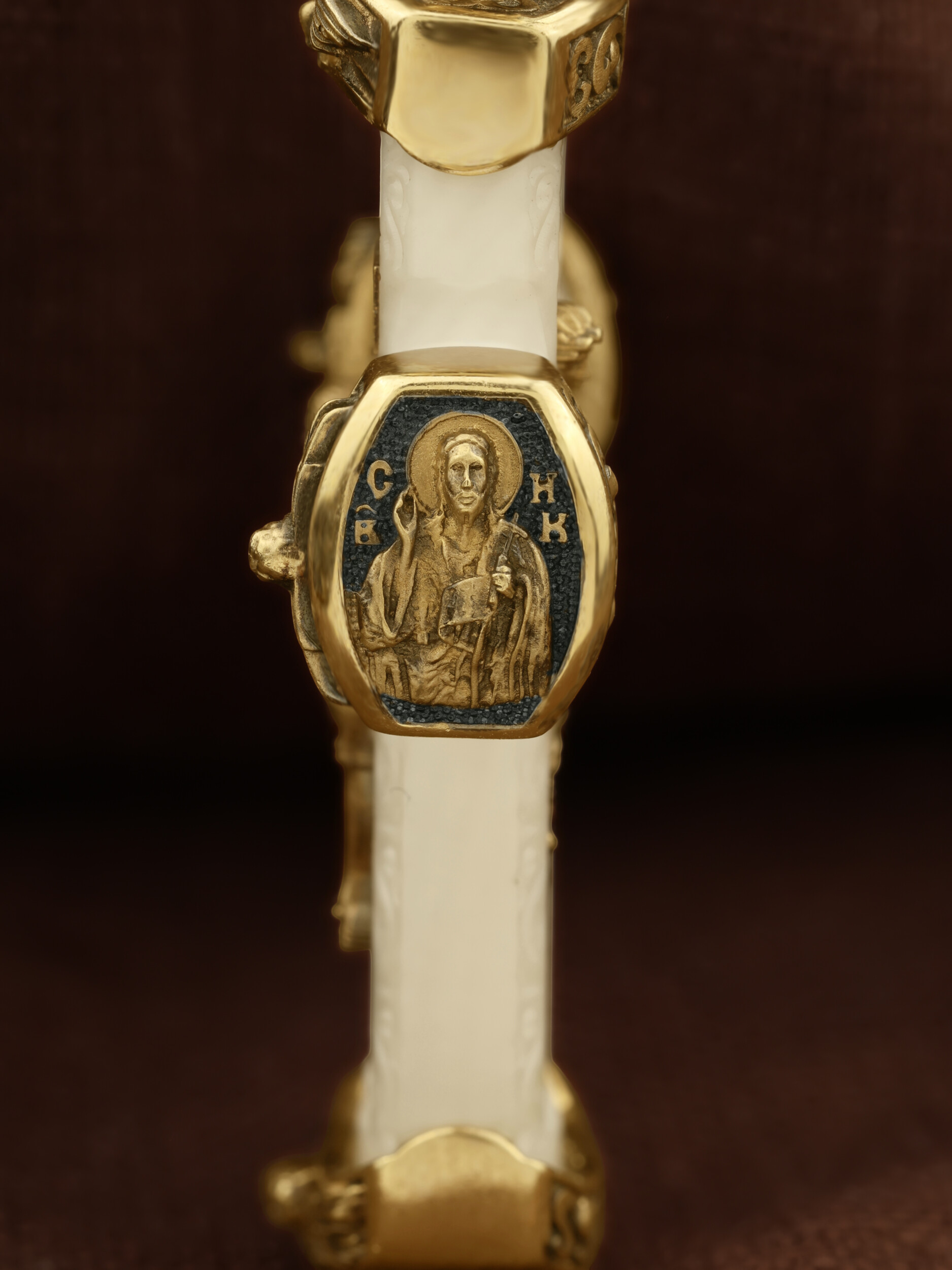 На торце изделия с левой стороны помещена икона Святого Николая Чудотворца — самый почитаемый в Православной Церкви, которого еще называют Николай Угодник за то, что он угодил своей жизнью Богу. Николай Чудотворец, помощник в делах, покровитель учащихся, утешитель обиженных и нуждающихся, целитель самых страшных и тяжелых недугов, предстатель и молитвенник за людей перед Богом. Также Святитель Николай Чудотворец известен своими молитвами за путешественников, когда непрестанный ветер и бушующие волны утихают и корабль заходит в спокойную гавань. На торце изделия с правой стороны — икона Святого Иоанна Крестителя. Святой Иоанн был последним пророком Израиля. Он призывал к покаянию, предвозвещая приближение Царствия Небесного (Мф. 3, 2), и удостоился стать Крестителем Христа. Иисус Христос говорит о нем: «Сей есть о котором написано: «Вот, Я посылаю Ангела Моего пред лицем Твоим, который приготовит путь Твой пред Тобою» (Лк. 7, 27). И еще: «Из рожденных женами нет ни одного пророка больше Иоанна Крестителя» (Лк. 7, 28).