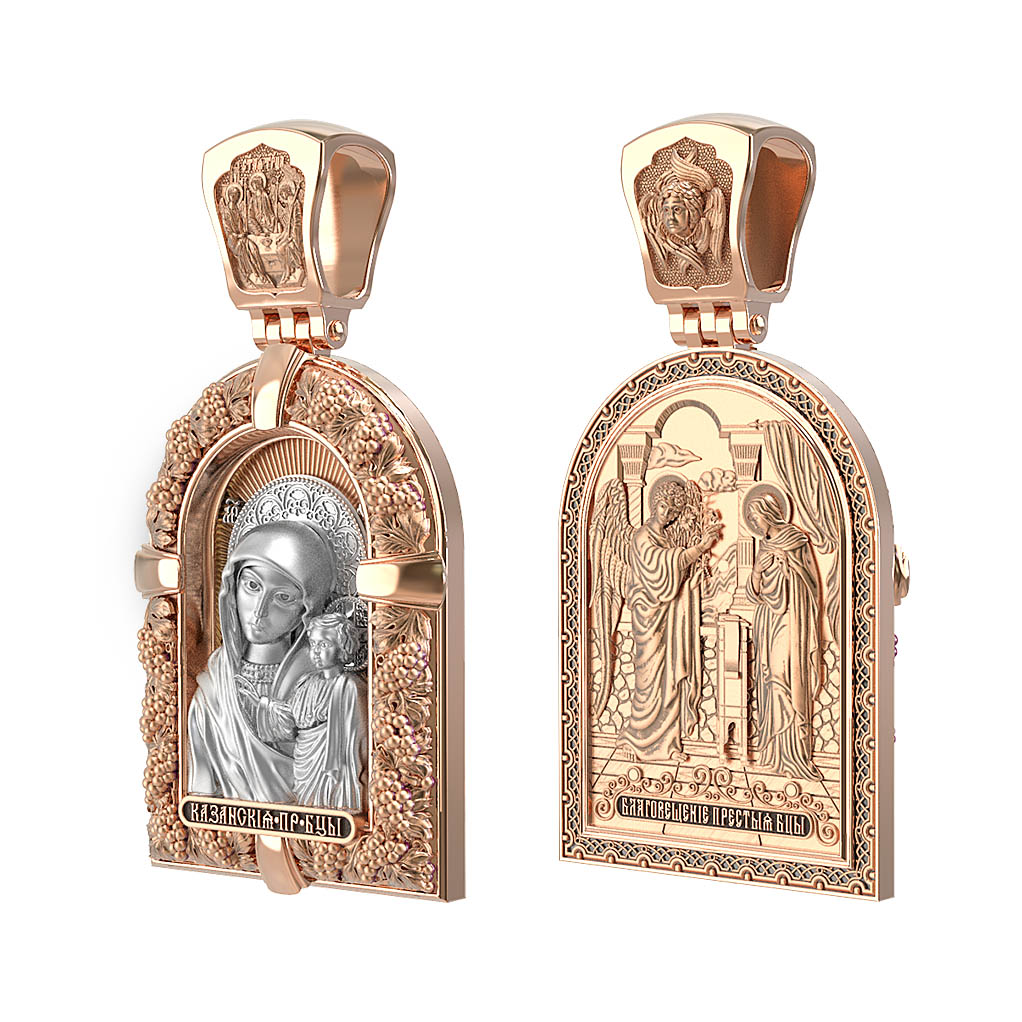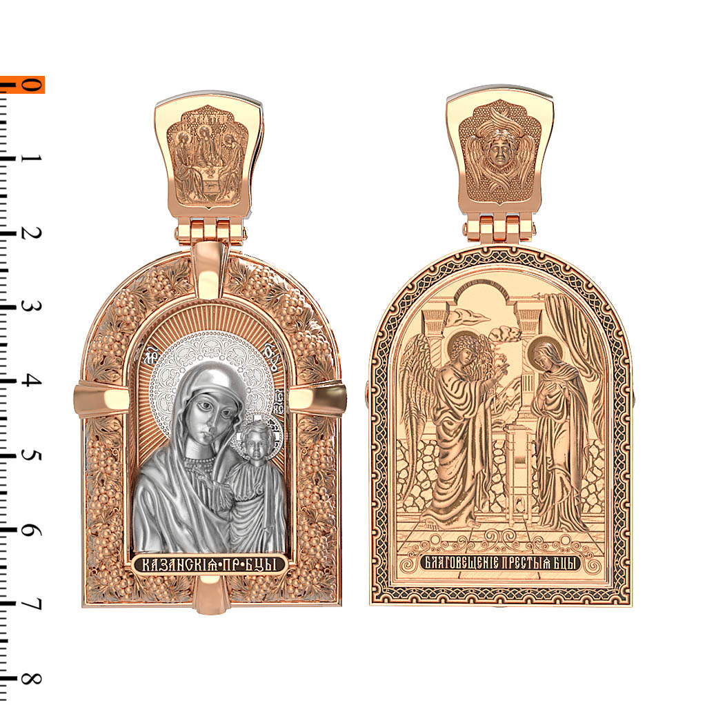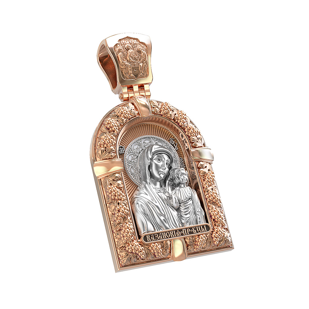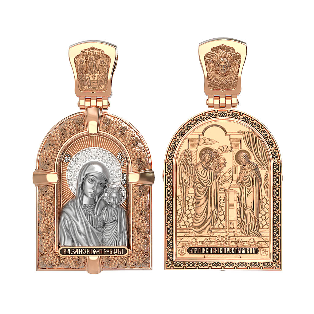 Казанская икона Божией Матери — одна из самых почитаемых в России чудотворных икон Богородицы. Богословское значение Казанской иконы — указать верующим истинный Путь к спасению, который лежит через Христа. Только Божия Матерь имеет настолько сильное дерзновение к Спасителю, что может ходатайствовать перед Ним за всех верных. Именно этот образ дарится новой повенчанной паре, как хранитель очага и семейная реликвия. Молитва перед Казанской иконой Божьей Матери помогает во всех сложных случаях жизни, в болезнях, во всех печалях, невзгодах, скорбях. Уникальная история появления, чудеса, случившиеся по молитвам православных людей возле образа — все это делает Казанскую Богородицу особенной, среди тысяч других икон. Вверху — икона Святой Троицы, на которой запечатлено явление Триединого Бога праотцу Аврааму в виде трех ангелов. Образок обвивает виноградная лоза — один из самых распространенных символических образов христианства. Она является символом Иисуса Христа, Который в Евангелии говорит о Себе: «Я есмь истинная виноградная лоза, и Отец мой — виноградарь». (Ин. 15:1). Поэтому именно из винограда изготавливается вино для Причастия, призванное символизировать Кровь Христову.