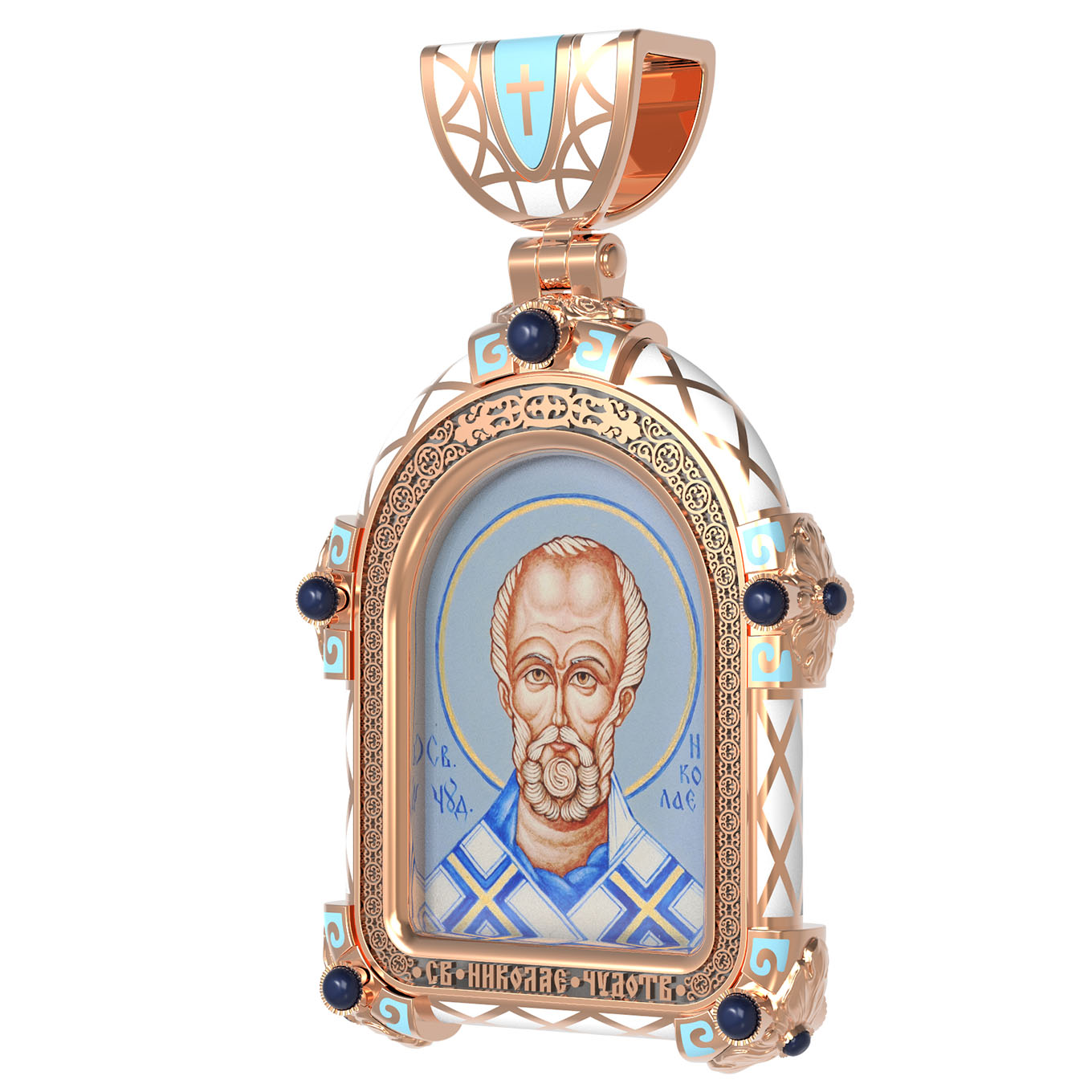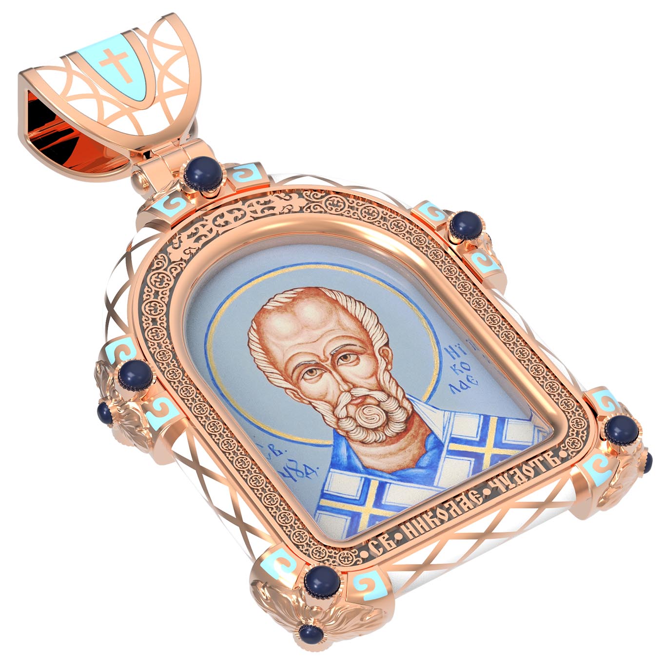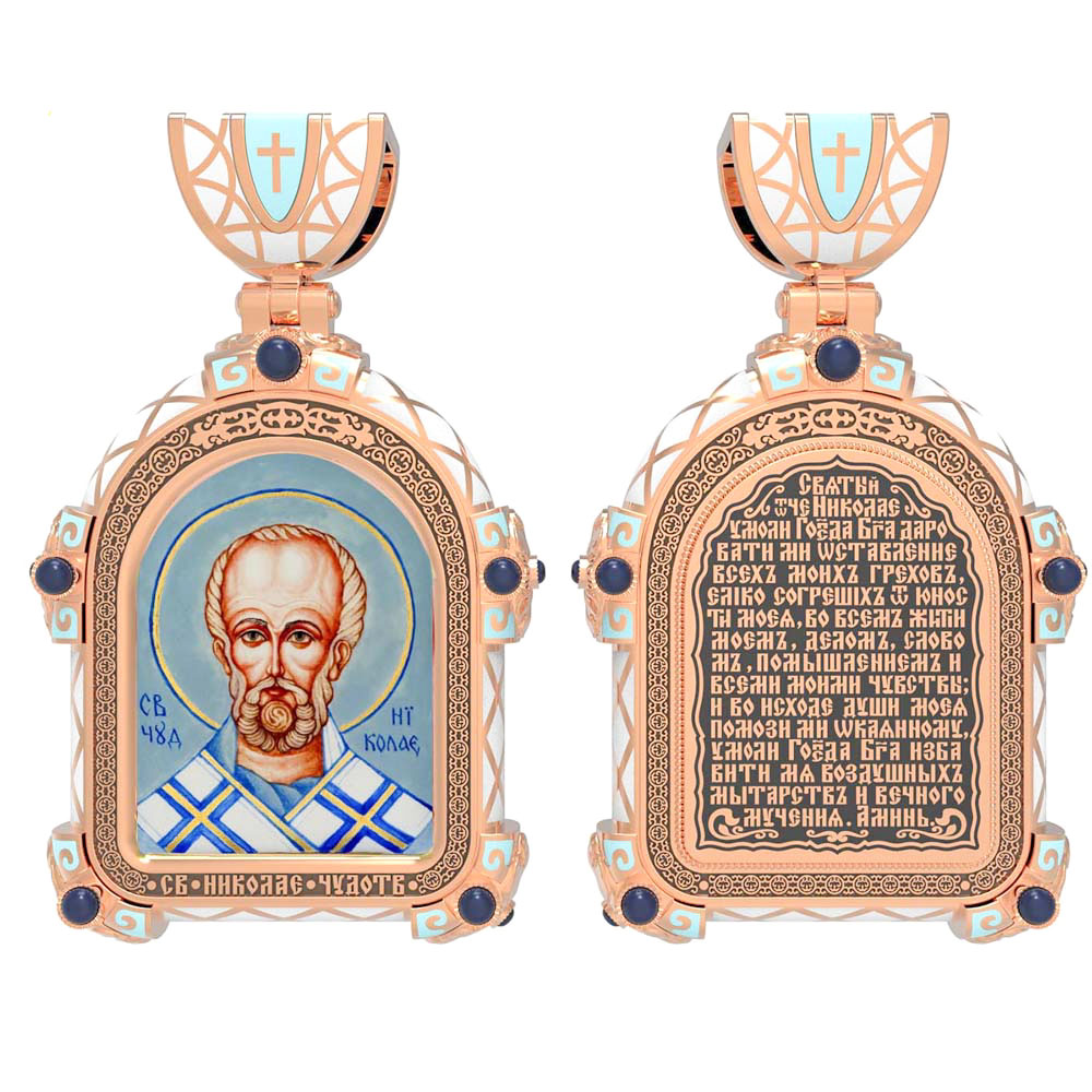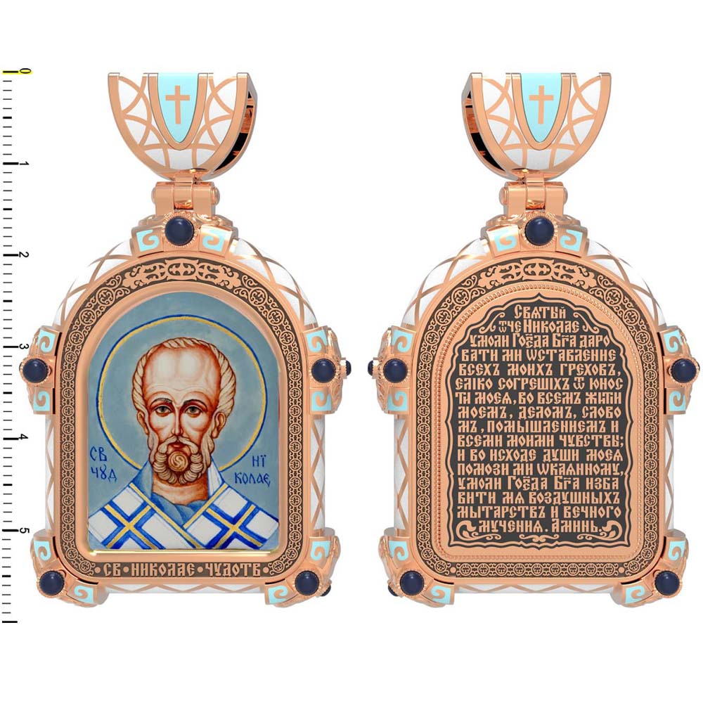 На лицевой стороне образка изображен Святитель Николай архиепископ Мир Ликийских, Чудотворец. Он является одним из самых известных на Руси святых, издревле считающийся помощником и молитвенником за всех, притекающих к нему. Чудес его исчислить невозможно. Николай Чудотворец подавал многим исцеления в болезнях и телесных недугах, обогащал бедствующих в крайней нищете, подавал голодным пищу, спасал от потопления, освобождал из плена и избавлял от смерти.