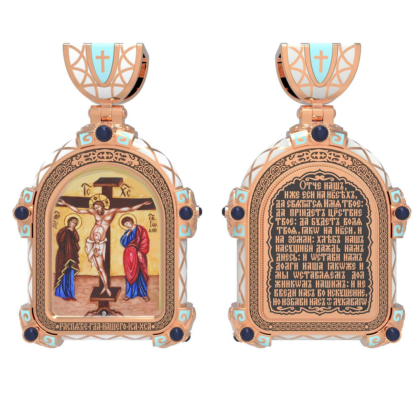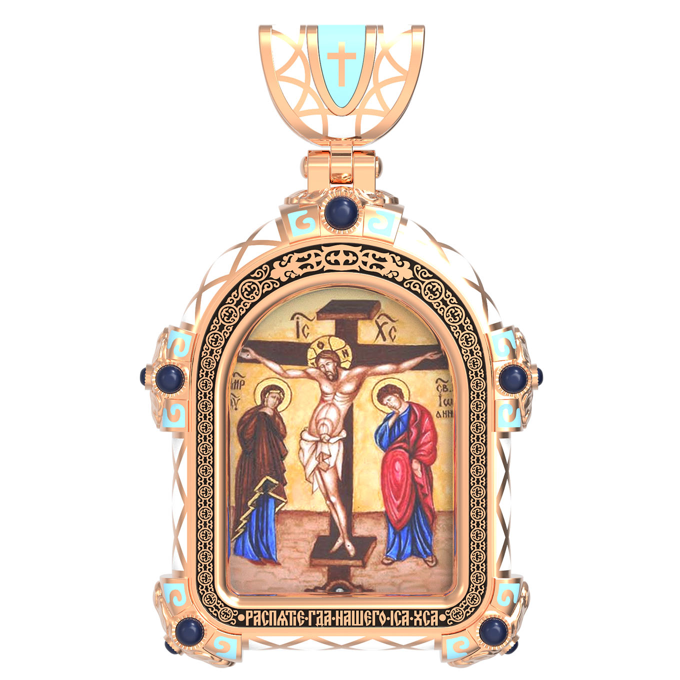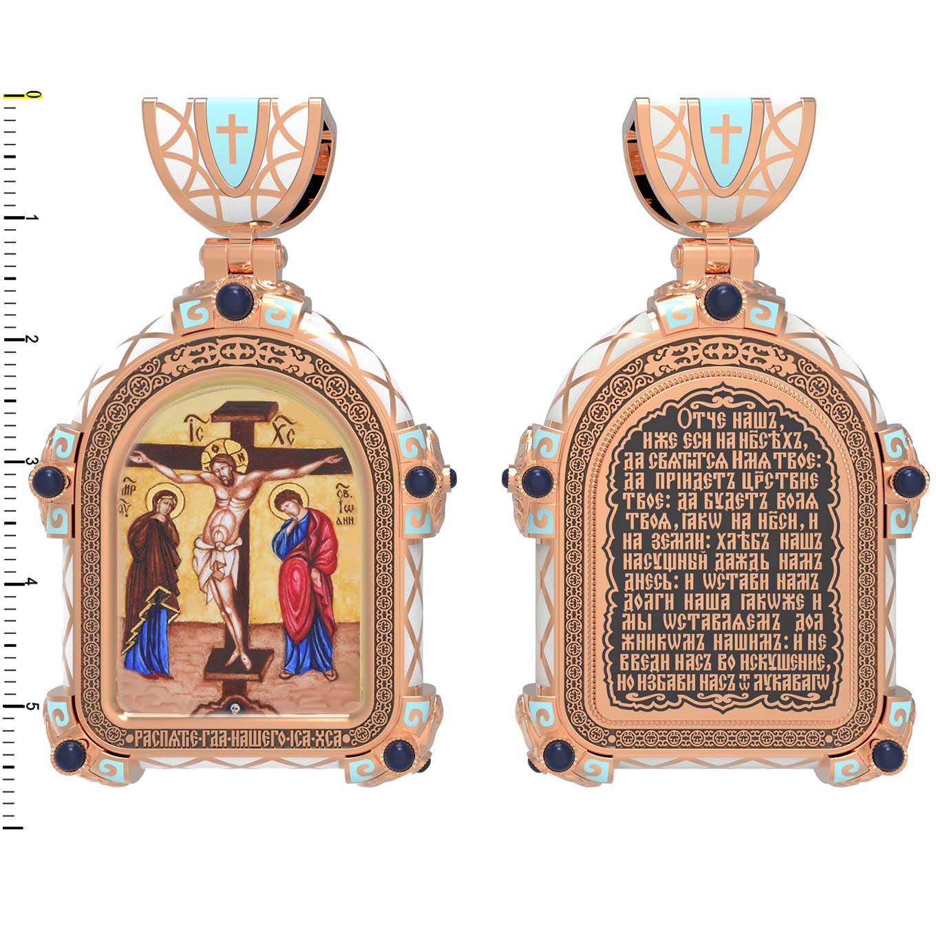 На лицевой стороне образка изображено Распятие Господа и Спасителя нашего Иисуса Христа. Своими крестными страданиями Господь смыл наши грехи, покрыл наш долг перед Богом или, на языке Писания, нас «искупил». В Голгофе сокрыта непостижимая тайна бесконечной правды и любви Бога. Крест стал символом победы добра над злом, жизни над смертью, напоминанием бесконечной Божьей любви, предметом радости. Воплотившийся Сын Божий Своею кровью освятил крест и сделал его проводником Своей благодати, источником освящения верующих. На верхней табличке, выше головы Иисуса, расположена надпись, составленная Понтием Пилатом — «IНЦI». Она означает «Иисус Назорей, Царь Иудейский». Ниже перекладины написано сокращенно имя Спасителя «IC» «XC» — Иисус Христос. Крест стоит на горе камней, символизирующих Голгофу. Под подножием Креста изображена покоящаяся голова (череп) Адама. Слева от Распятия стоят оплакивающие Господа Пресвятая Богородица и святая мироносица Мария Клеопова. Справа — апостол и евангелист Иоанн Богослов, один из ближайших учеников Иисуса Христа и сотник Лонгин с крестом в правой руке и копьем — в левой. По преданию, увидя, что они горько плачут, Иисус сказал Матери Своей: «Жено! Се сын Твой!» Потом сказал ученику Иоанну: «Се мати твоя». С этого времени Иоанн взял Матерь Божию к себе, и Она жила в его доме до самой смерти.