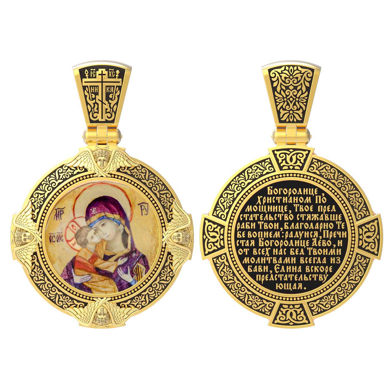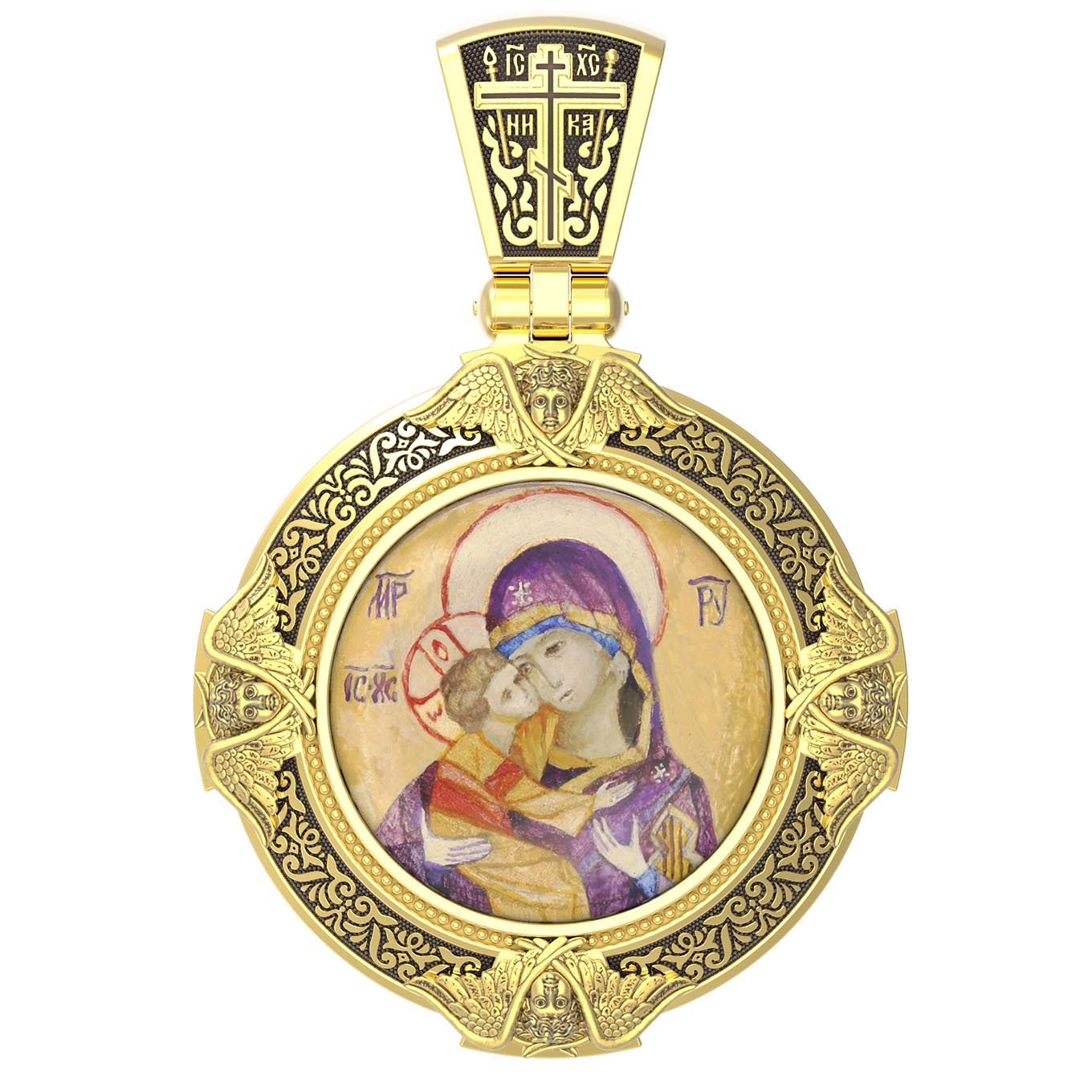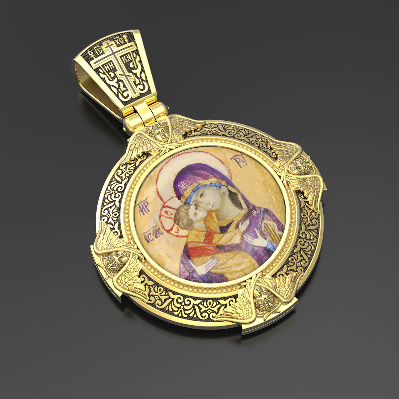 На лицевой стороне образка изображена Владимирская икона Божией Матери — одна из самых чтимых святынь Русской православной церкви. По преданию, икона была написана Святым апостолом и евангелистом Лукой во время земной жизни Богородицы. Дева Мария, увидев Свое изображение, молвила: «Отныне ублажат Мя вси роди. Благодать Рождшегося от Меня и Моя с сим образом да будет». Образ написан в лирическом иконографическом типе «Умиление». Младенец припал щекой к щеке Матери и тянется к ней правой рукой, другой нежно обнимая за шею. Икона вплоть до V века находилась в Иерусалиме, затем была перевезена в Византию. На Русь икона была привезена в 1131 г. За прошедшие столетия святыня неоднократно переезжала из Владимира в Москву и обратно, не раз спасая страну от захватчиков. Русская Православная Церковь установила троекратное празднование Владимирской иконе Божьей Матери. Каждый из дней празднования связан с избавлением русского народа от порабощения иноплеменниками по молитвам ко Пресвятой Богородице. В последующие века у иконы происходили многие важные исторические события: подписание актов, принятие присяги значимых государственных деятелей и возведение на престол. На кулонном кольце изображен Спас Нерукотворный — образ Господа и Спасителя нашего Иисуса Христа, чудесно отпечатавшийся на плате, котором Христос вытер свой лик.