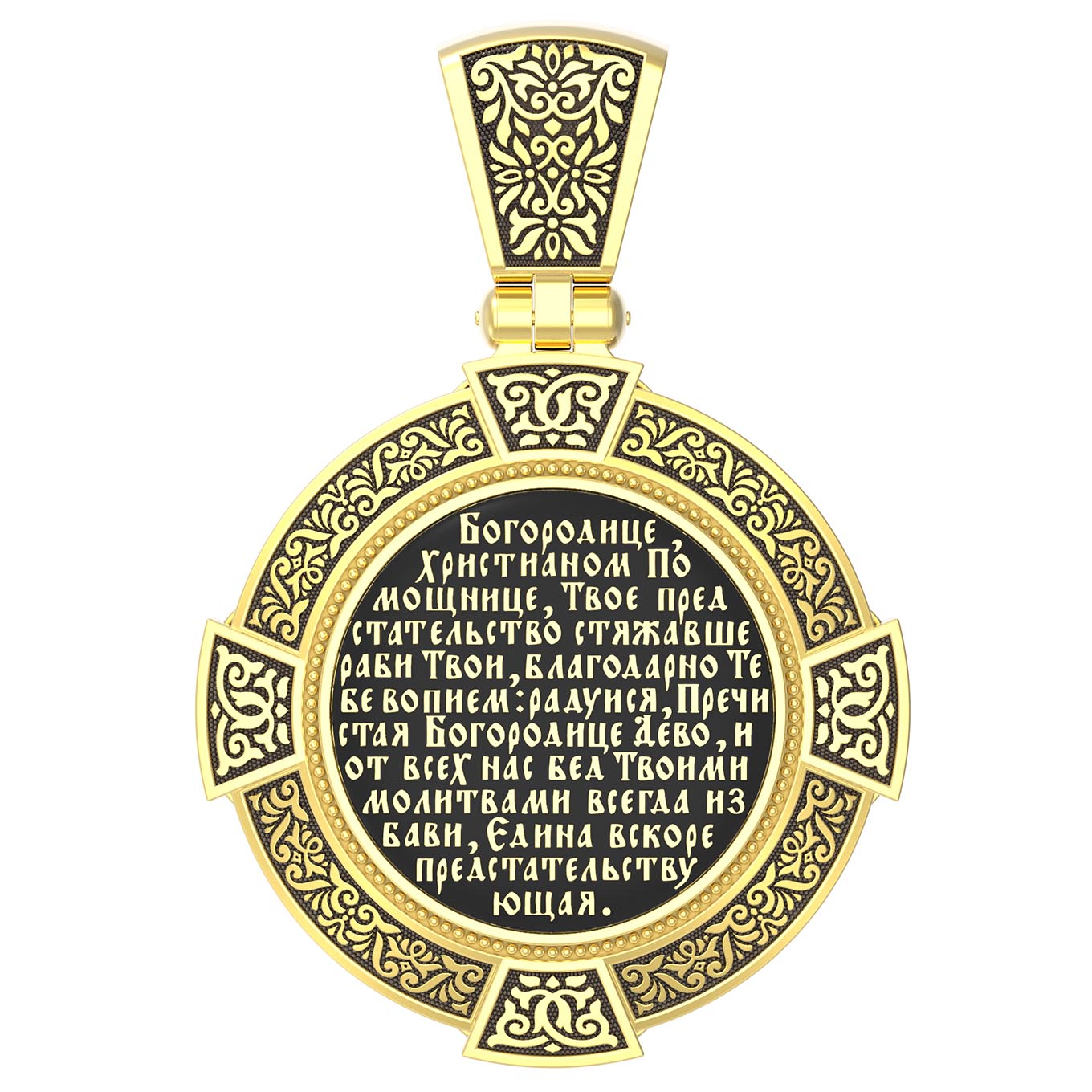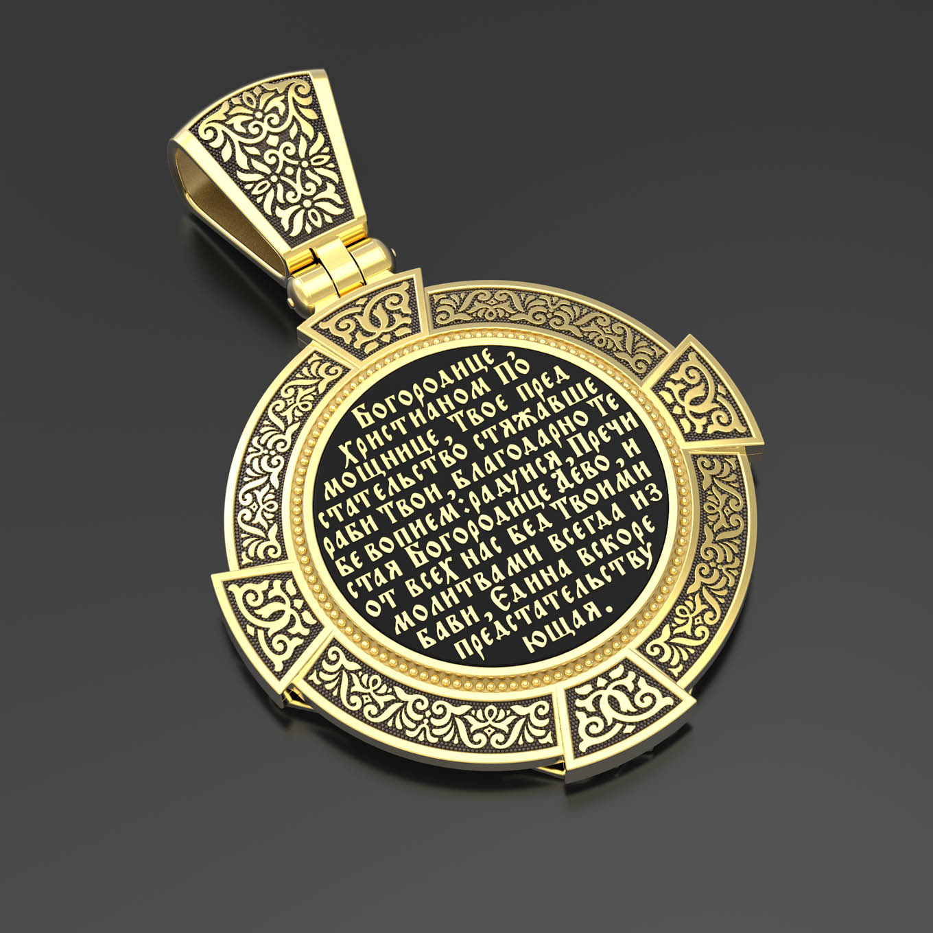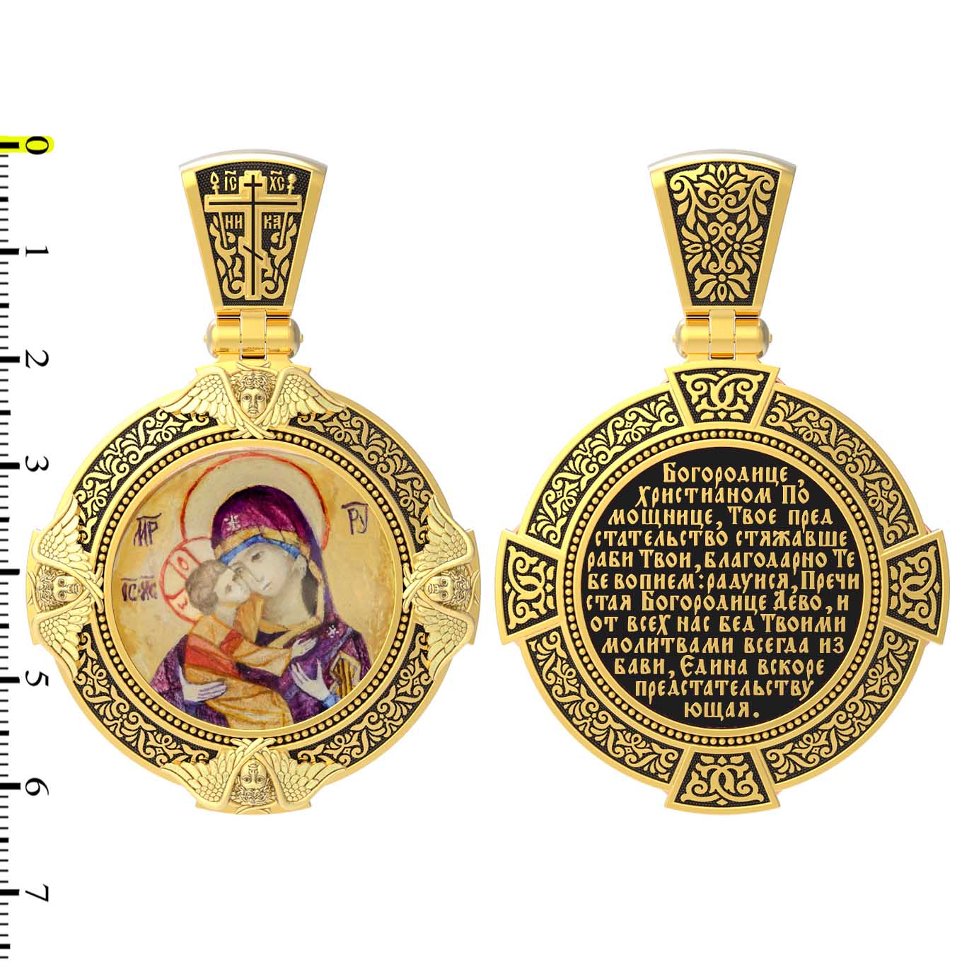 На лицевой стороне образка изображена Владимирская икона Божией Матери — одна из самых чтимых святынь Русской православной церкви. По преданию, икона была написана Святым апостолом и евангелистом Лукой во время земной жизни Богородицы. Дева Мария, увидев Свое изображение, молвила: «Отныне ублажат Мя вси роди. Благодать Рождшегося от Меня и Моя с сим образом да будет». Образ написан в лирическом иконографическом типе «Умиление». Младенец припал щекой к щеке Матери и тянется к ней правой рукой, другой нежно обнимая за шею. Икона вплоть до V века находилась в Иерусалиме, затем была перевезена в Византию. На Русь икона была привезена в 1131 г. За прошедшие столетия святыня неоднократно переезжала из Владимира в Москву и обратно, не раз спасая страну от захватчиков. Русская Православная Церковь установила троекратное празднование Владимирской иконе Божьей Матери. Каждый из дней празднования связан с избавлением русского народа от порабощения иноплеменниками по молитвам ко Пресвятой Богородице. В последующие века у иконы происходили многие важные исторические события: подписание актов, принятие присяги значимых государственных деятелей и возведение на престол. На кулонном кольце изображен Спас Нерукотворный — образ Господа и Спасителя нашего Иисуса Христа, чудесно отпечатавшийся на плате, котором Христос вытер свой лик.