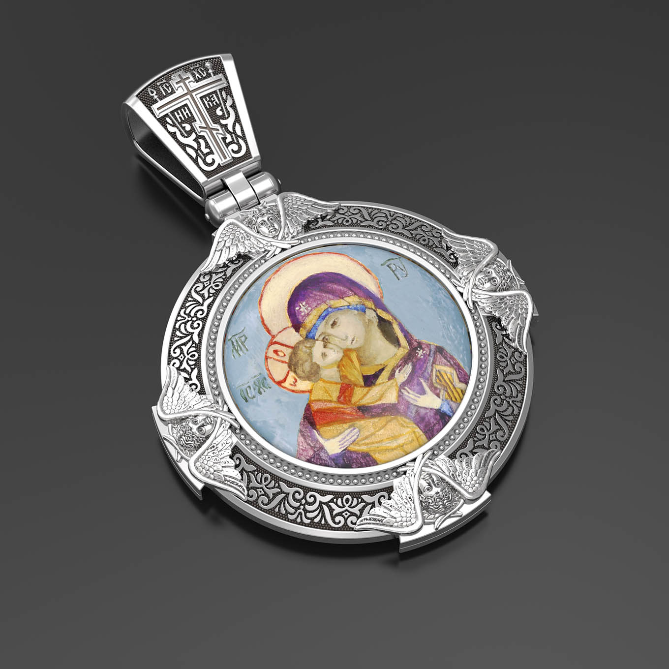 На лицевой стороне образка изображена Владимирская икона Божией Матери — одна из самых чтимых святынь Русской православной церкви. По преданию, икона была написана Святым апостолом и евангелистом Лукой во время земной жизни Богородицы. Дева Мария, увидев Свое изображение, молвила: «Отныне ублажат Мя вси роди. Благодать Рождшегося от Меня и Моя с сим образом да будет». Образ написан в лирическом иконографическом типе «Умиление». Младенец припал щекой к щеке Матери и тянется к ней правой рукой, другой нежно обнимая за шею. Икона вплоть до V века находилась в Иерусалиме, затем была перевезена в Византию. На Русь икона была привезена в 1131 г. За прошедшие столетия святыня неоднократно переезжала из Владимира в Москву и обратно, не раз спасая страну от захватчиков. Русская Православная Церковь установила троекратное празднование Владимирской иконе Божьей Матери. Каждый из дней празднования связан с избавлением русского народа от порабощения иноплеменниками по молитвам ко Пресвятой Богородице. В последующие века у иконы происходили многие важные исторические события: подписание актов, принятие присяги значимых государственных деятелей и возведение на престол. На кулонном кольце изображен Спас Нерукотворный — образ Господа и Спасителя нашего Иисуса Христа, чудесно отпечатавшийся на плате, котором Христос вытер свой лик.