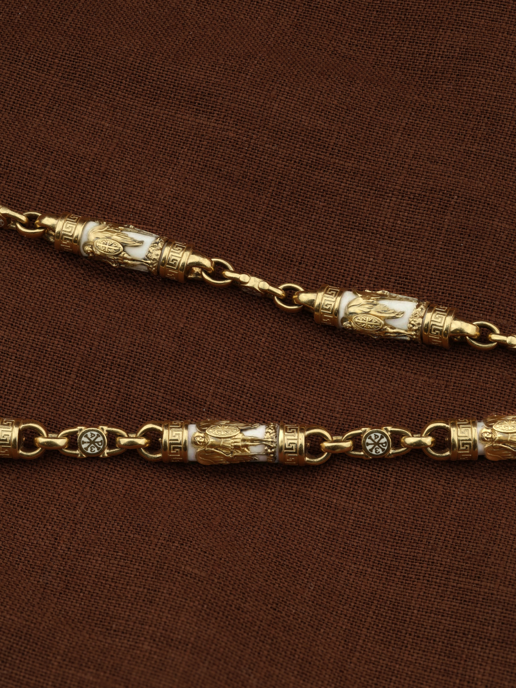 На звеньях цепи изображена Хризма — монограмма имени Христа, которая состоит из двух начальных греческих букв имени  — Х (хи) и Р (ро), скрещённых между собой. По краям монограммы помещены греческие буквы a и w. Такое употребление этих букв восходит к тексту Апокалипсиса: «Аз есмь Альфа и Омега, начало и конец, говорит Господь, Который есть и был и грядет, Вседержитель.» (Откр. 1:8; см. также Откр. 22:13). Также на звеньях изображен Святой Ангел-Хранитель в виде прекрасного юноши держащего в правой руке мечь, а в левой — щит. Ангел-Хранитель — это Ангел приставляемый Богом к человеку при крещении для охраны и помощи в добрых делах. Он невидимо находится при человеке на протяжении всей его жизни, если человек сохраняет в себе любовь к Богу и истинную веру перед Ним. Ангел-Xранитель делают для нас все, что служит к истинному нашему благу и спасению. Невидимо пребывая при нас постоянно, он, руководствуя нас ко спасению, не только по нашему желанию таинственно наставляет нас на все доброе и полезное, не только возносит наши молитвы к Богу, но еще и сам от себя охраняют и защищают нас от врагов видимых и невидимых и ходатайствует за нас пред Богом. Ангел-Хранитель так любит нас, как никто на земле любить не может. Одного лишь каждому из нас он желает — спасения души; к этому он направляет все свои заботы. И если видит нас также заботящимися о спасении, радуется, если же видит нас пребывающими в нерадении о душе своей, скорбит. Но и самый великий грешник может примириться со своим Ангелом-Хранителем посредством искреннего раскаяния в грехах и оставления их навсегда. В таком случае, по слову Писания, великая радость бывает для всех ангелов на небесах (Лк. 15:10). Цепь украшена орнаментом.