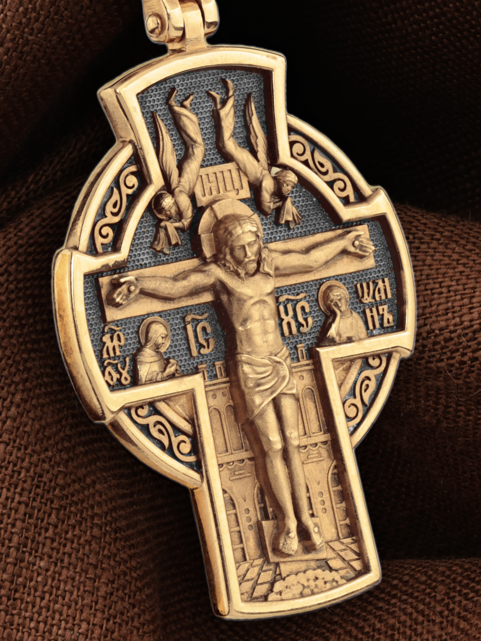 На лицевой стороне креста изображено Распятие Господа и Спасителя нашего Иисуса Христа, отдавшего Себя на смерть, для искупления грехов мира. Крест является символом жертвенной любви всеблагого Бога к падшим людям, всепобеждающим духовным оружием христиан, основанием и средоточием церковной жизни. Верхняя перекладина символизирует титло — табличку, на которой, согласно Евангелию, было начертано: Иисус Назорей Царь Иудейский (IНЦI). Надпись «IC» «ХC», означает Иисус Христос, помещается ниже поперечной перекладины креста. Слева от Распятия изображена Пресвятая Богородица, справа — апостол и евангелист Иоанн Богослов, один из ближайших учеников Иисуса Христа. За крестом высится Иерусалимская стена, в знак того, что Господь был распят вне стен города. Возвышение, на котором стоит Крест, символизирует гору Голгофу, на которой произошло Распятие. На кулонном кольце изображен Нерукотворный образ Господа и Спасителя нашего Иисуса Христа, чудесно отпечатавшийся на плате, которым Христос вытер свой лик.