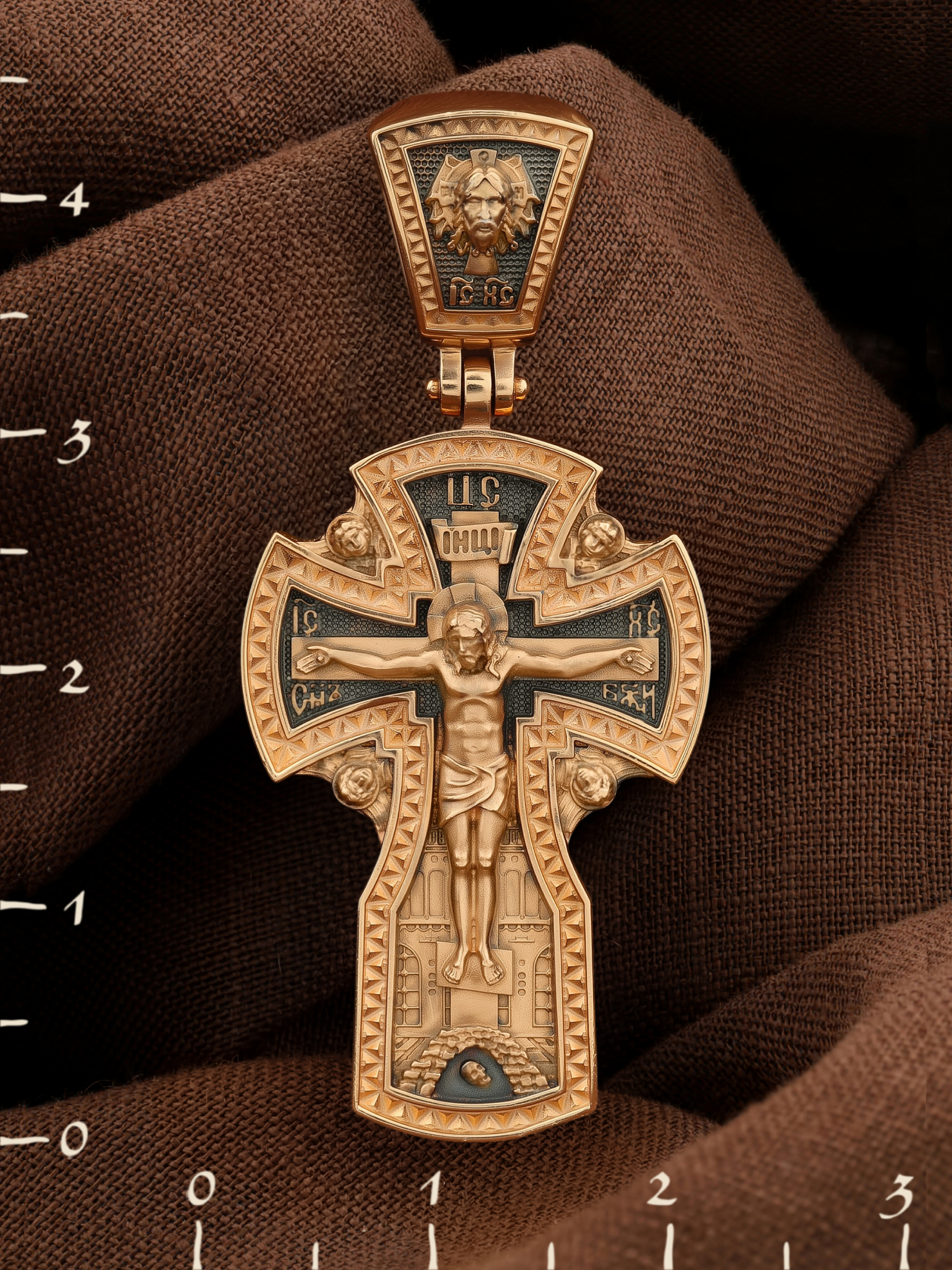 На лицевой стороне креста изображено Распятие Господа и Спасителя нашего Иисуса Христа, отдавшего Себя на смерть, для искупления грехов мира. Крест является символом жертвенной любви Всеблагого Бога к падшим людям, всепобеждающим духовным оружием христиан, основанием и средоточием церковной жизни. Господь сказал: кто хочет идти за Мною, отвергнись себя, и возьми крест свой, и следуй за Мною. (Мк. 8: 34). Над Распятием помещена надпись «Царь Славы». На верхней табличке, выше головы Иисуса, расположена надпись, составленная Понтием Пилатом — «IНЦI». Она означает «Иисус Назорей, Царь Иудейский». Надпись «IC» «ХC», означает Иисус Христос, помещается на разных сторонах поперечной перекладины креста. Рядом расположена надпись «Сын Божий». За крестом высится Иерусалимская стена, в знак того, что Господь был распят вне стен города. Возвышение, на котором стоит Крест, символизирует гору Голгофу, на которой произошло Распятие. Под подножием Креста изображена покоящаяся голова (череп) Адама. На кулонном кольце изображен Нерукотворный образ Господа и Спасителя нашего Иисуса Христа, чудесно отпечатавшийся на плате, которым Христос вытер свой лик.
