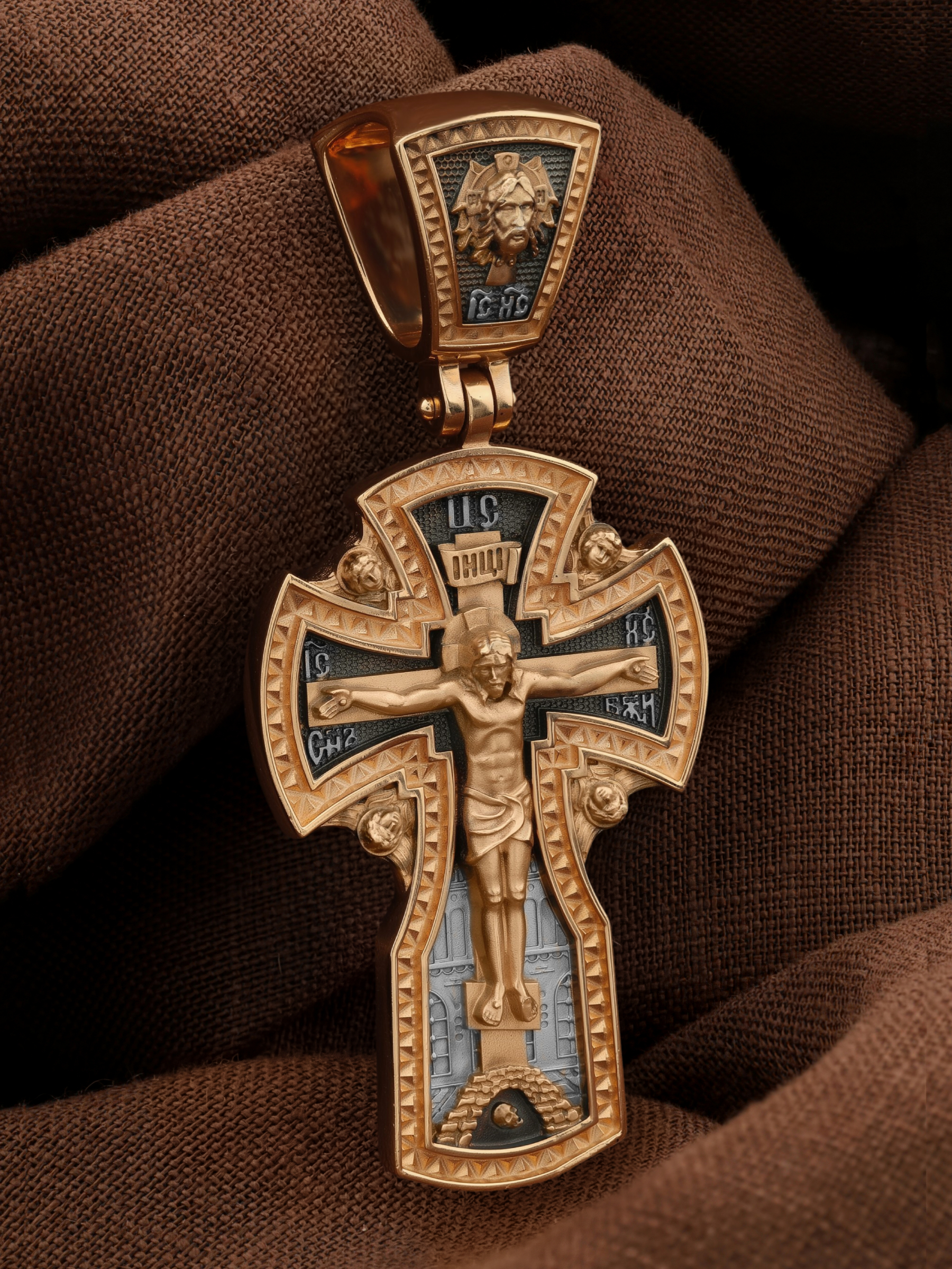 На лицевой стороне креста изображено Распятие Господа и Спасителя нашего Иисуса Христа, отдавшего Себя на смерть, для искупления грехов мира. Крест является символом жертвенной любви Всеблагого Бога к падшим людям, всепобеждающим духовным оружием христиан, основанием и средоточием церковной жизни. Господь сказал: кто хочет идти за Мною, отвергнись себя, и возьми крест свой, и следуй за Мною. (Мк. 8: 34). Над Распятием помещена надпись «Царь Славы». На верхней табличке, выше головы Иисуса, расположена надпись, составленная Понтием Пилатом — «IНЦI». Она означает «Иисус Назорей, Царь Иудейский». Надпись «IC» «ХC», означает Иисус Христос, помещается на разных сторонах поперечной перекладины креста. Рядом расположена надпись «Сын Божий». За крестом высится Иерусалимская стена, в знак того, что Господь был распят вне стен города. Возвышение, на котором стоит Крест, символизирует гору Голгофу, на которой произошло Распятие. Под подножием Креста изображена покоящаяся голова (череп) Адама. На кулонном кольце изображен Нерукотворный образ Господа и Спасителя нашего Иисуса Христа, чудесно отпечатавшийся на плате, которым Христос вытер свой лик.