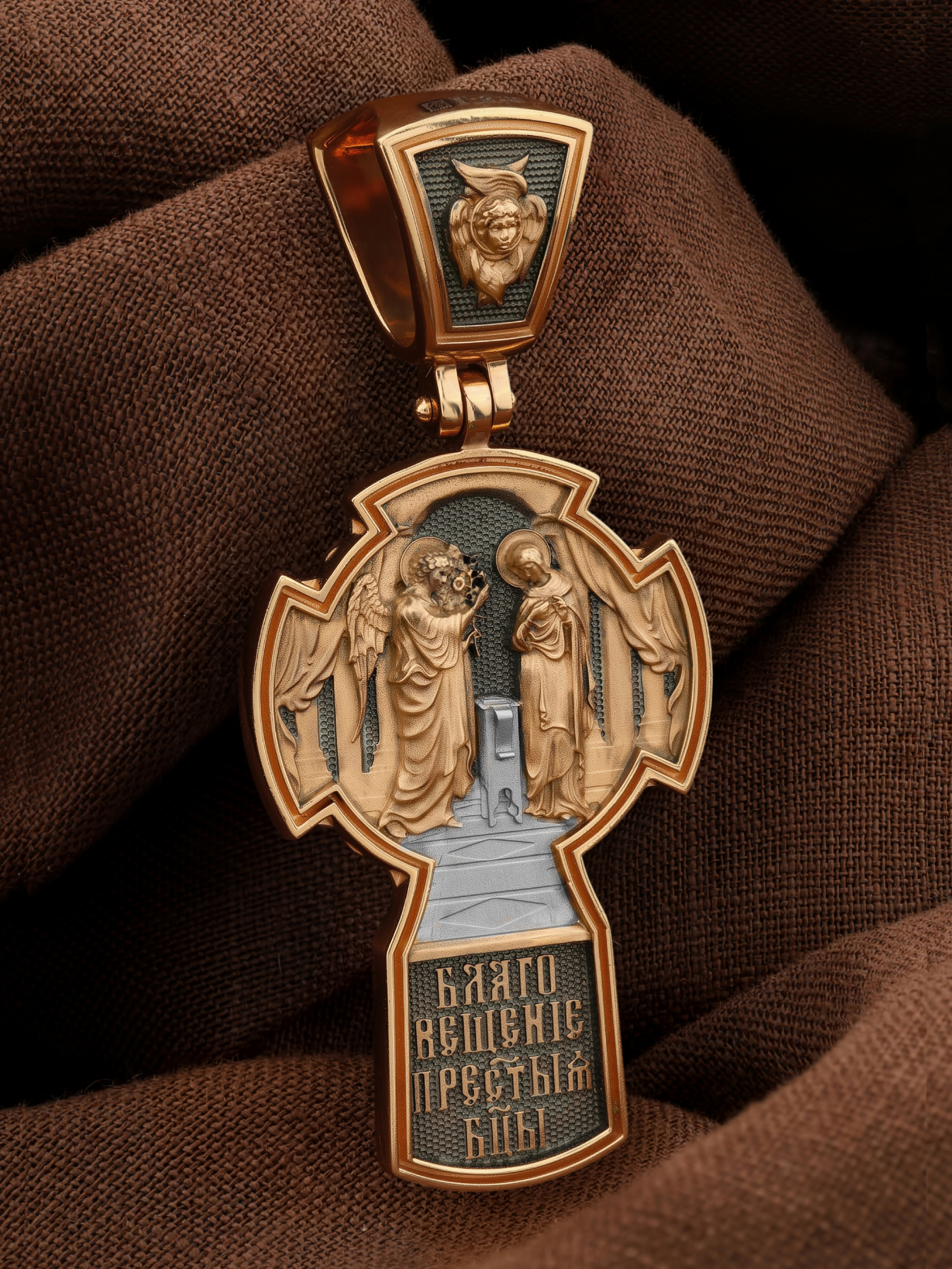 На оборотной стороне креста изображена икона «Благовещение Пресвятой Богородицы». Как нам повествует Священное Писание, Архангел Гавриил послан был от Бога в город Назарет к Пресвятой Деве Марии с радостной вестью, что Господь избрал Ее быть Матерью Спасителя мира. Ангел сказал: «Радуйся благодатная! Господь с Тобою! Благословенна Ты между женами». Мария cмутилась от слов Ангела и думала: что значит это приветствие? Ангел же продолжал говорить Ей: «не бойся, Мария, ибо Ты обрела благодать у Бога. И вот, Ты родишь Сына и наречешь имя Ему Иисус. Он будет велик, и назовется сыном Всевышнего, и Царству Его не будет конца…» На кулонном кольце изображен Ангел Серафим.