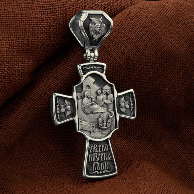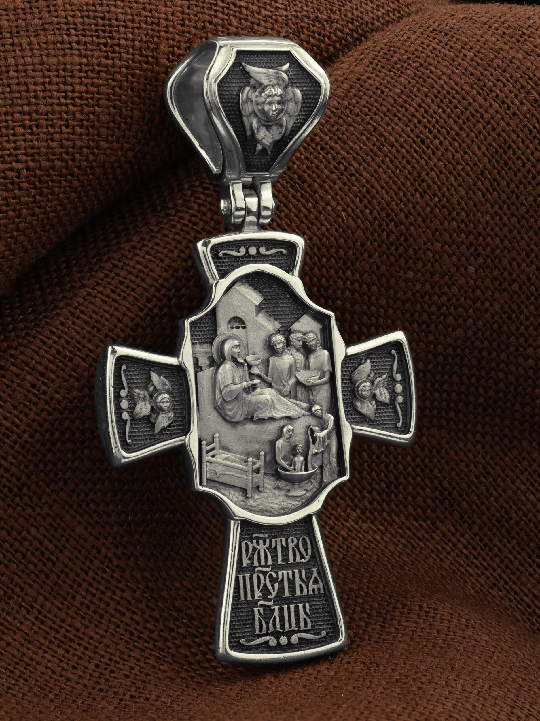 На оборотной стороне креста изображена икона Рождество Пресвятой Богородицы. Согласно церковному Преданию, Пресвятая Дева Мария родилась в небольшом галилейском городе Назарете. Родителями Её были праведные Иоаким и Анна. Супруги были бездетны, но не теряли надежды, что Господь может разрешить неплодство Анны даже в её преклонном возрасте. Они горячо молились и просили Господа даровать им дитя, которое обещали посвятить Богу для служения в храме. И Господь услышал их молитвы: Праведная Анна зачала и разрешилась дочерью Марией — будущей Пресвятой Богородицей. На кулонном кольце изображен шестикрылый Ангел — Серафим.