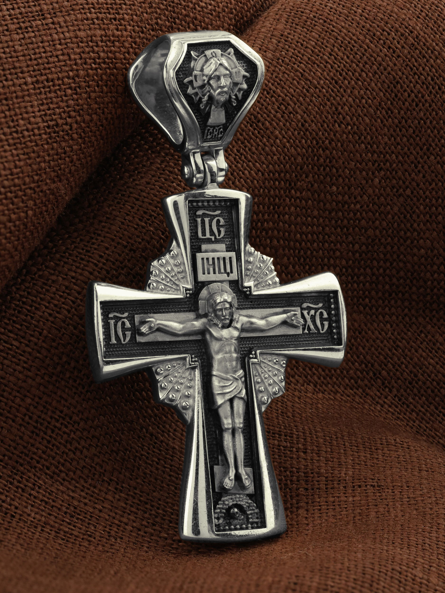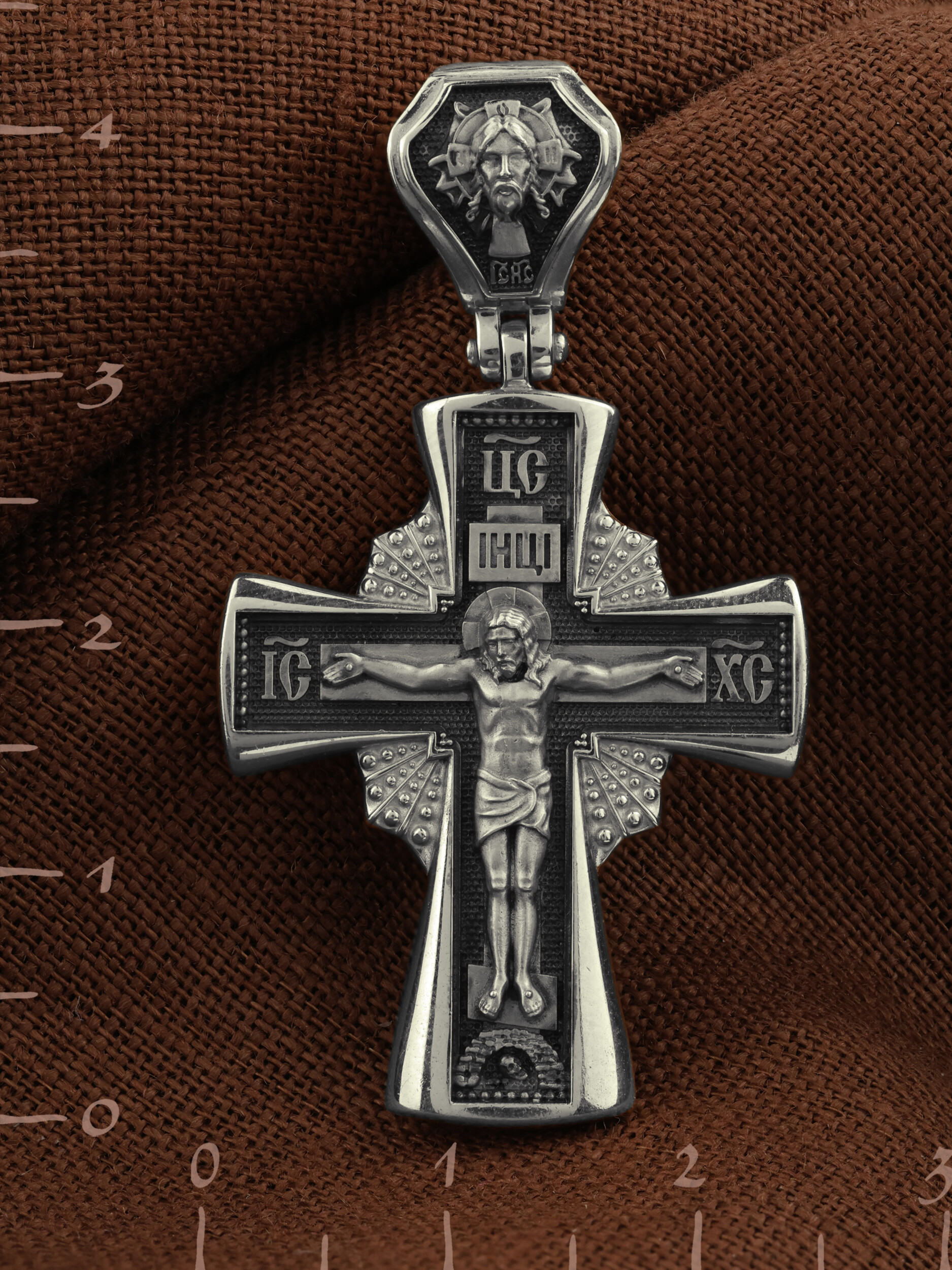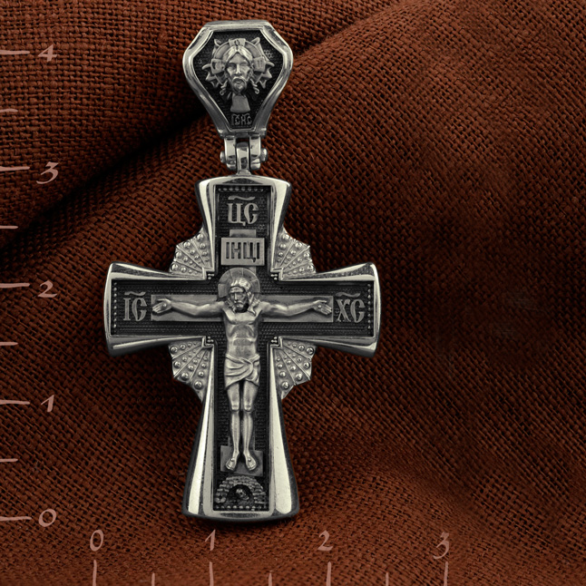 На лицевой стороне креста изображено Распятие Господа и Спасителя нашего Иисуса Христа, отдавшего Себя на смерть, для искупления грехов мира. Крест является символом жертвенной любви Всеблагого Бога к падшим людям, всепобеждающим духовным оружием христиан, основанием и средоточием церковной жизни. Господь сказал: кто хочет идти за Мною, отвергнись себя, и возьми крест свой, и следуй за Мною. (Мк. 8: 34). Над Распятием помещена надпись «Царь Славы». На верхней табличке, выше головы Иисуса, расположена надпись, составленная Понтием Пилатом — «IНЦI». Она означает «Иисус Назорей, Царь Иудейский». Надпись «IC» «ХC», означает Иисус Христос, помещается на разных сторонах поперечной перекладины креста. Возвышение, на котором стоит Крест, символизирует гору Голгофу, на которой произошло Распятие. Под подножием Креста изображена покоящаяся голова (череп) Адама. На кулонном кольце изображен Нерукотворный образ Господа и Спасителя нашего Иисуса Христа, чудесно отпечатавшийся на плате, которым Христос вытер свой лик. Ниже надпись — «IC» «ХC».